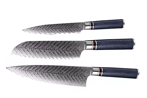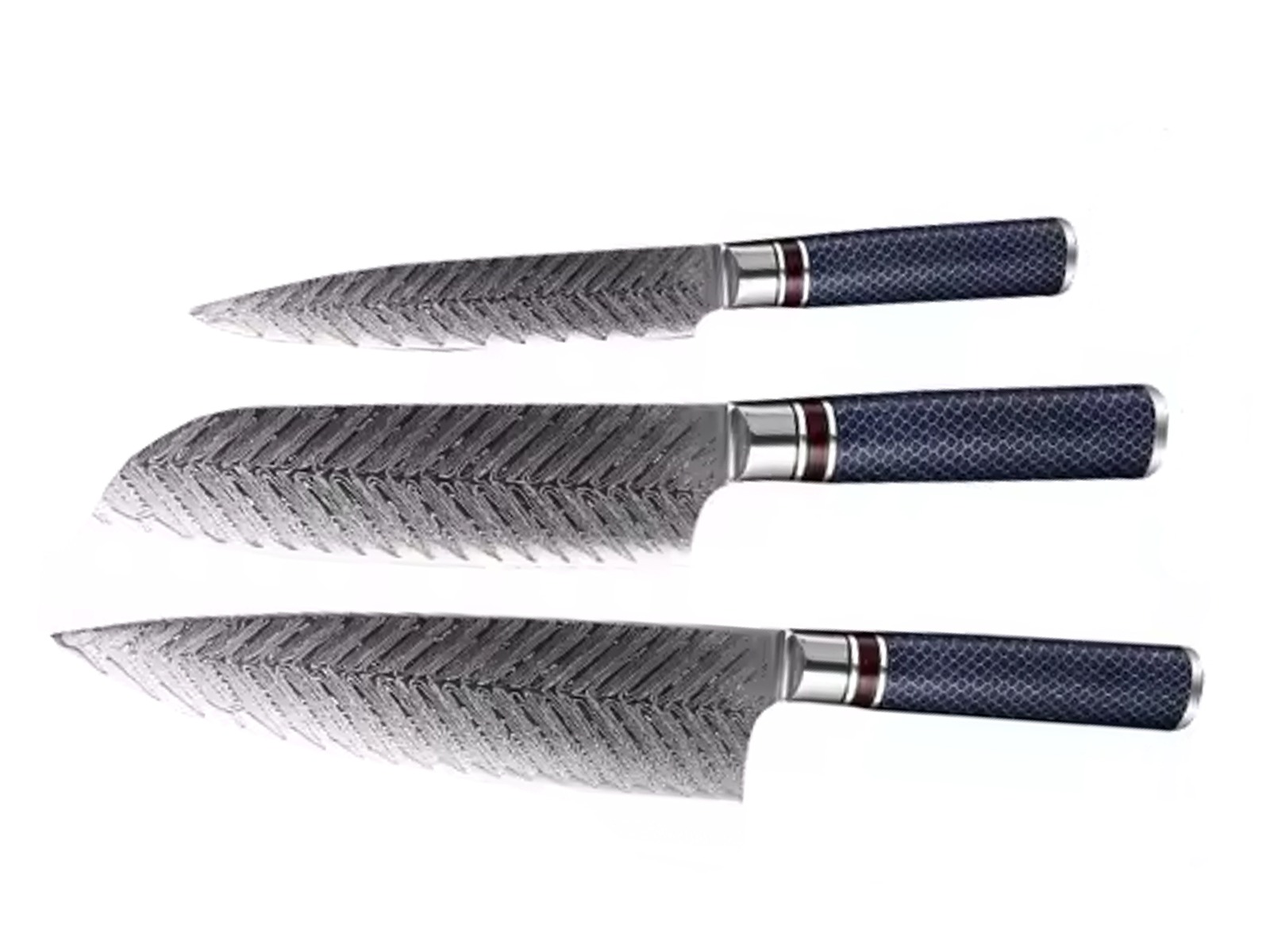 Køkkenknivsæt udført i 67 lags Damaskus stål. Kokkekniv, santokukniv og utilitykniv. Knivblad 13-20 cm, super skarpe og holdbare. Skæfter af resin. Ubrugte i gaveæske. Modelfoto