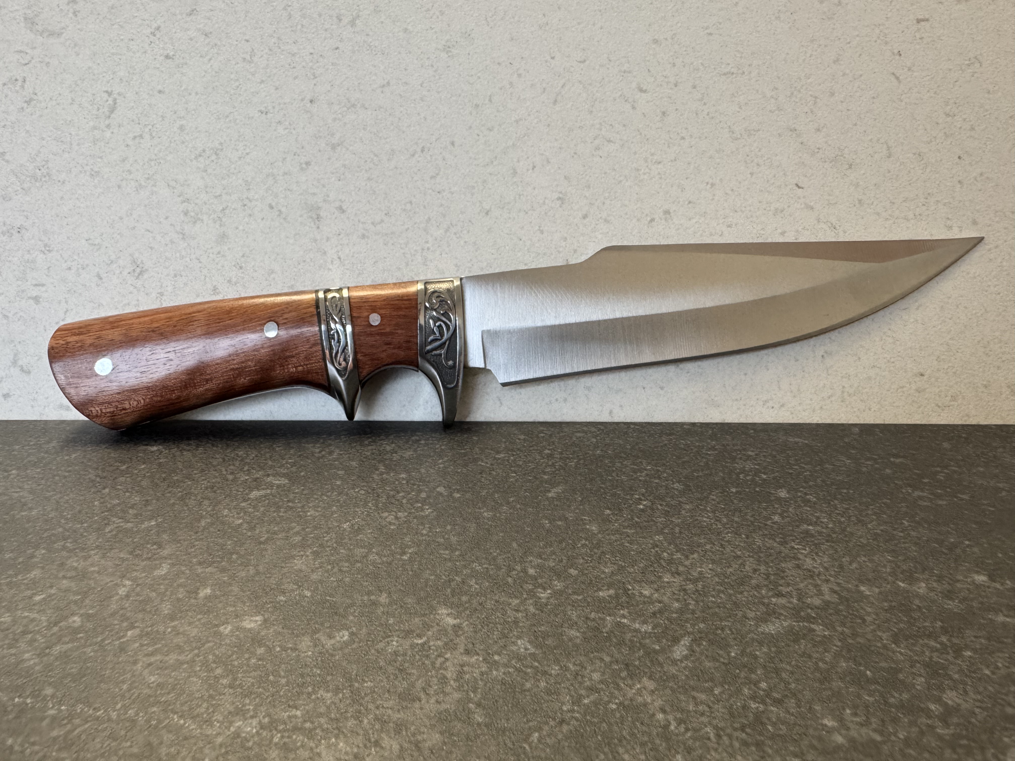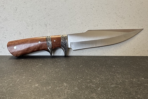 Jagt- & friluftskniv – detaljeret skæfte i rosentræ og stål