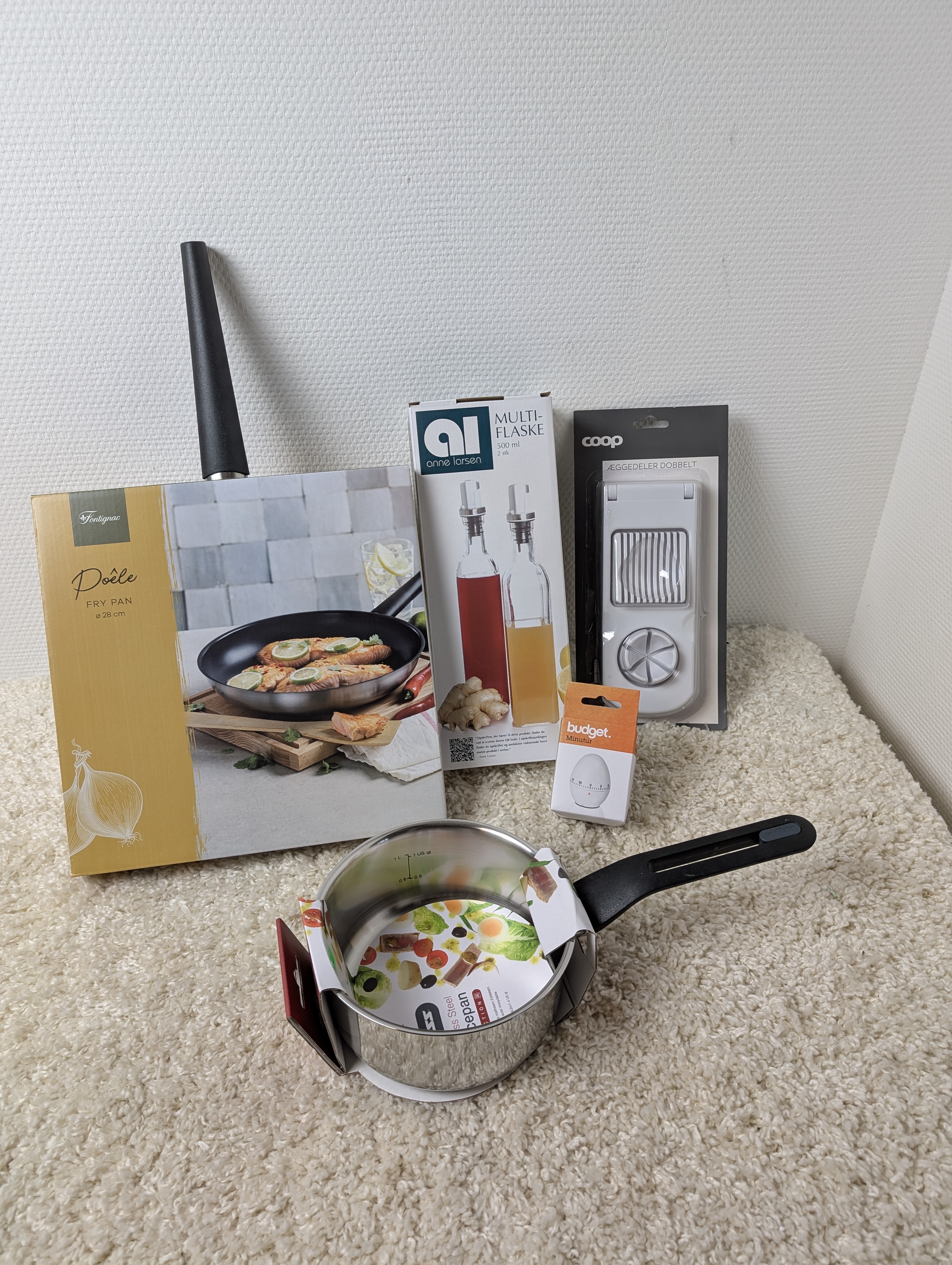 Stegepande/kasserolle/multiflaske/æggedeler/minuteur