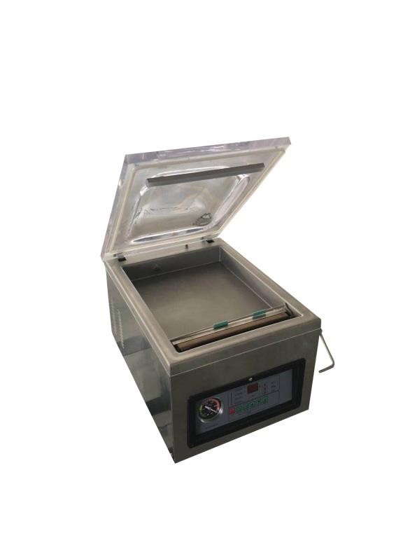 Professionel vakuumpakker udført i rustfri stål. Flere justerings muligheder efter behov. Maskinen måler 495 x 360 x 420 mm med en svejsebjælke på 255 x 8 mm.