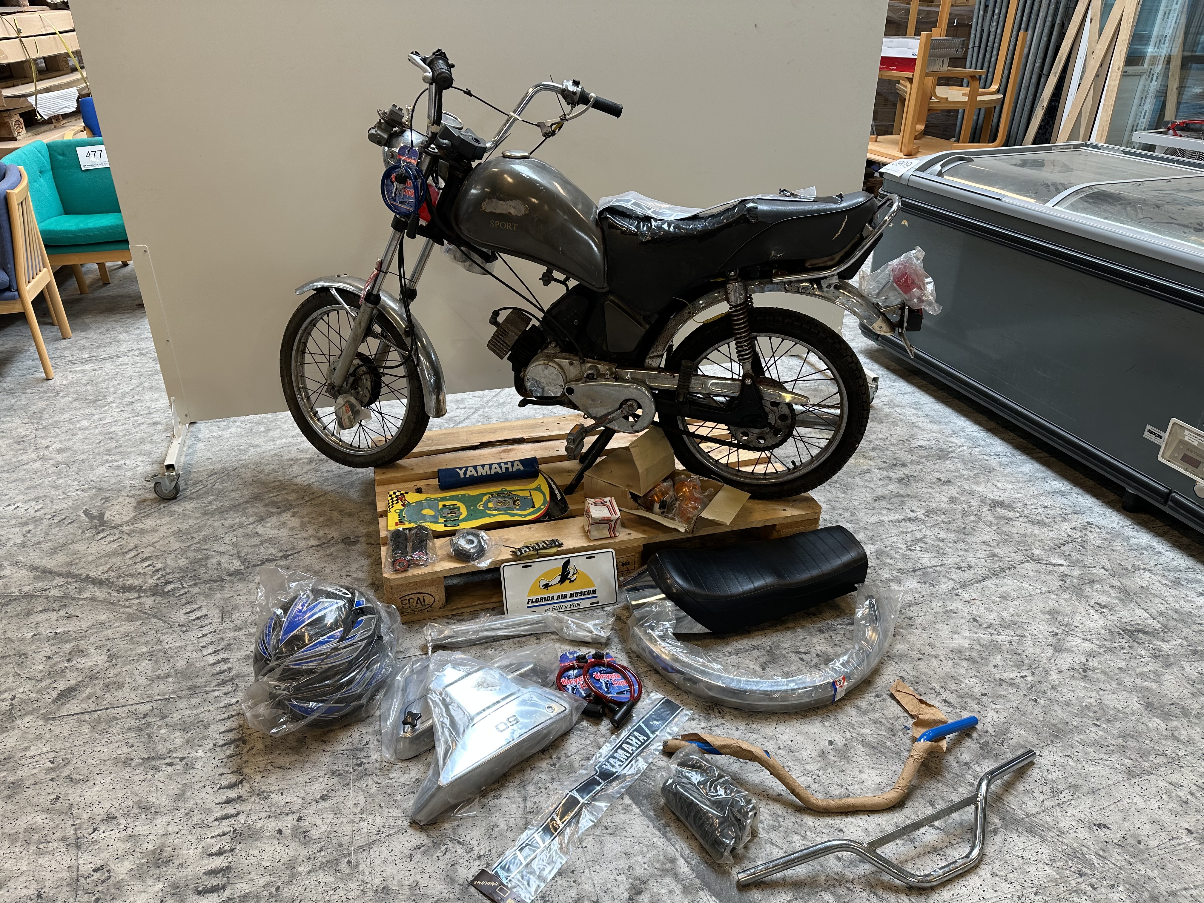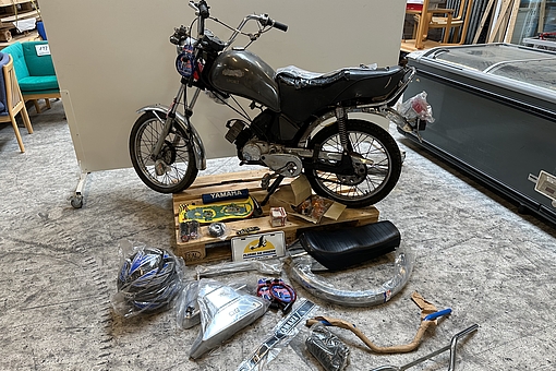 Fra kataloget kan nævnes: Yamaha 4 gears med masser af dele, SCO el-cykel og 10 stk. prispistoler.