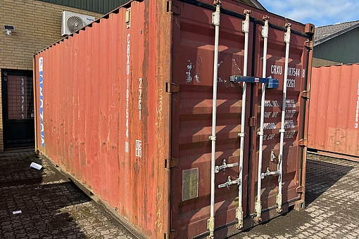 Containeren er placeret udendørs på en jævnt belægning og kan inspiceres på forhånd. Ideel til lager, byggeprojekter eller kreative løsninger.