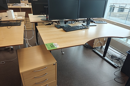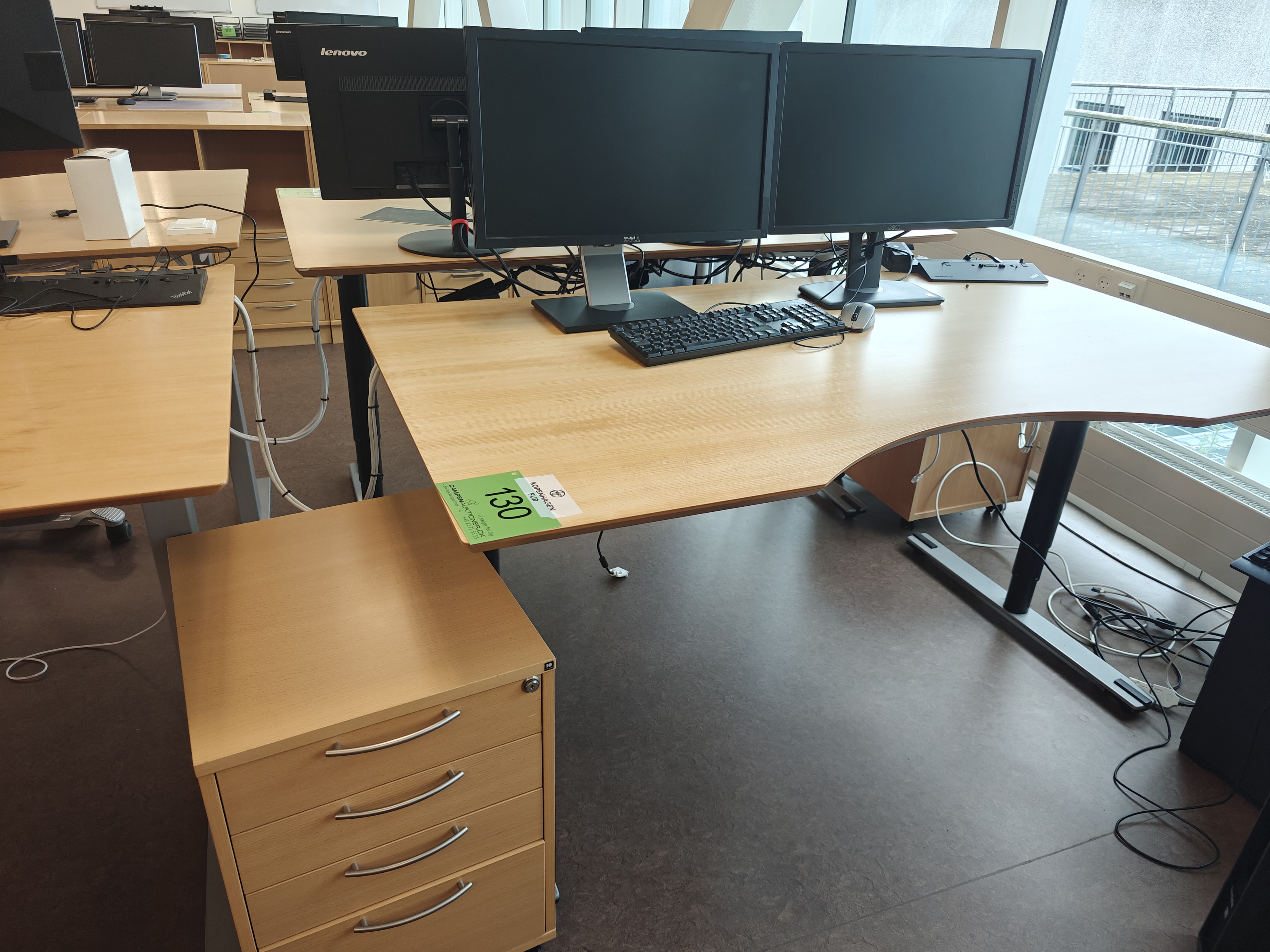 130. Hæve-/sænkeskrivebord, 2 skærme, tastatur, kontorkassette mm.