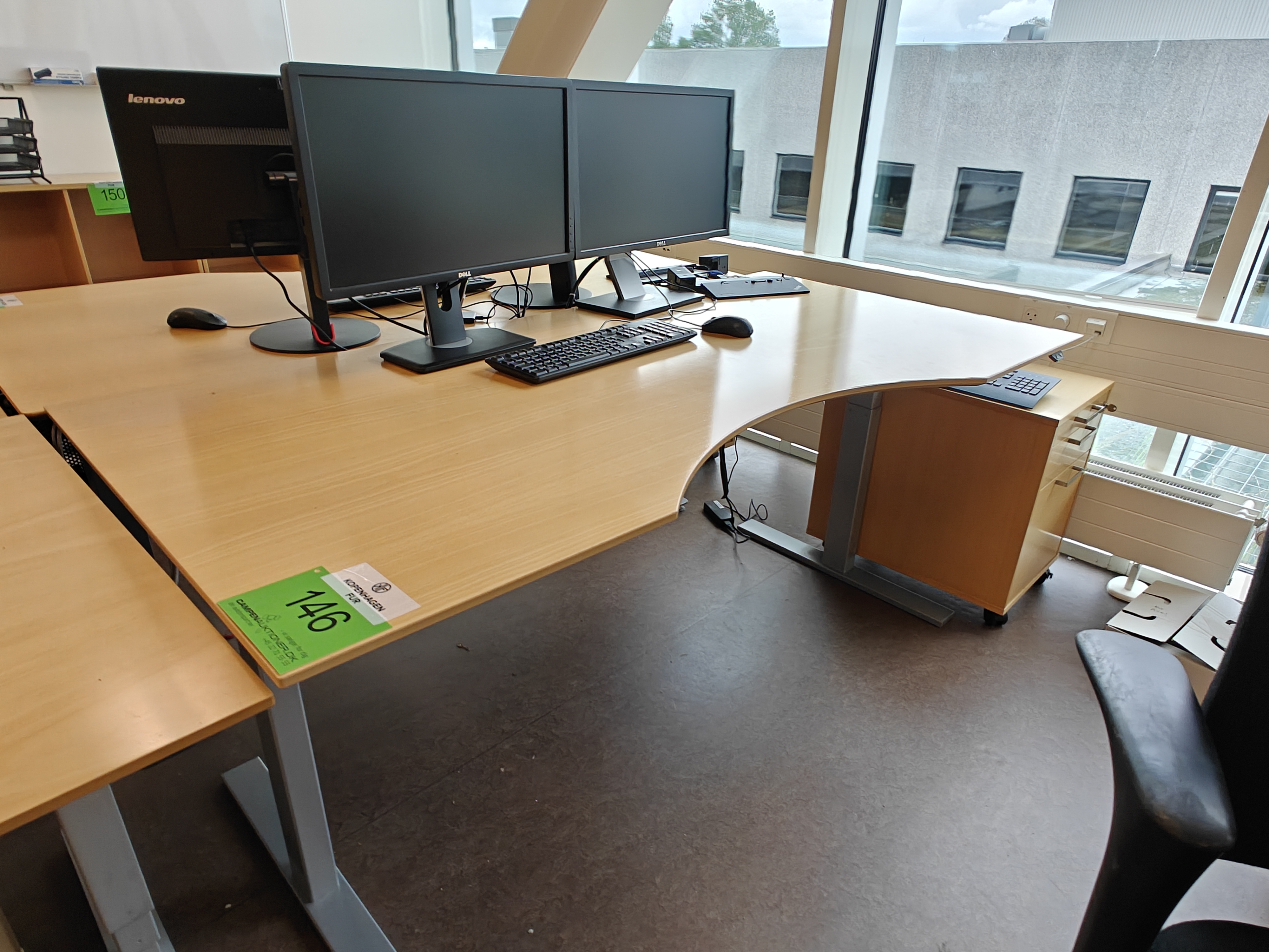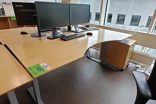 146. Hæve-/sænkeskrivebord, 2 skærme, tastatur, kontorkassette mm.