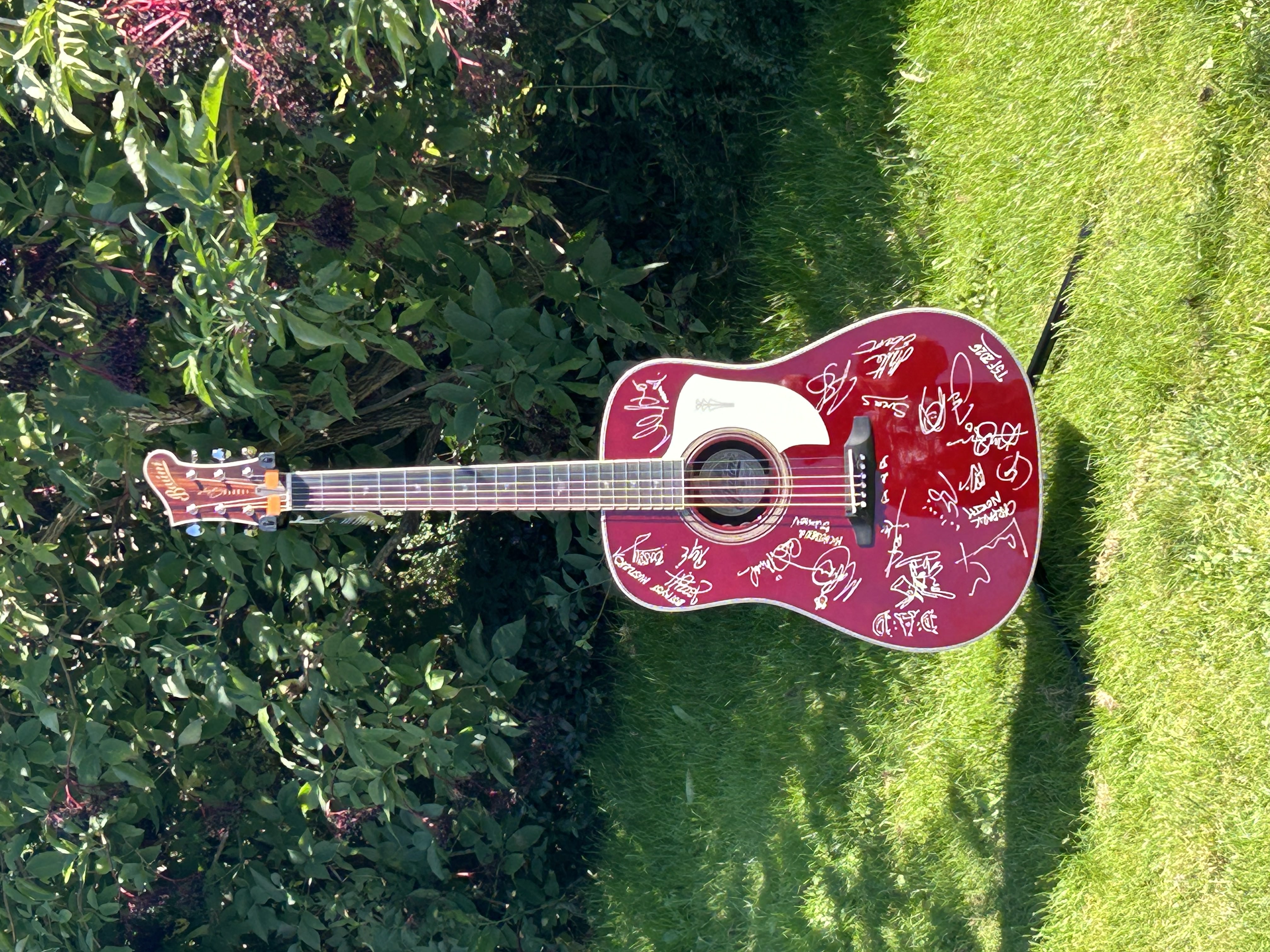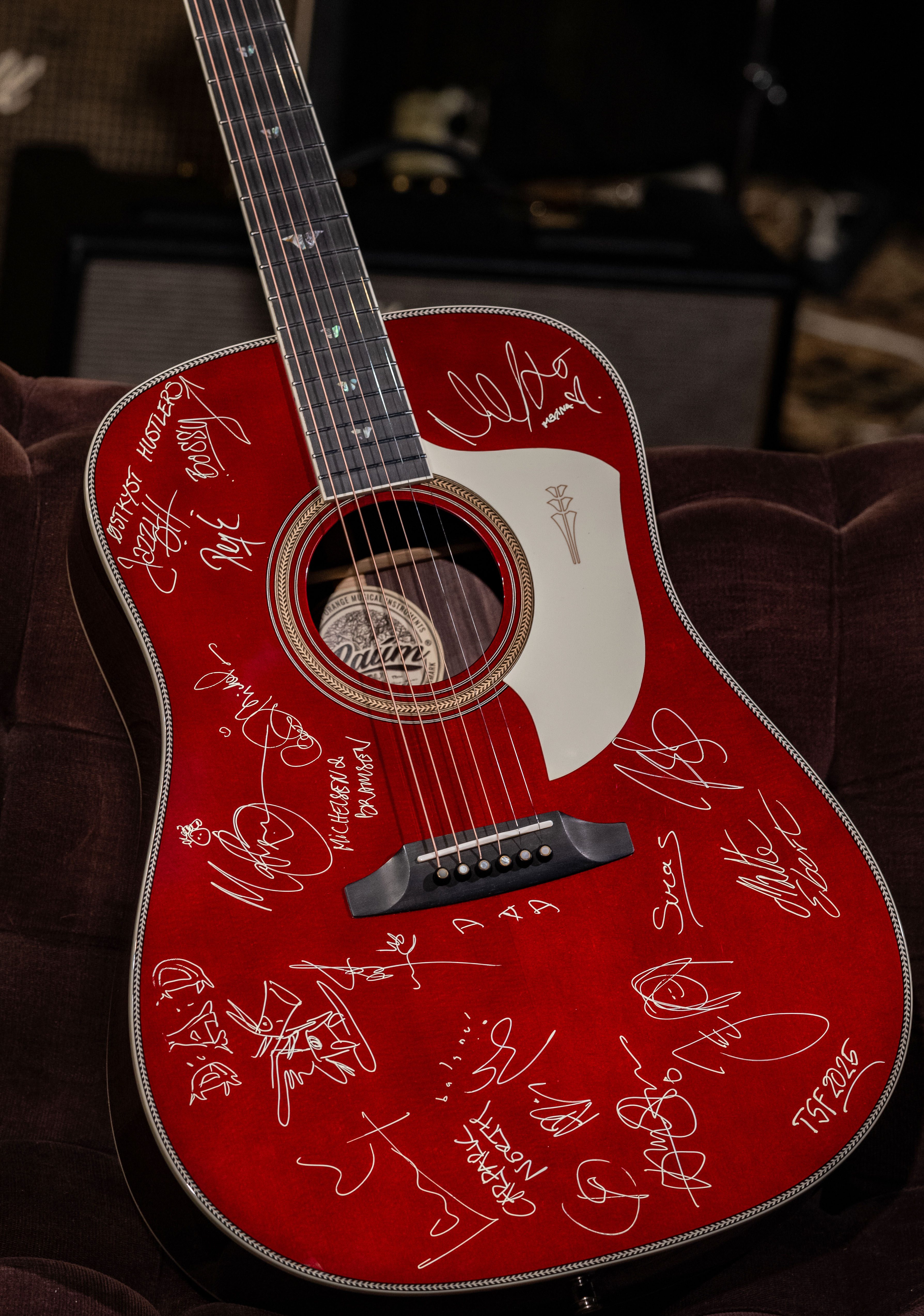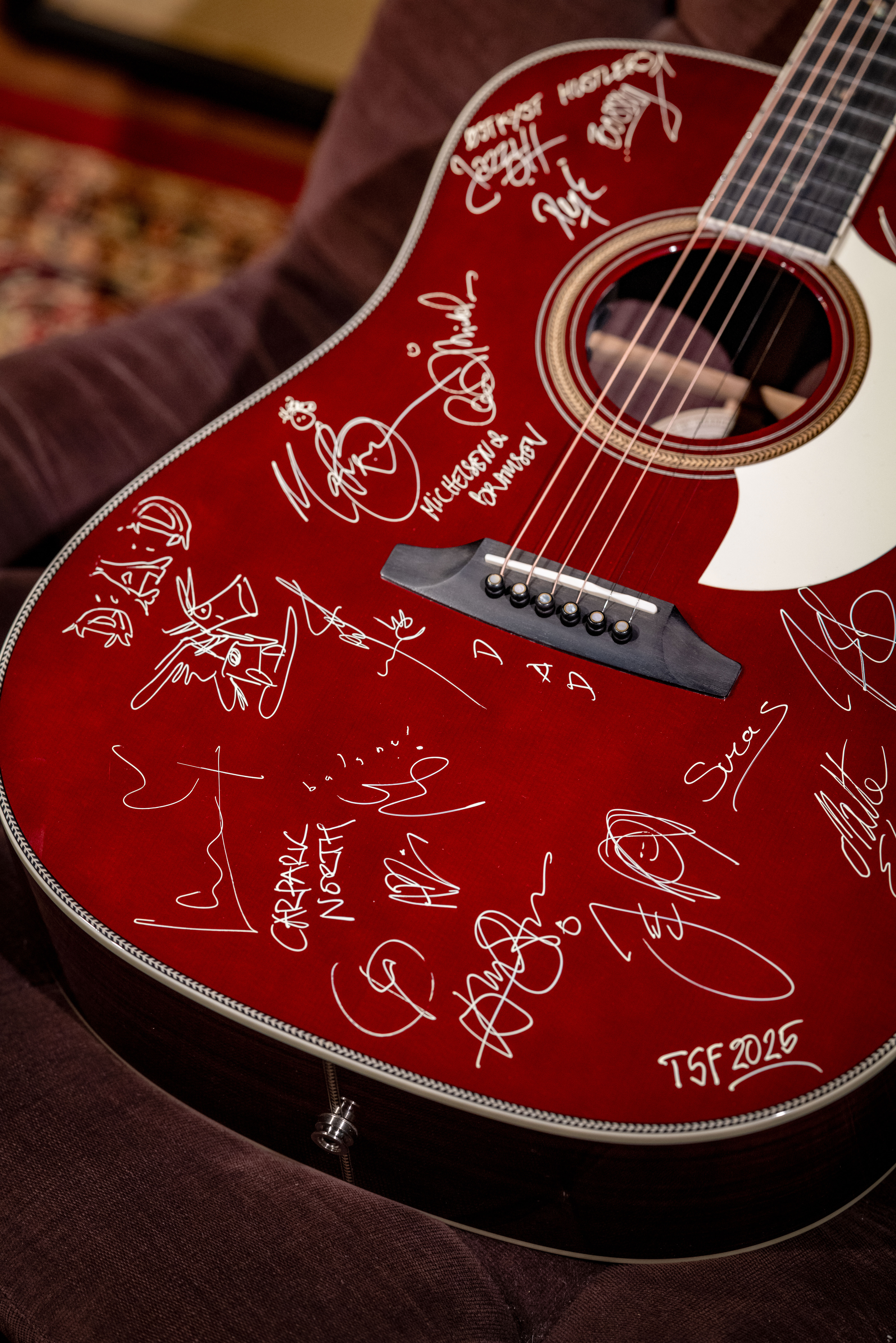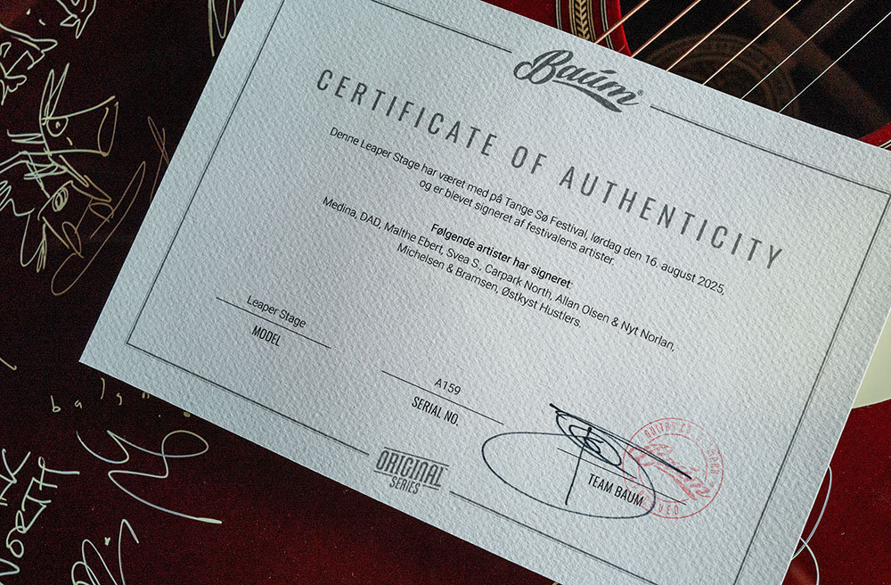 Guitaren doneres af Tange Sø Festival i samarbejde med danske Baum Guitars. Der er tale om modellen Leaper Stage i en Deep Burgundy Red. Den vil under festivalen vil blive signeret af artister, der optræder på årets festival.