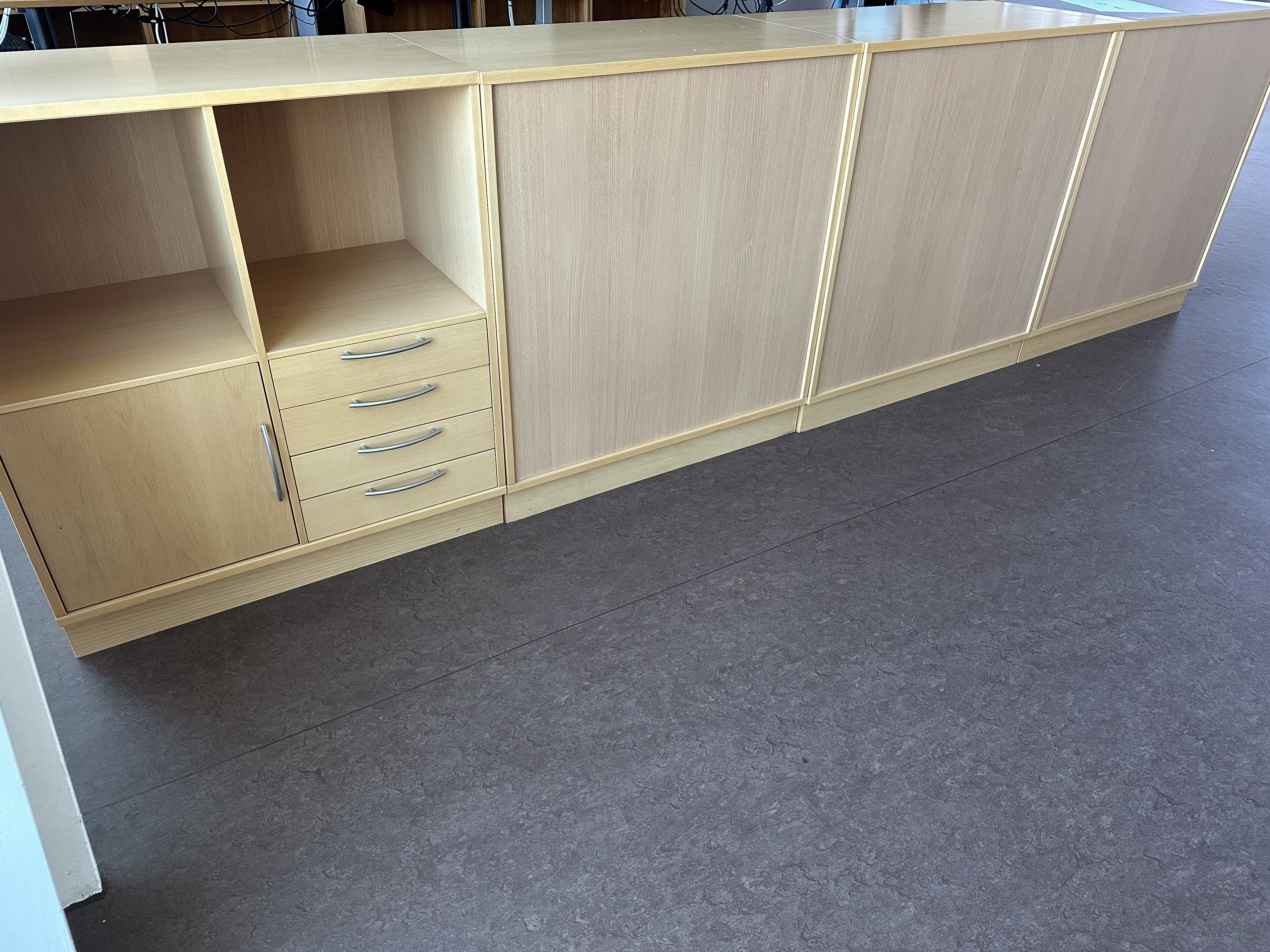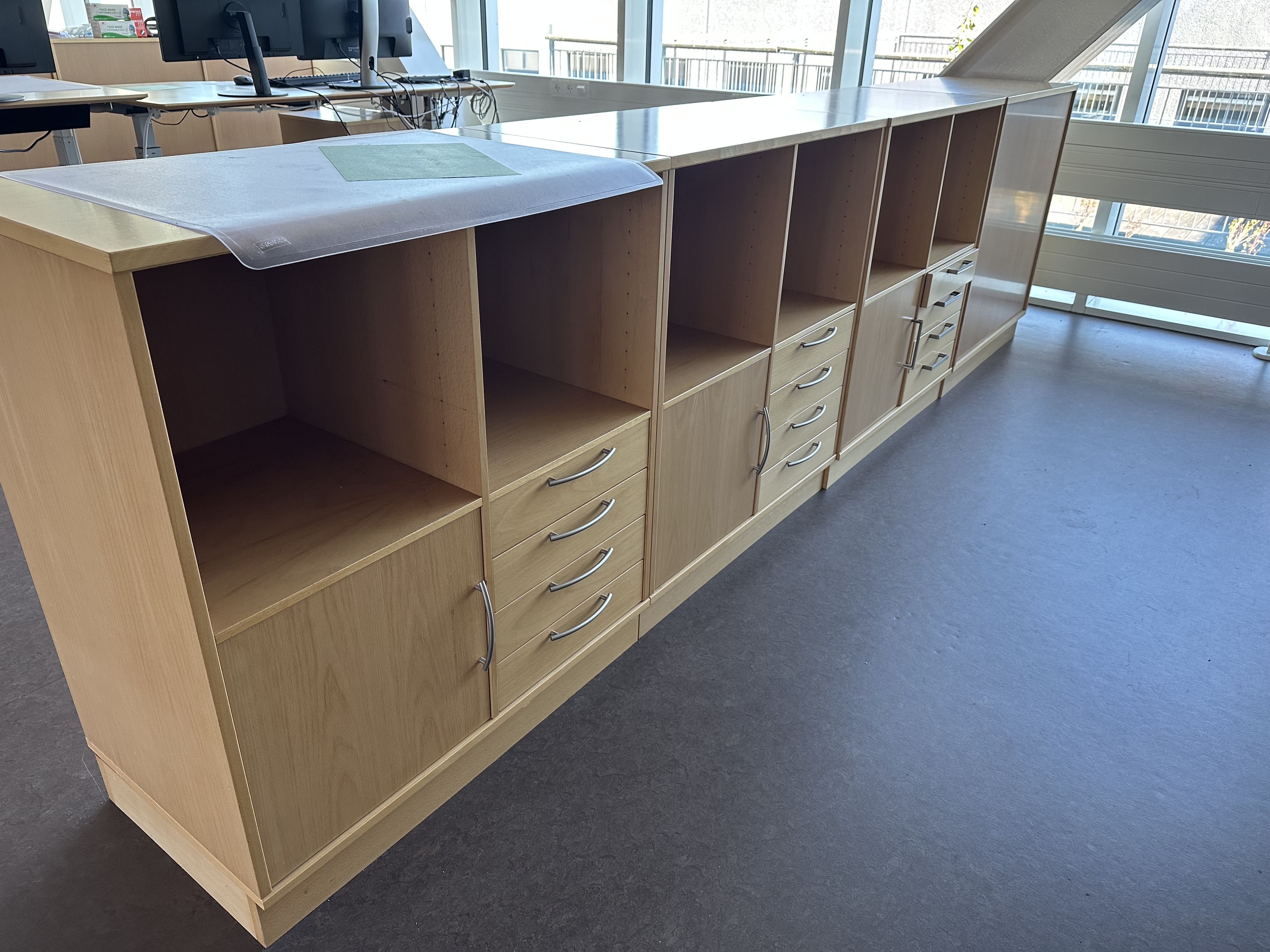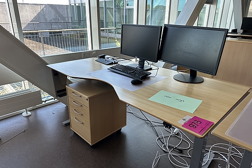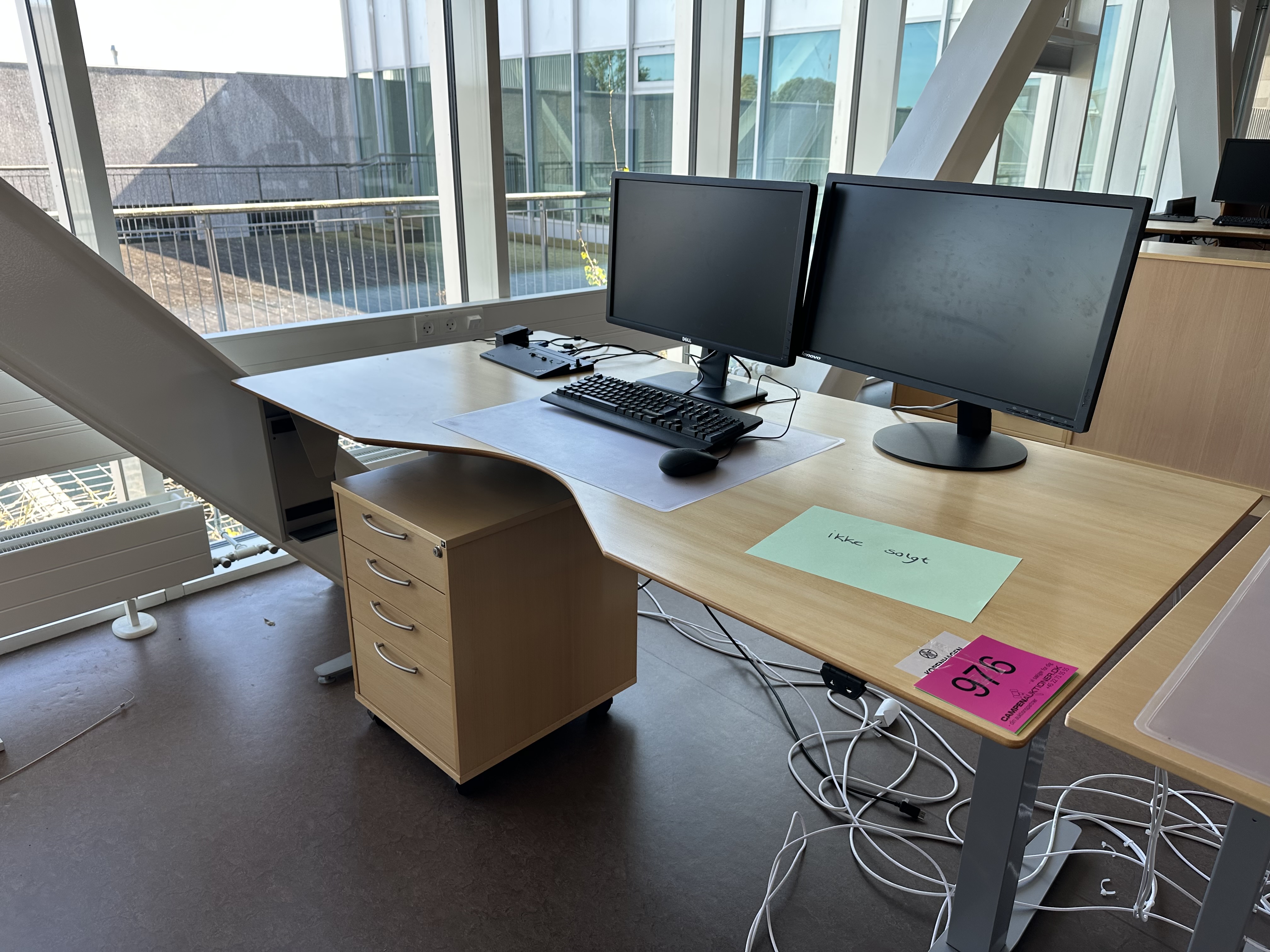 Indeholder hæve/sænkebord, 4 stk. skabe, 1 stk. skuffedarium, 2 stk. PC-skærme, 1 stk. tastatur, 1 stk. mus samt 1 stk. dockingstation.