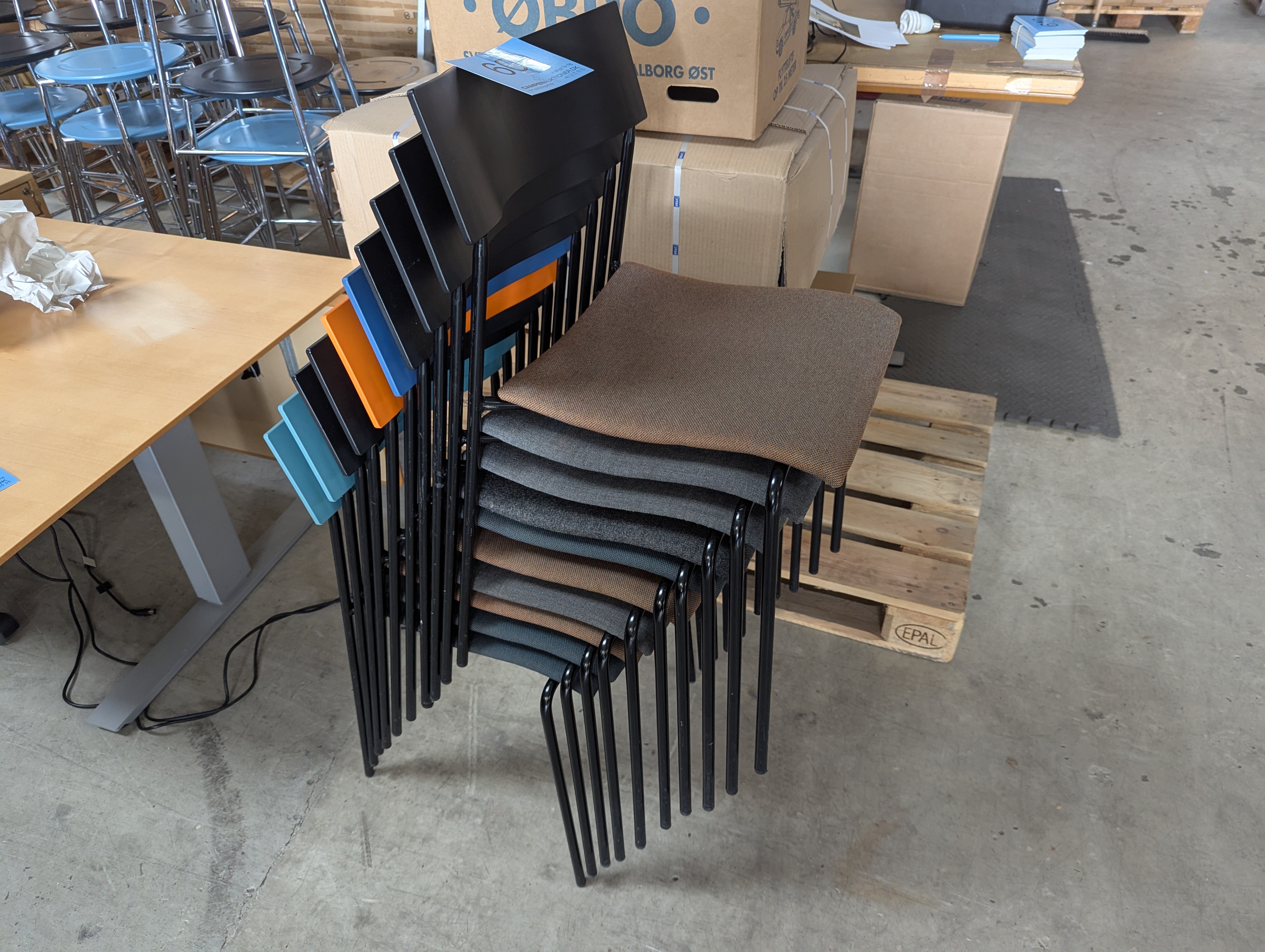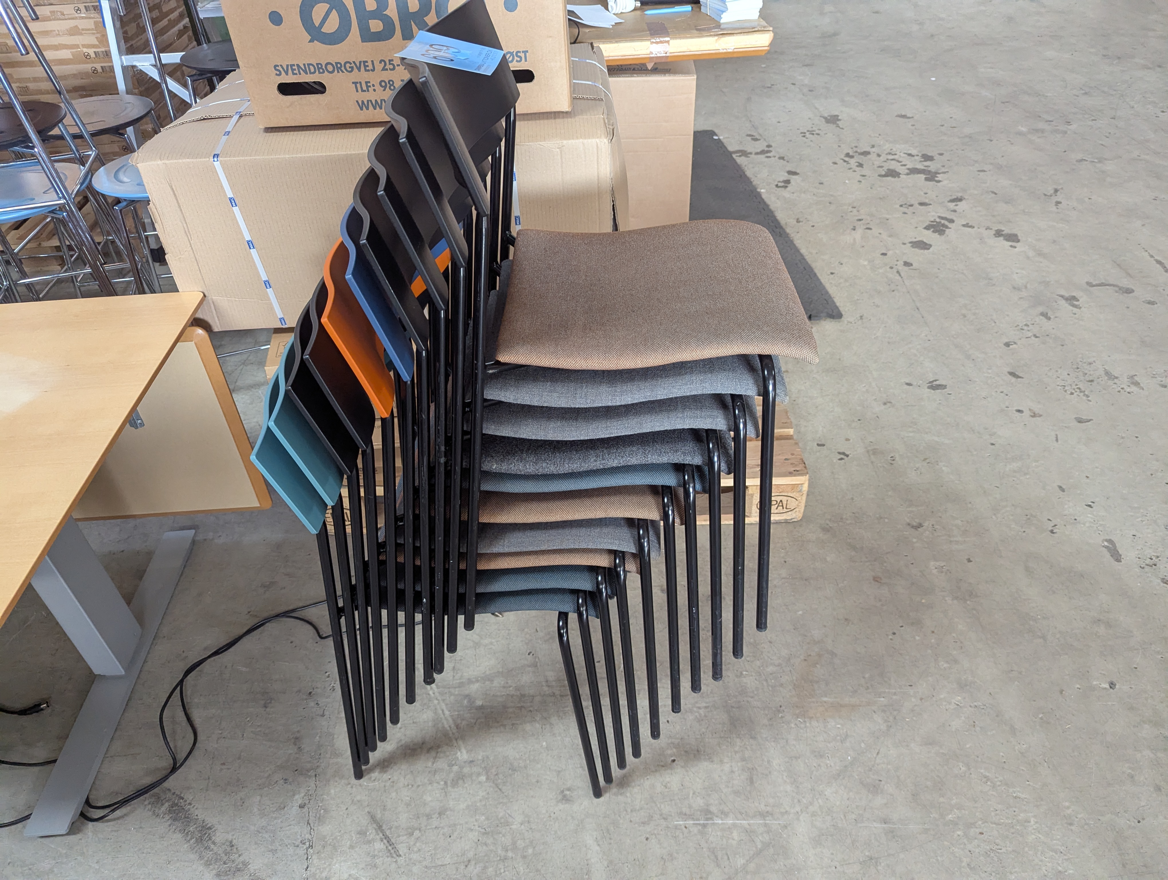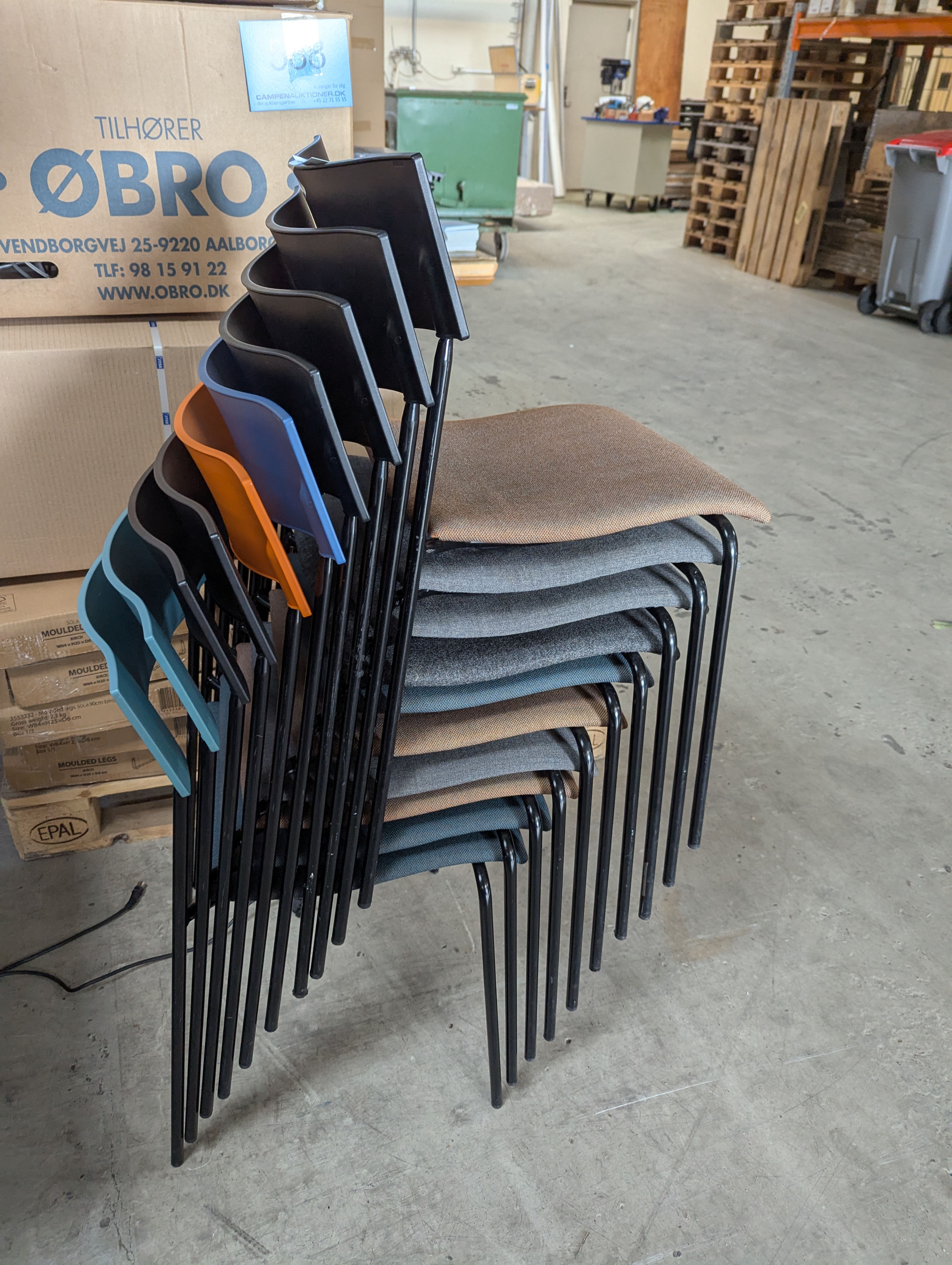 609. 10 stk. Ass. Lammhults Campus, stabelstol. M/ forskellig farvet betræk - Sort, orange, blå og grøn ryglæn og sort stålstel. Træ og plast siddeplade