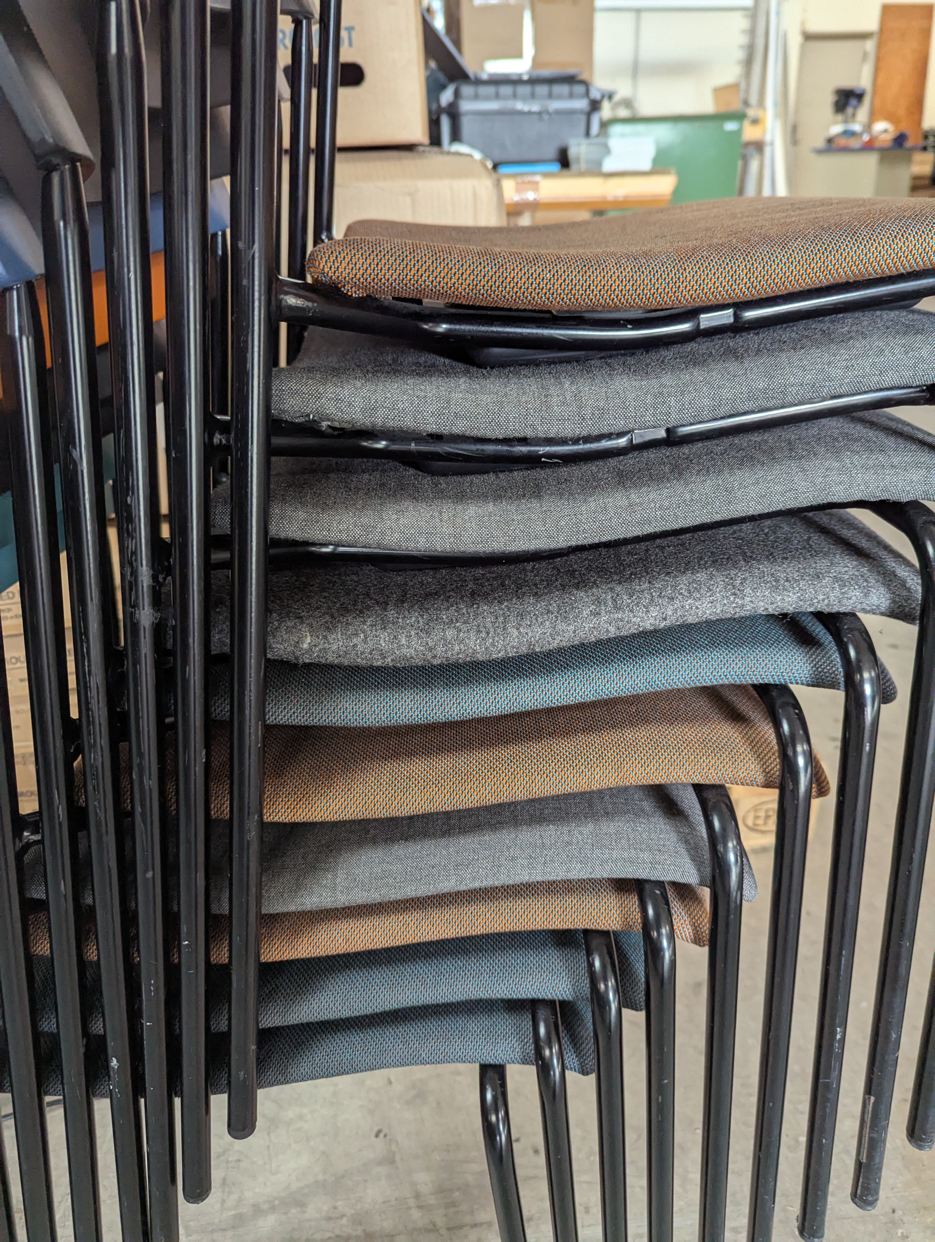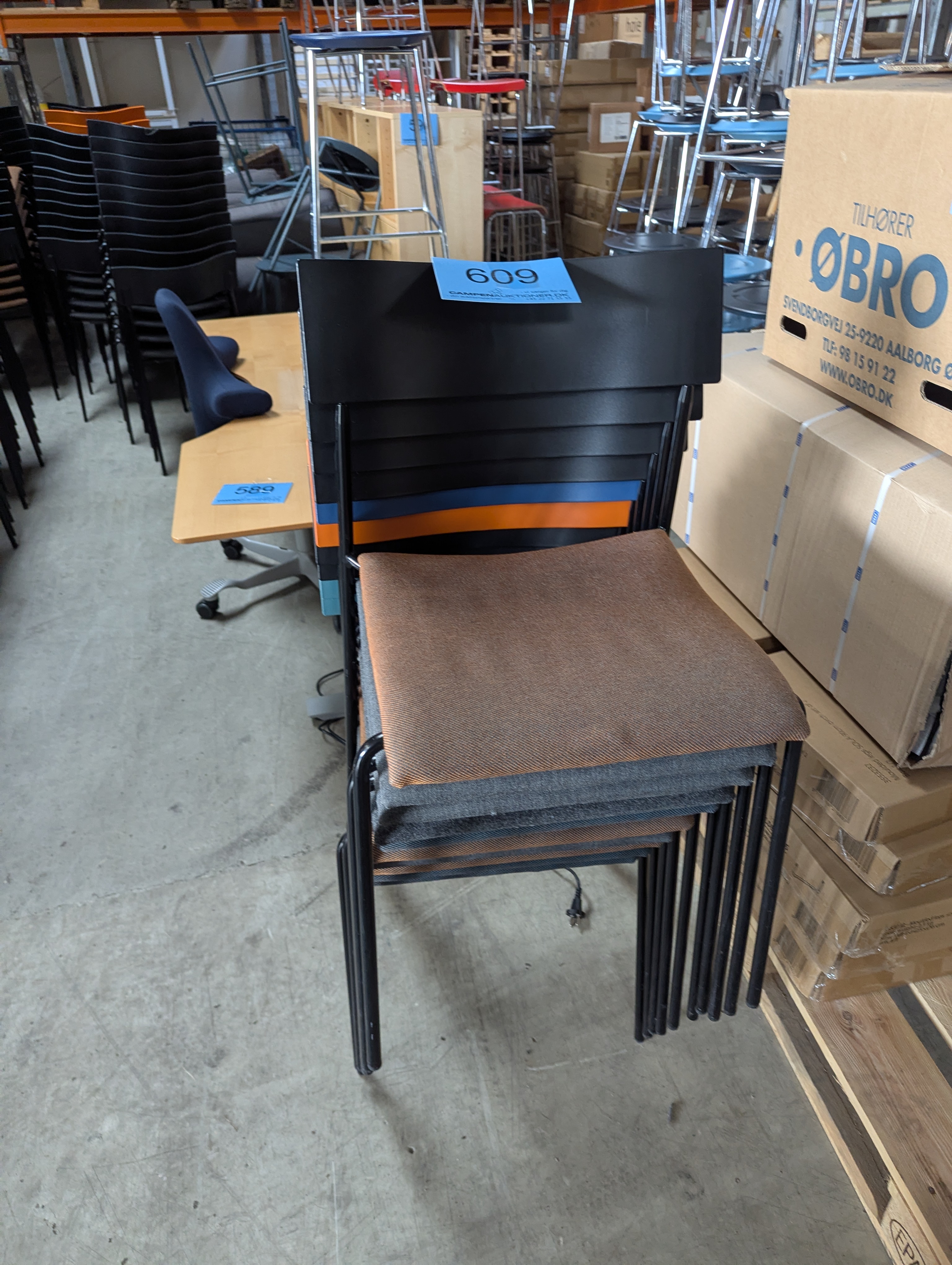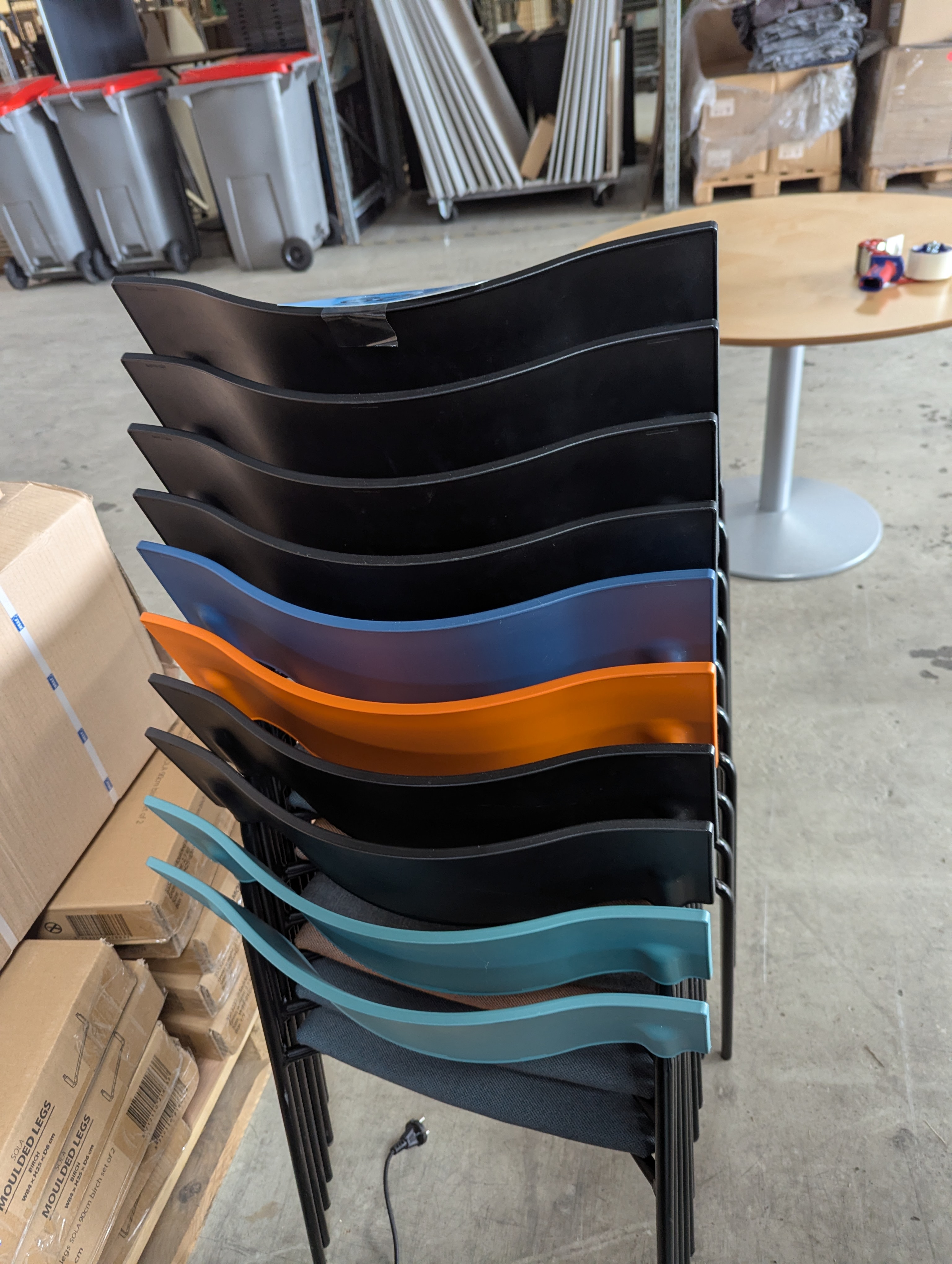 609. 10 stk. Ass. Lammhults Campus, stabelstol. M/ forskellig farvet betræk - Sort, orange, blå og grøn ryglæn og sort stålstel. Træ og plast siddeplade