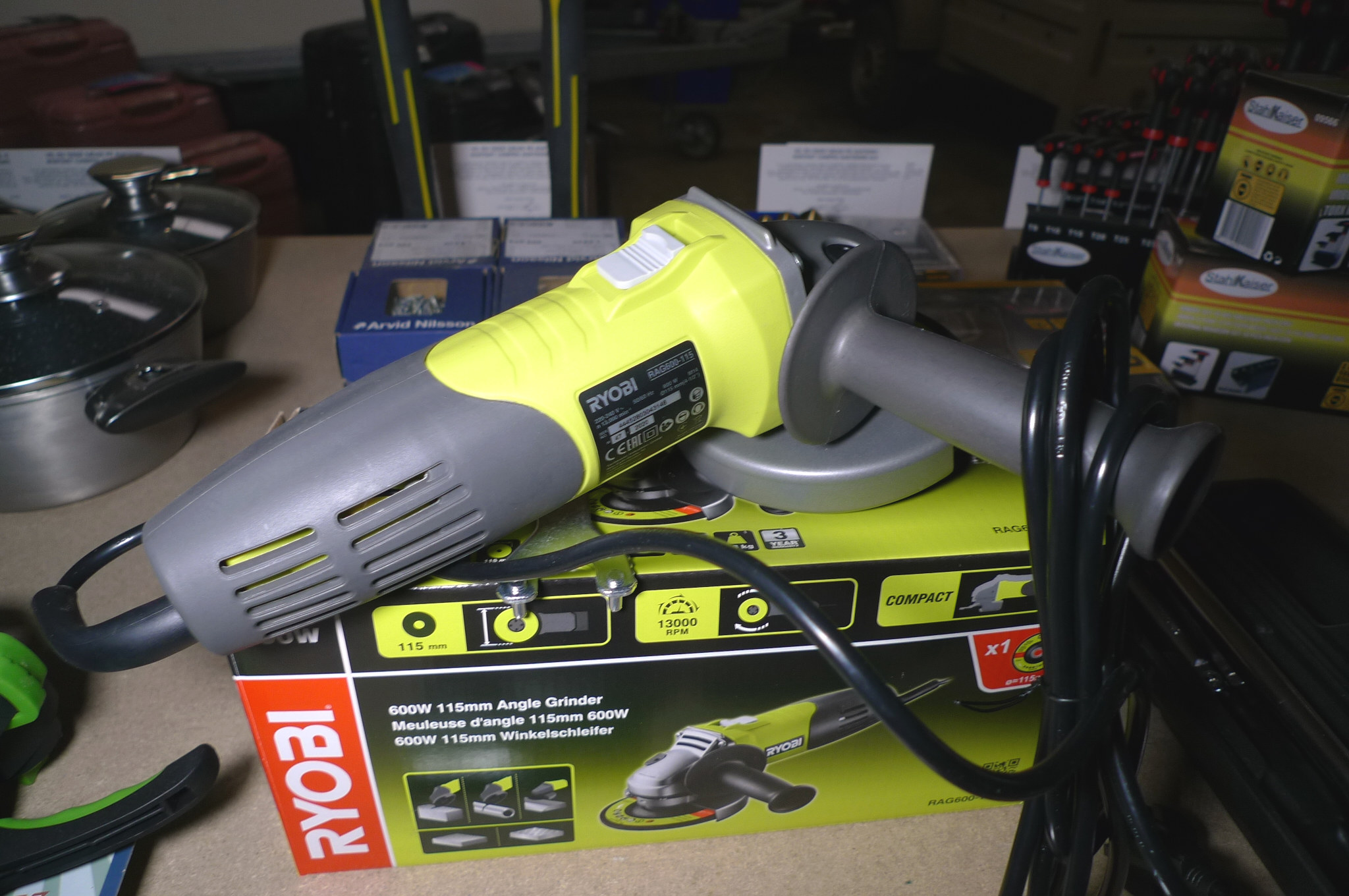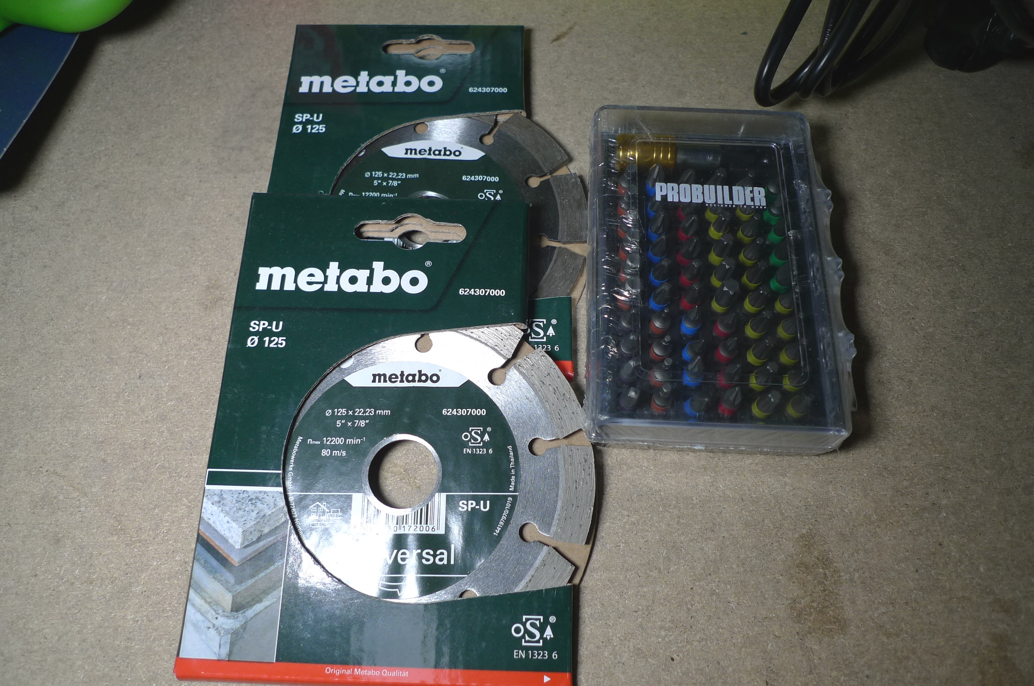 Vinkelsliber, skæreskiver + bitssæt. Vinkelsliber, Ryobi 115mm + 2 stk. Metabo skæreskiver 125mm. Probuilder bitssæt. Ubrugt.