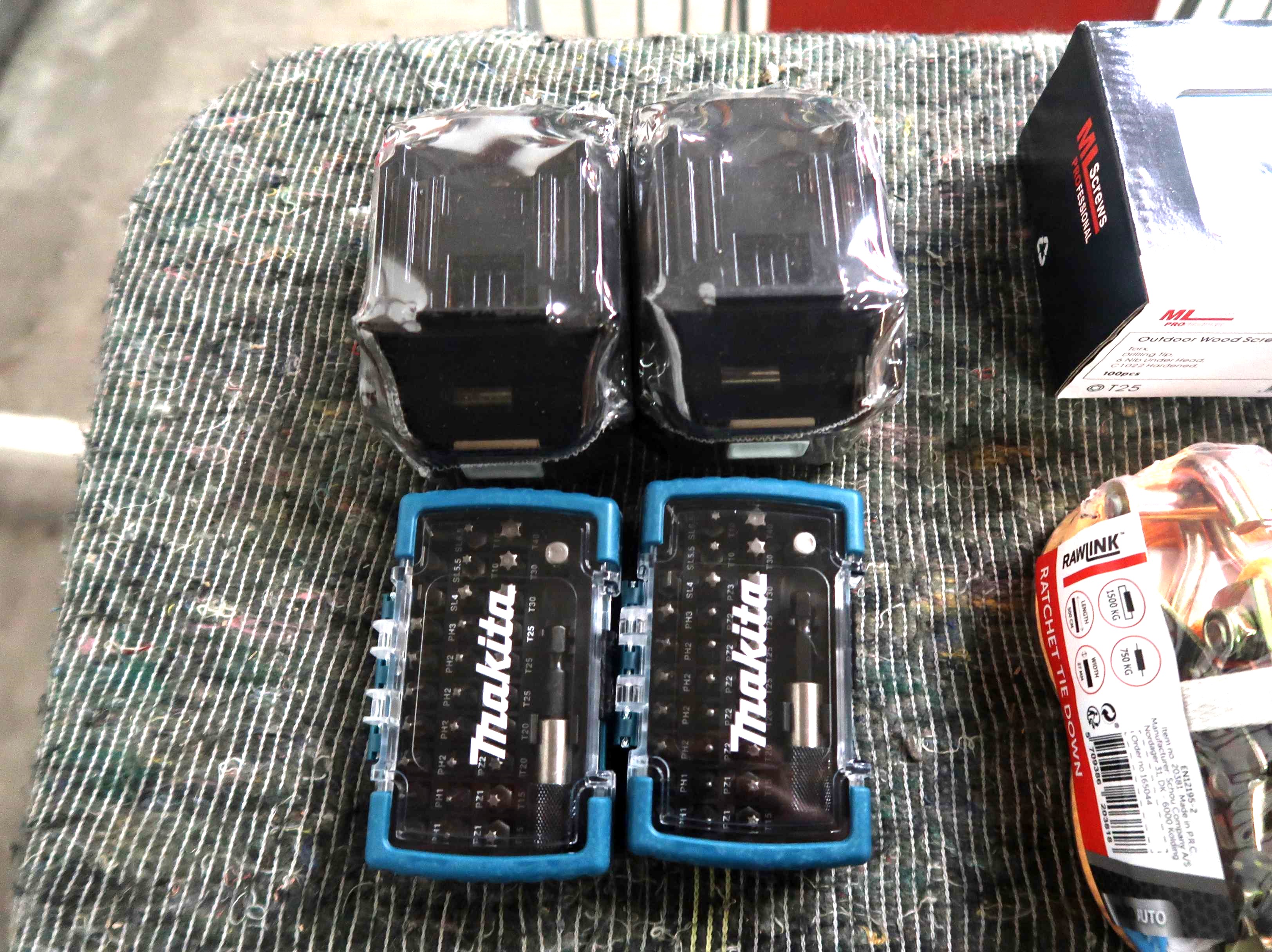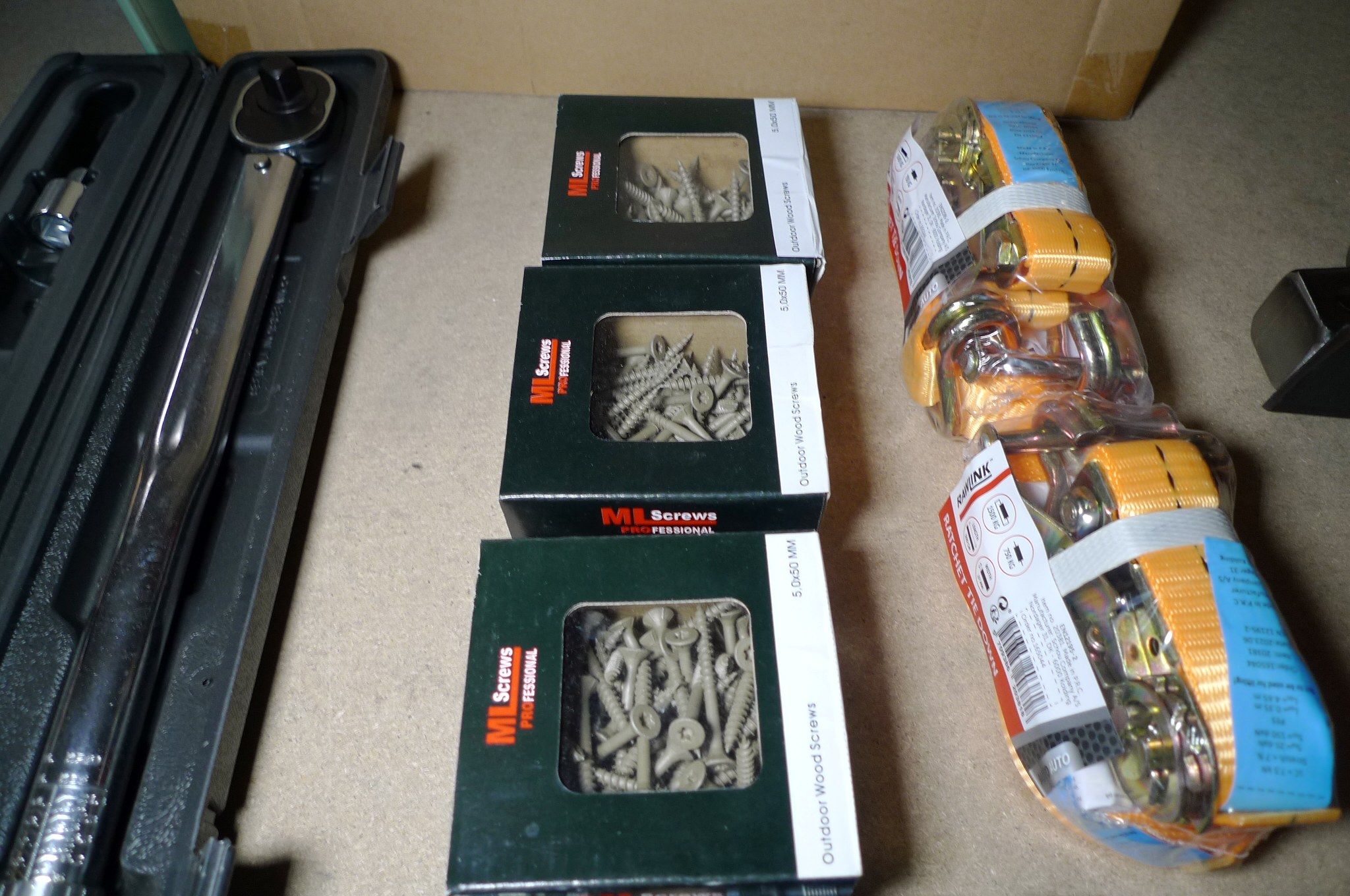 3 æsker skruer 5x100 mm, båndstrammere, bitssæt. Ubrugt.