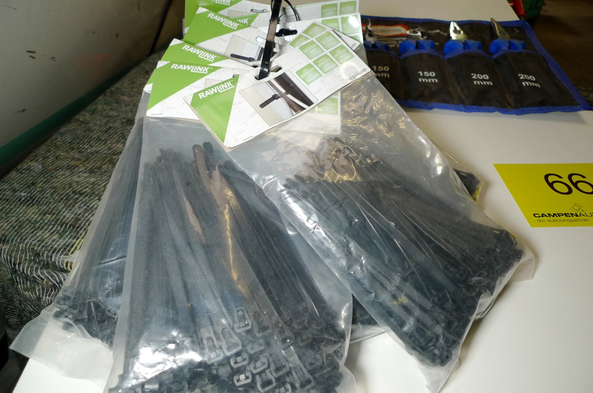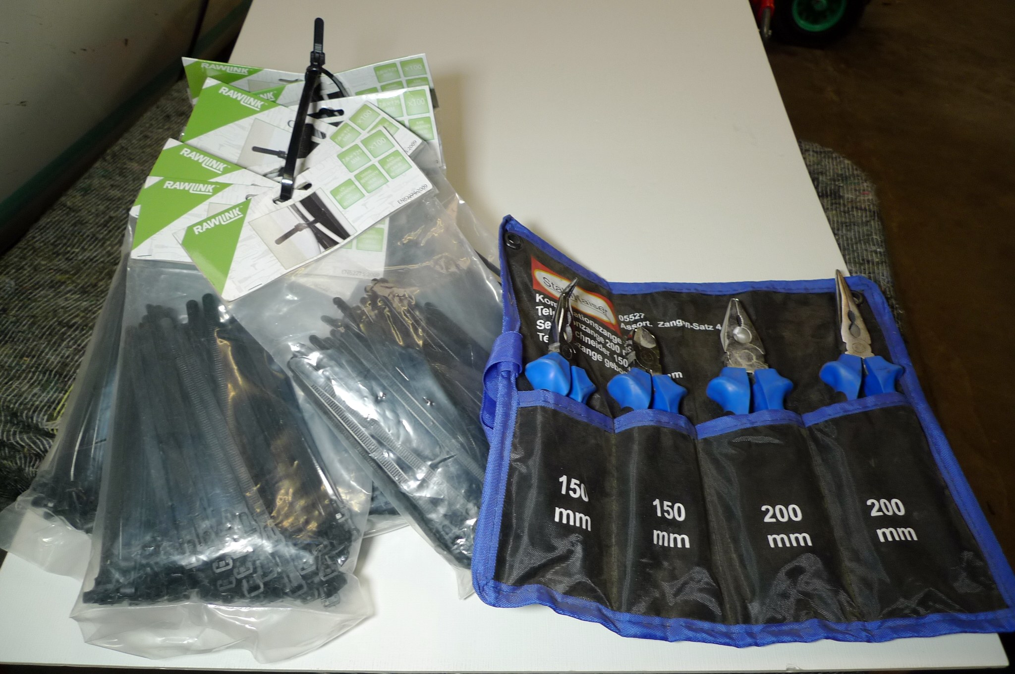 9 poser genanvendelige strips á 100 stk. + tangsæt. Krokodillenæb, skævbider, tang m/klippefunktion og spidstang. Ubrugt.