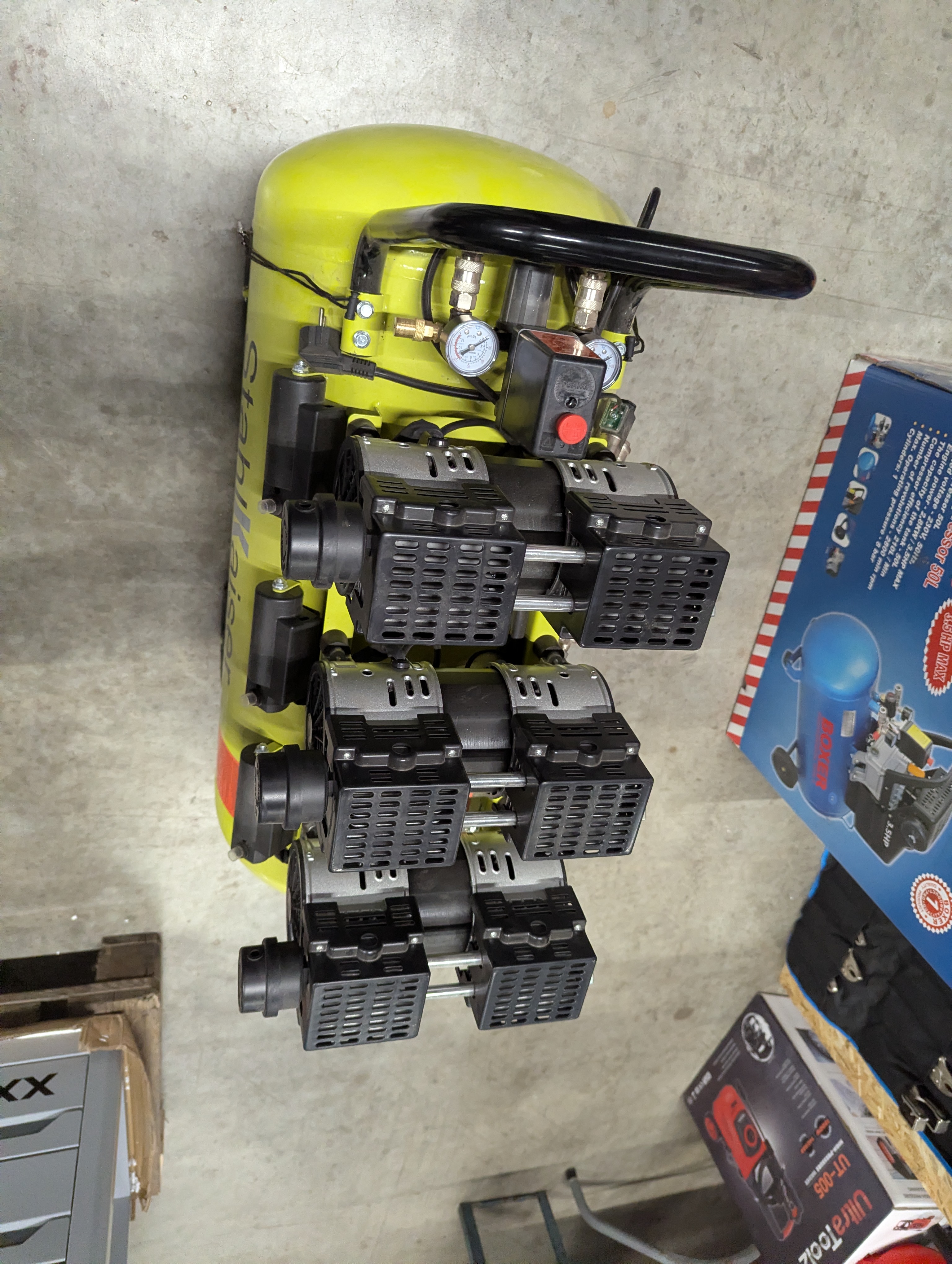 En stor tank, der kan lagre meget luft. Ideel til opgaver, der kræver et konstant, højt luftflow (som sandblæsning, maling med store sprøjtepistoler eller længere tids brug af luftværktøj).