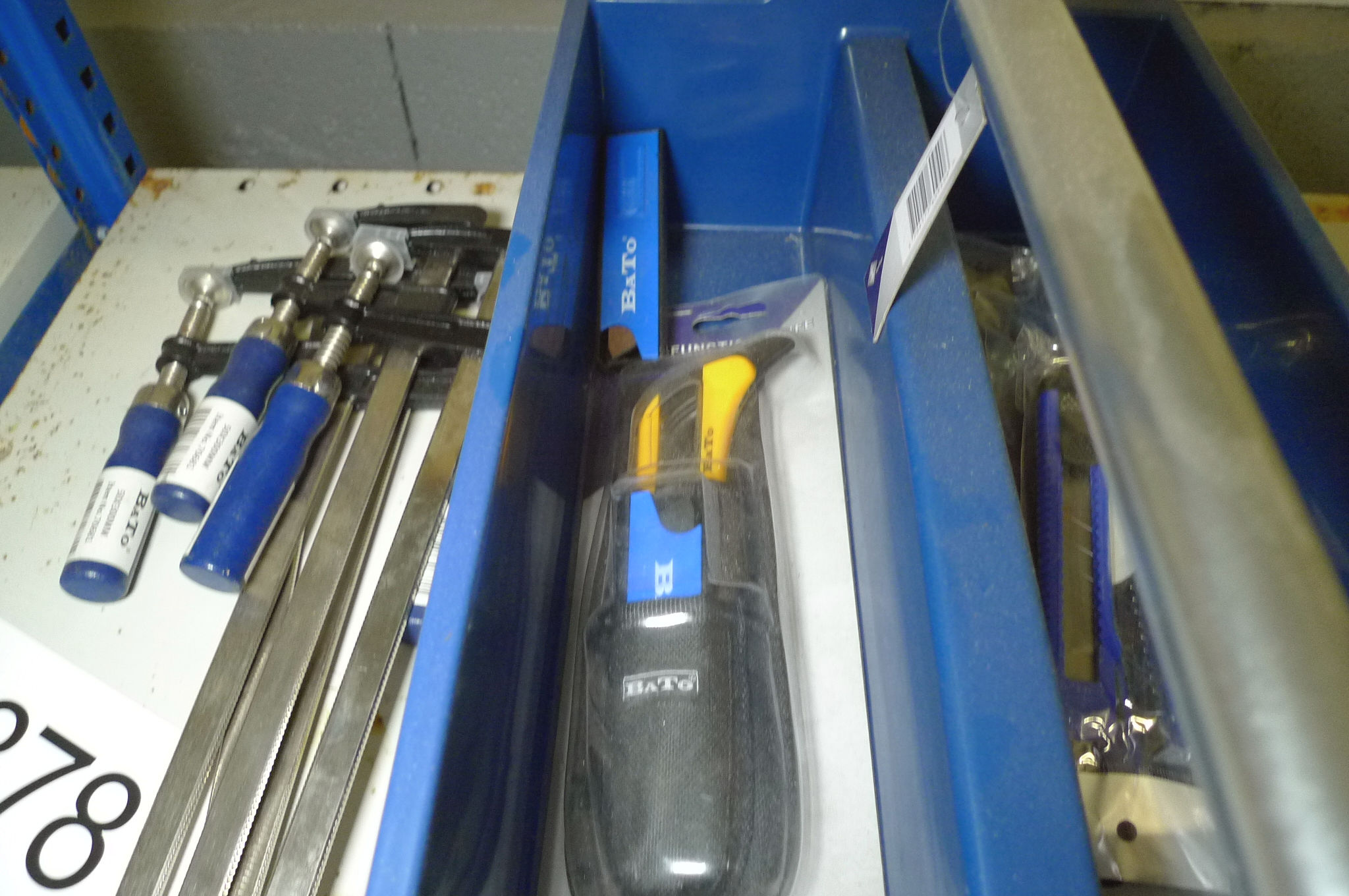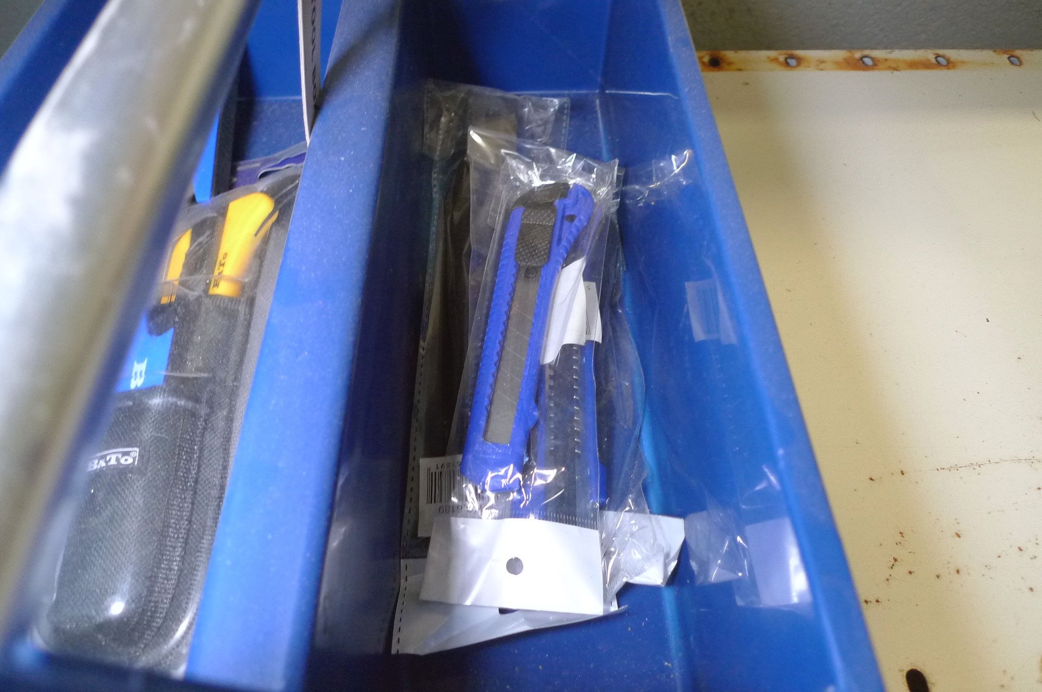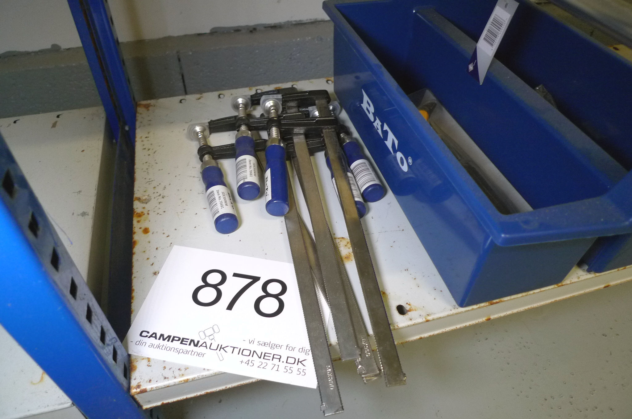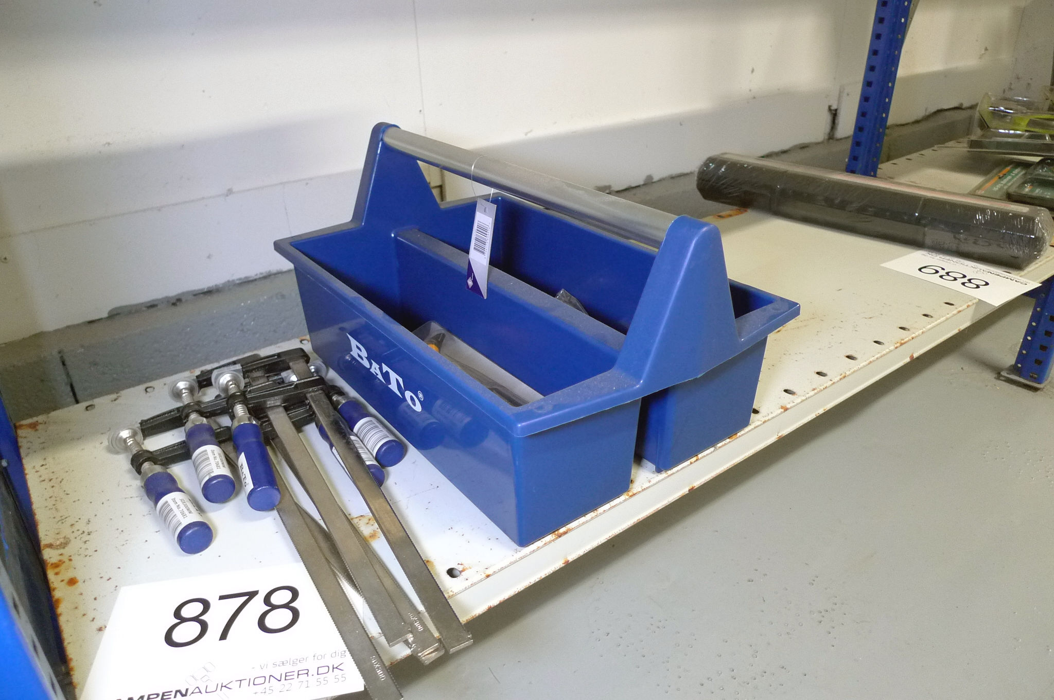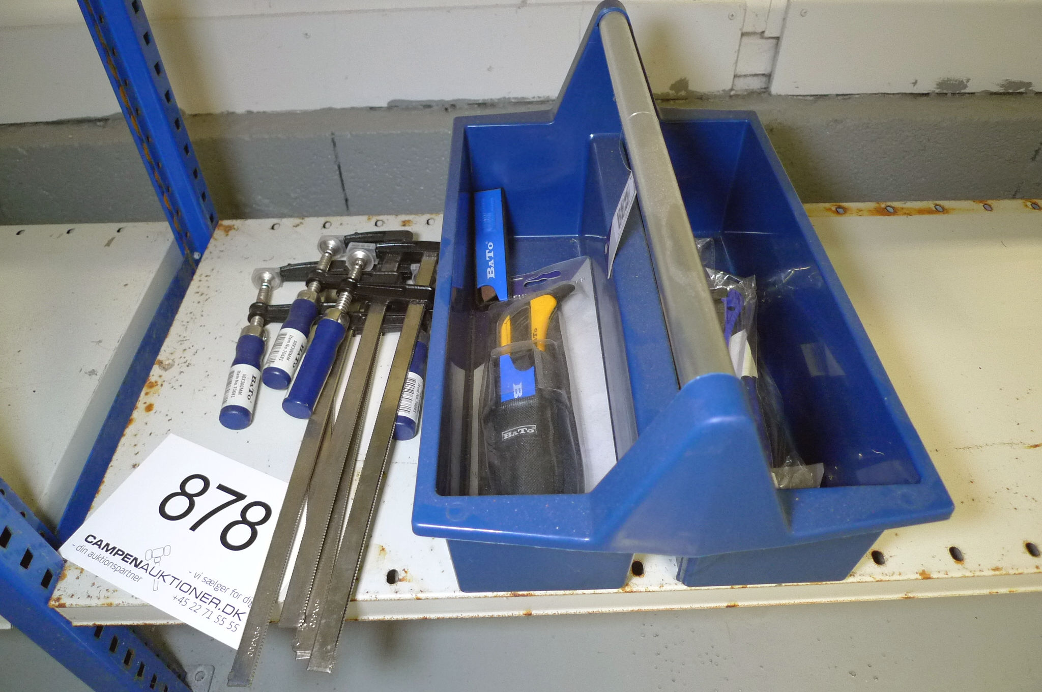 878. Værktøjskasse m/skruetvinger og hobbyknive, BaTo