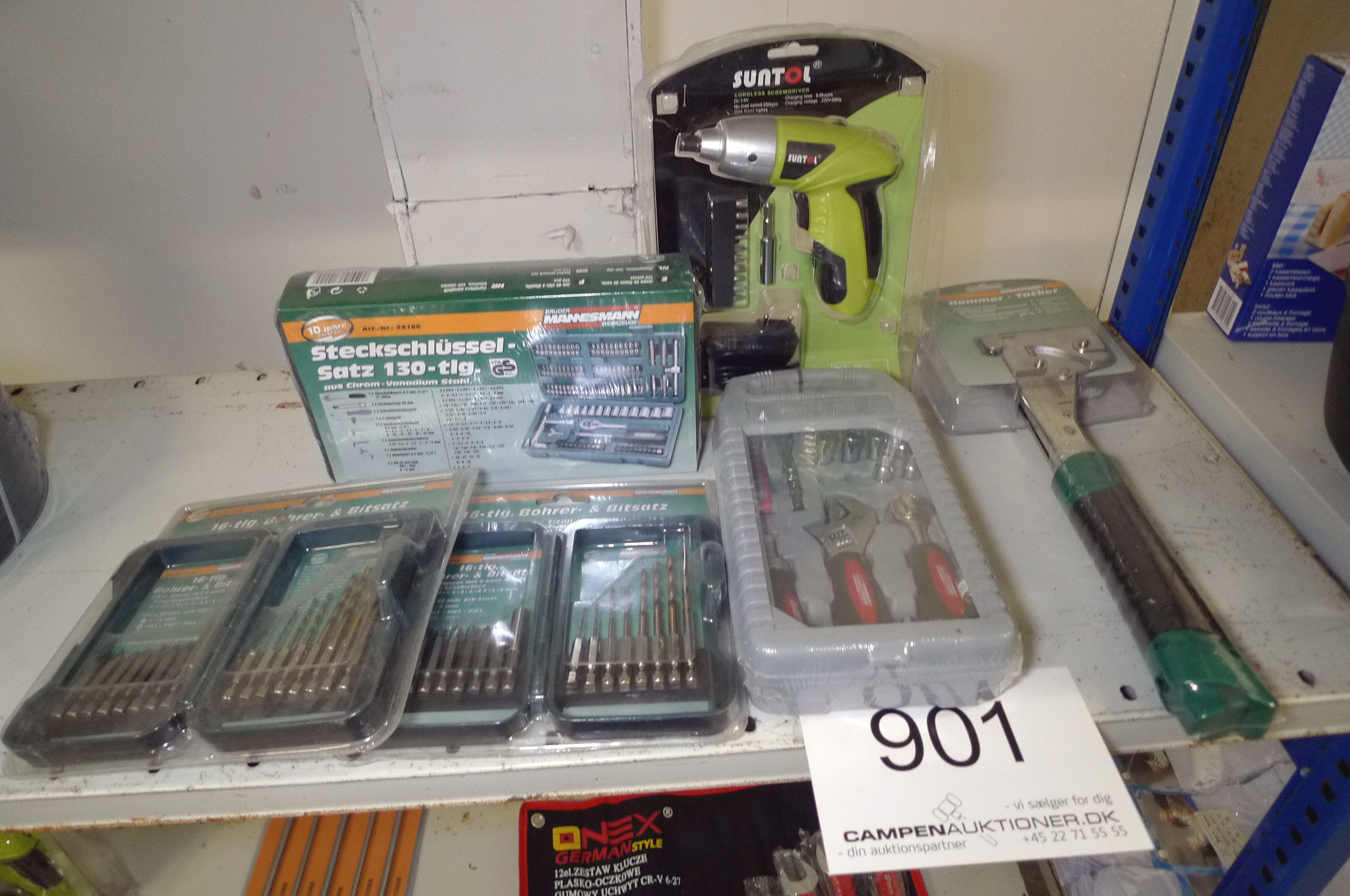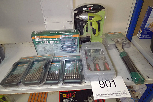 901. Bor-/bitssæt, topnøglesæt, akku skruemaskine, dasker m.m.