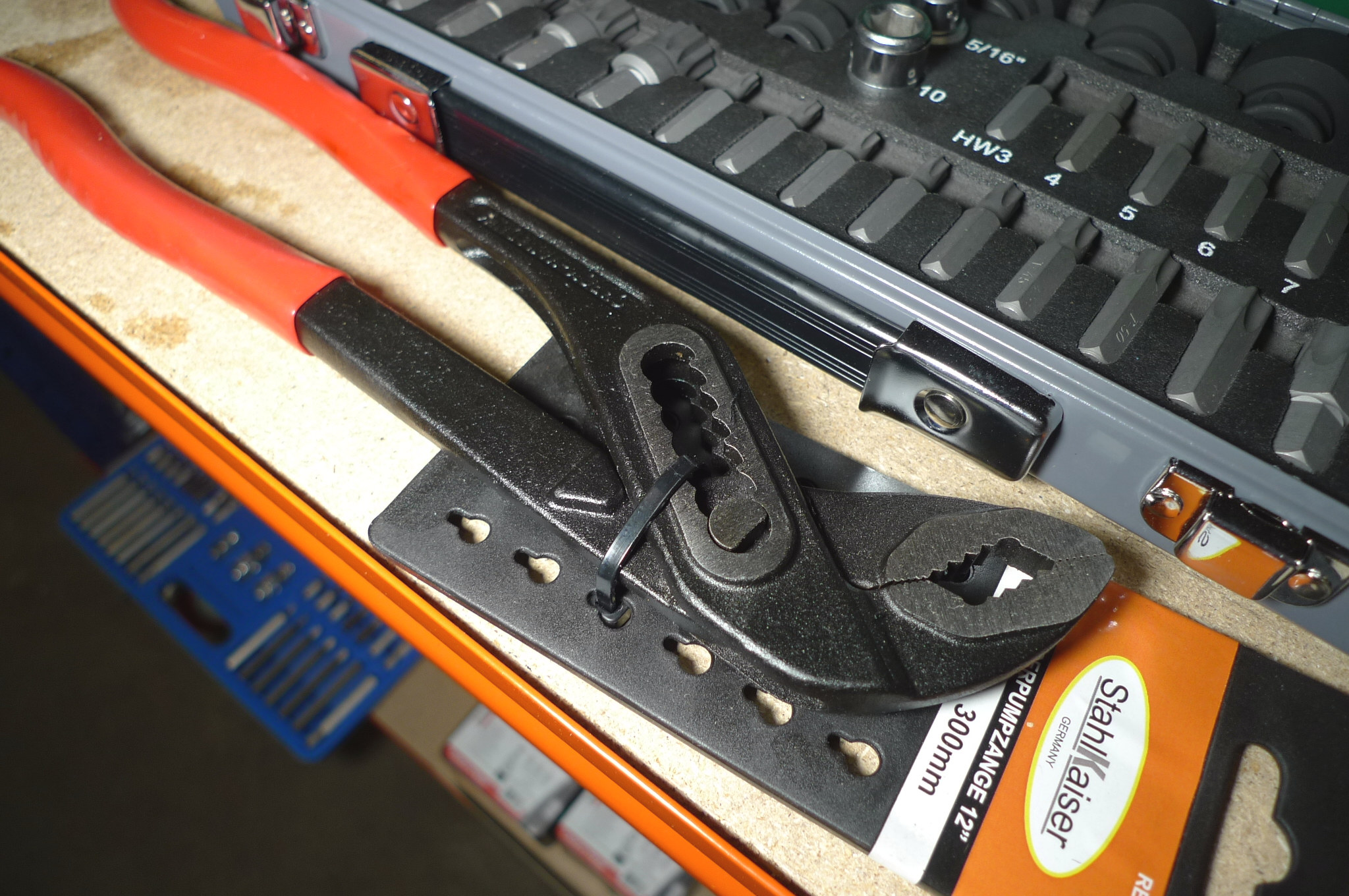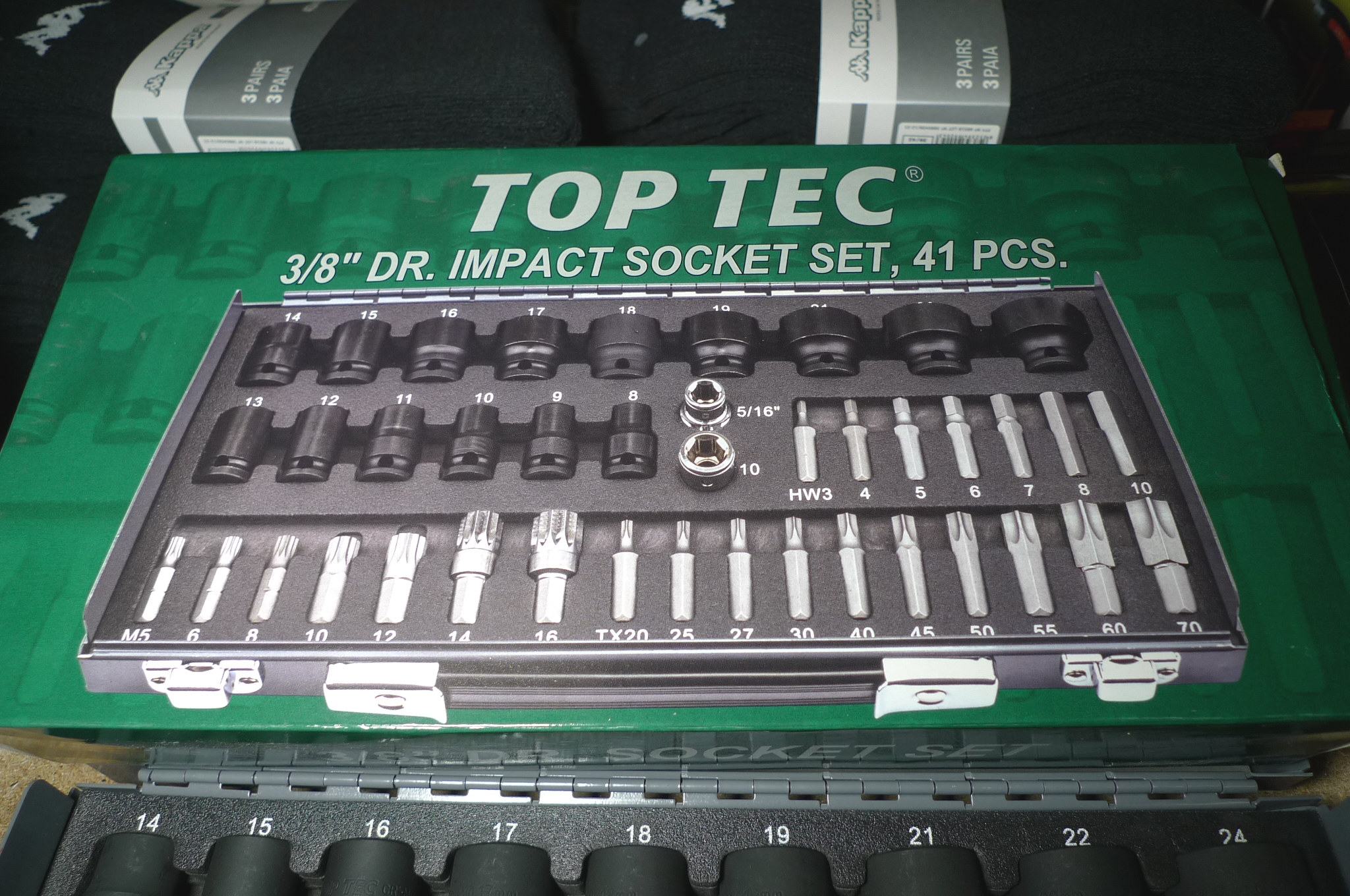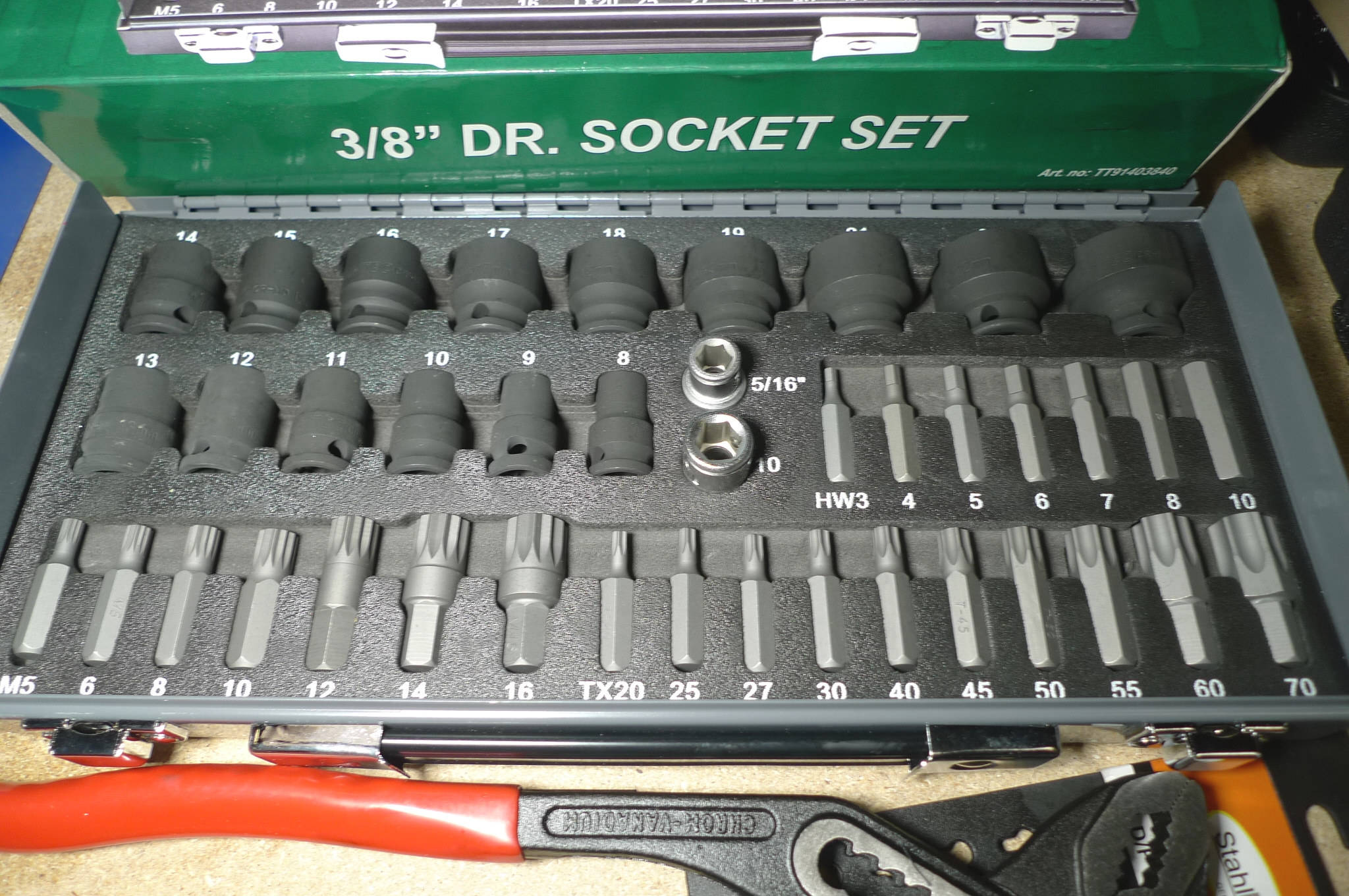41 dele bits-/toppesæt 3/8" + vandpumpetang. Ubrugt.