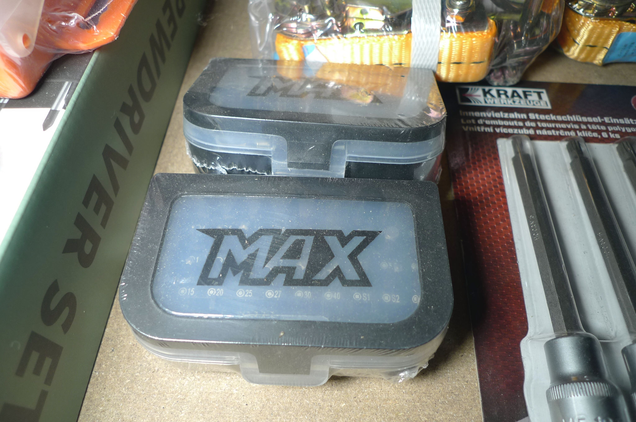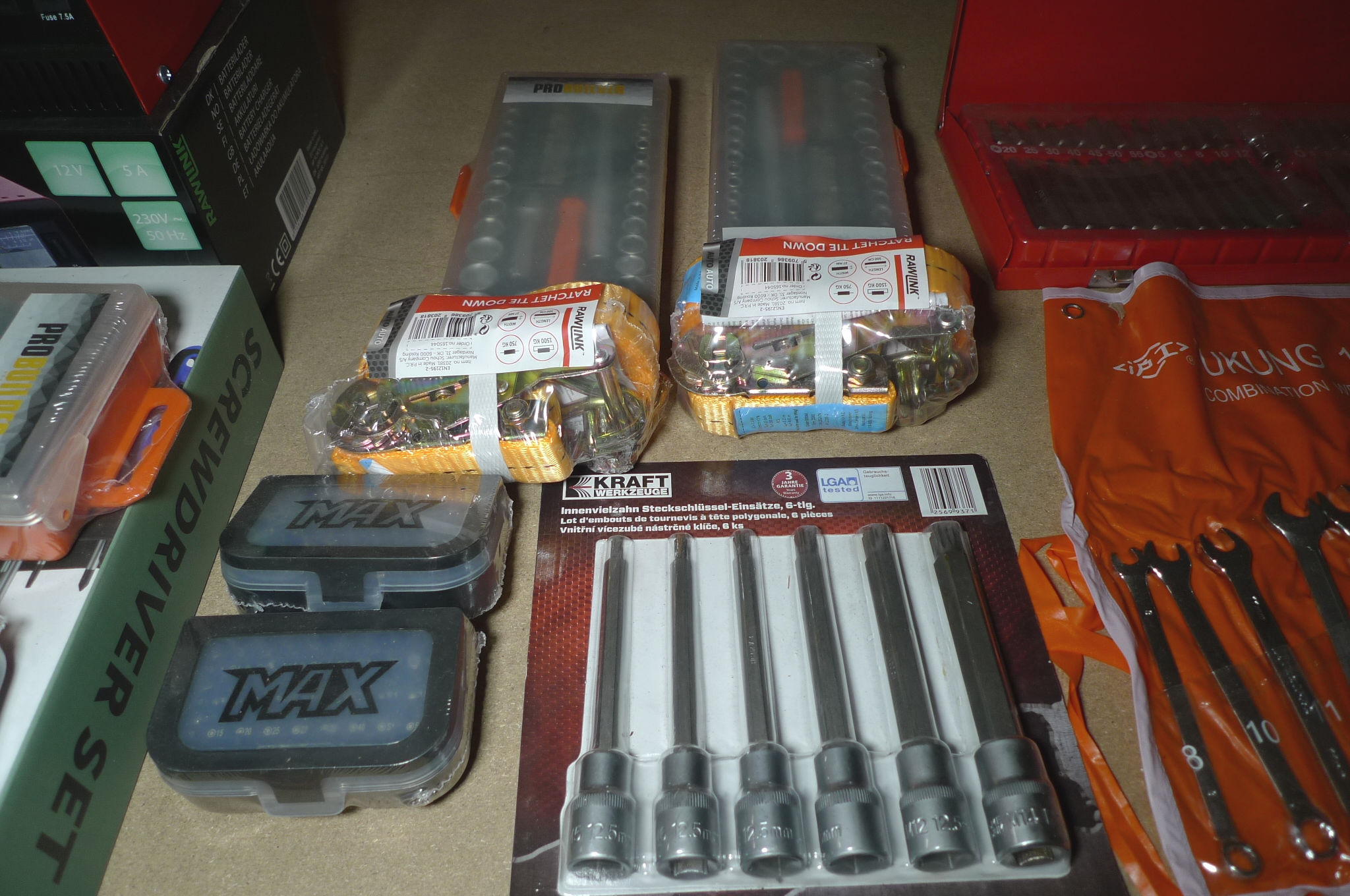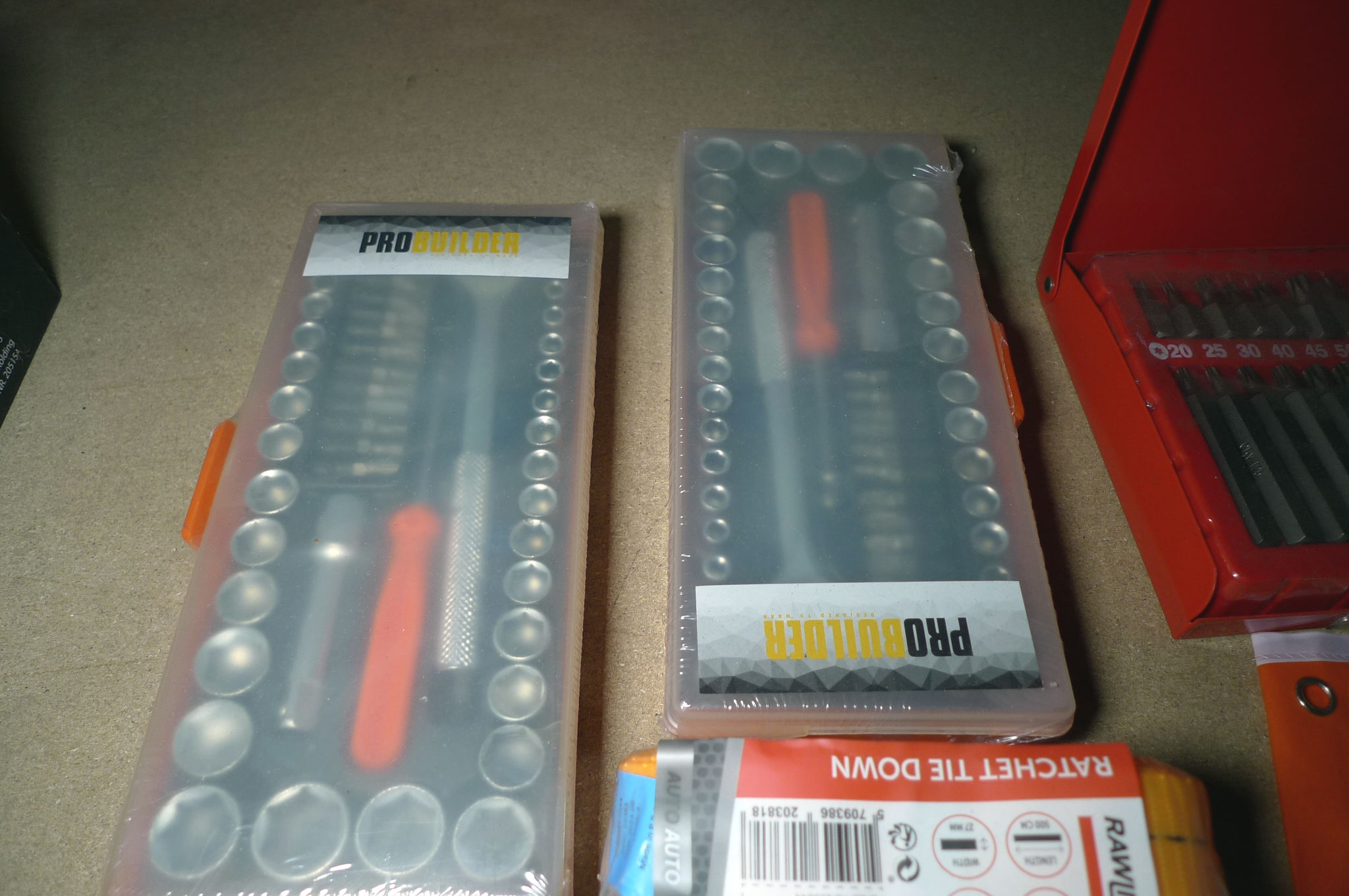 2 stk. topnøglesæt, 2 stk. båndstrammere, 2 stk. bitssæt á 32 dele og 6 dele toppesæt. Ubrugt.