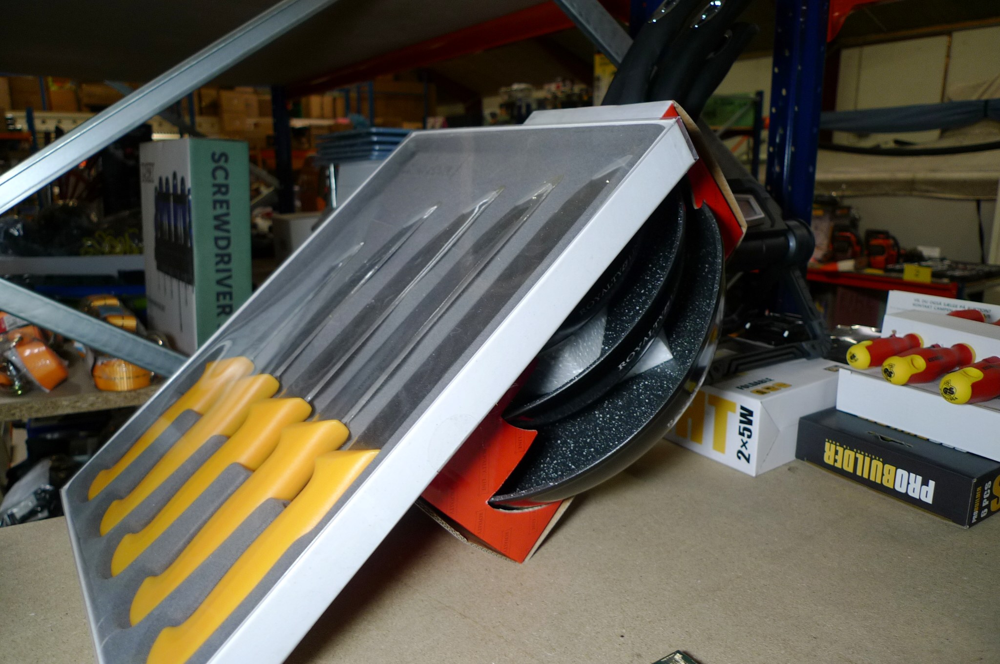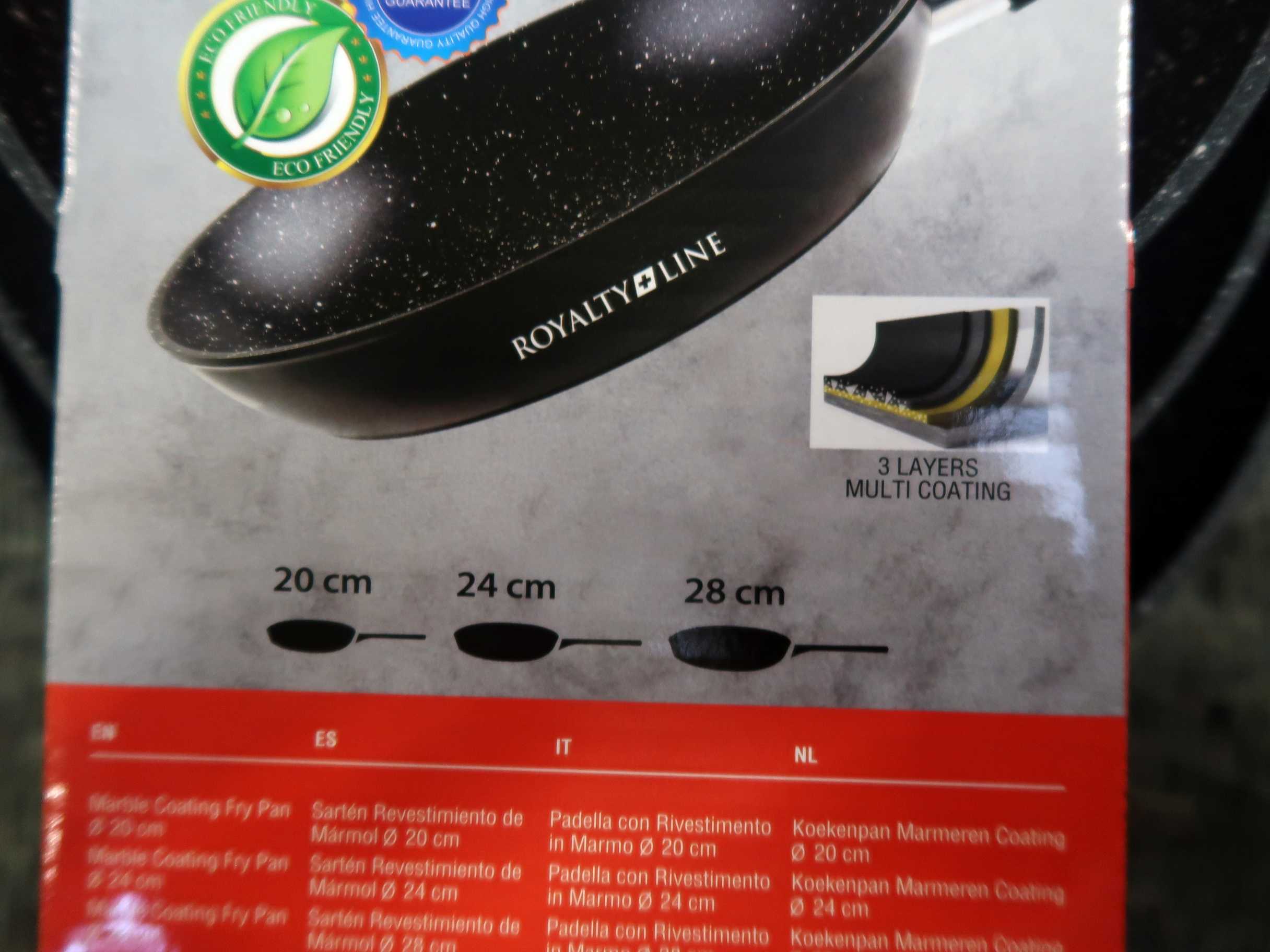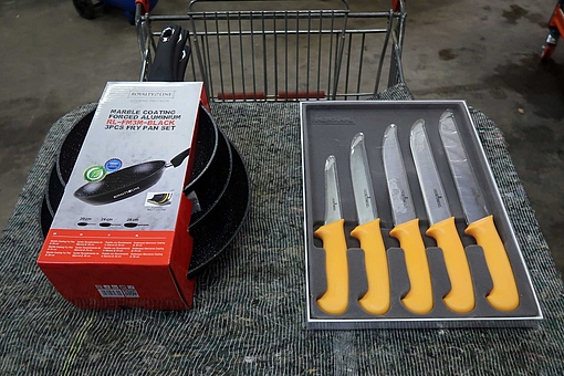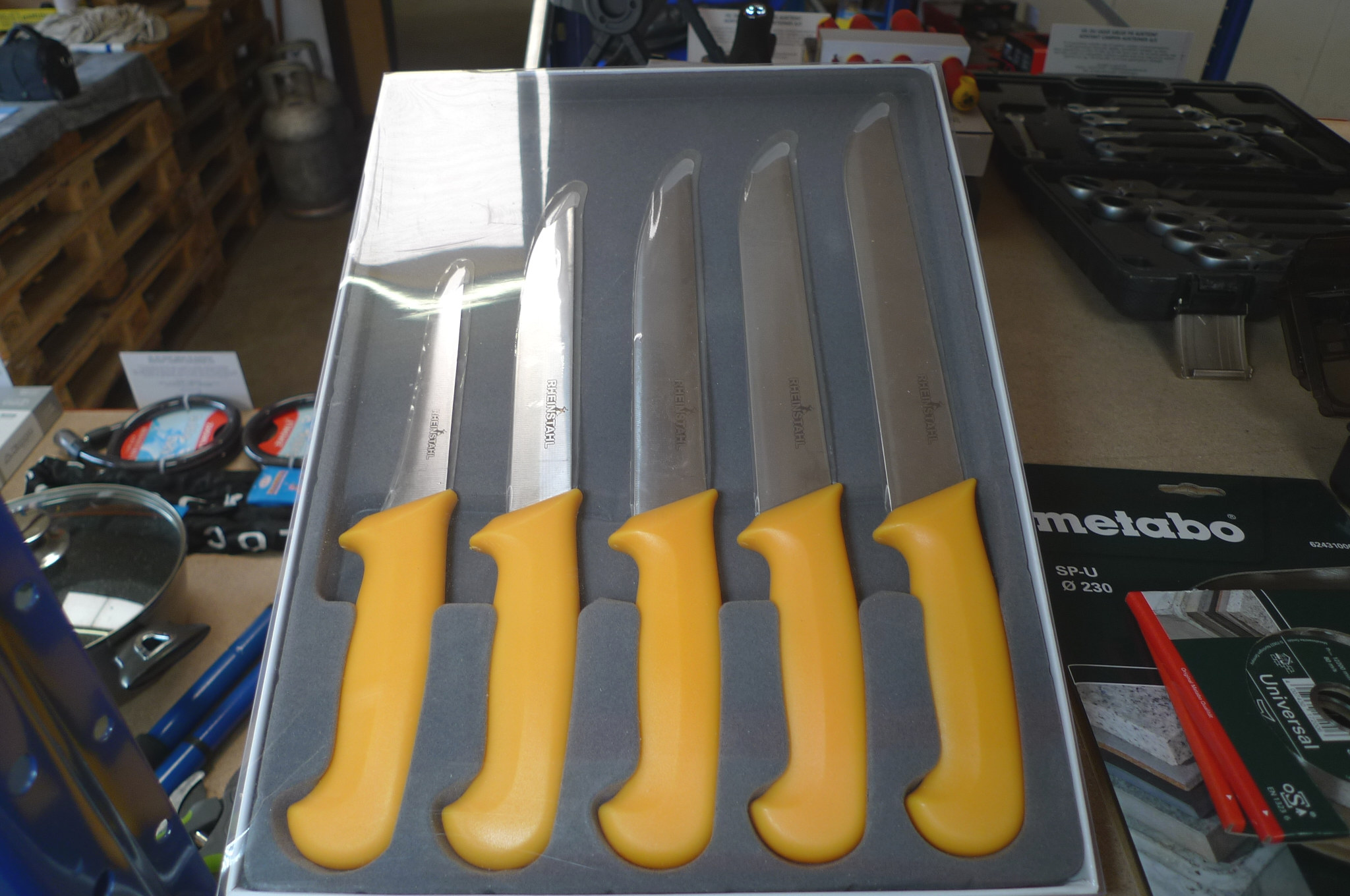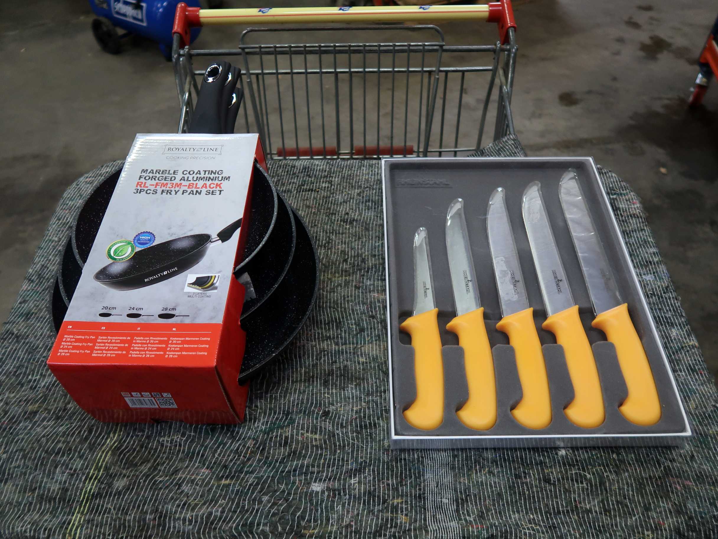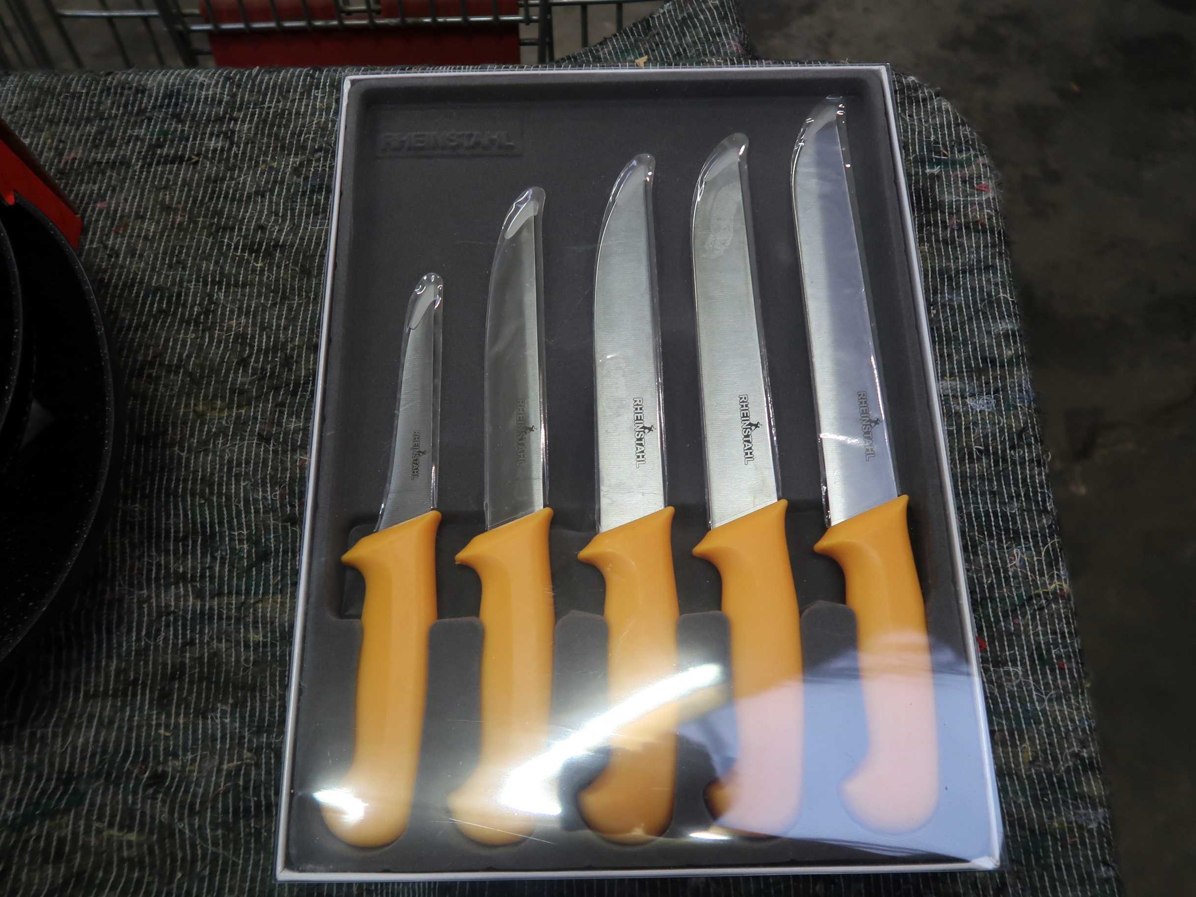 Stegepandesæt samt fiskeknivsæt. Stegepandesæt á 3 dele, 20/24/28 cm. Knivsæt af mærket Rheinstahl. Ubrugt.