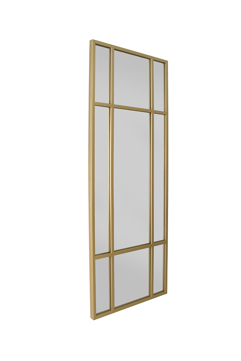 Spejl m. guldfarvet ramme i jern 160x60cm, GWM05G Daneline spejl. Stort spejl med ramme i jern. Stort spejl til ophæng på væg med sort antik malet jernramme. Spejlet kan både stå på gulvet og hænges op vandret eller lodret. Se foto for alle mål. B 60 x H 160 x D 3 cm Vægt 18,5 kg (22,5 kg i emballage).