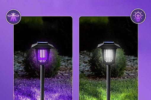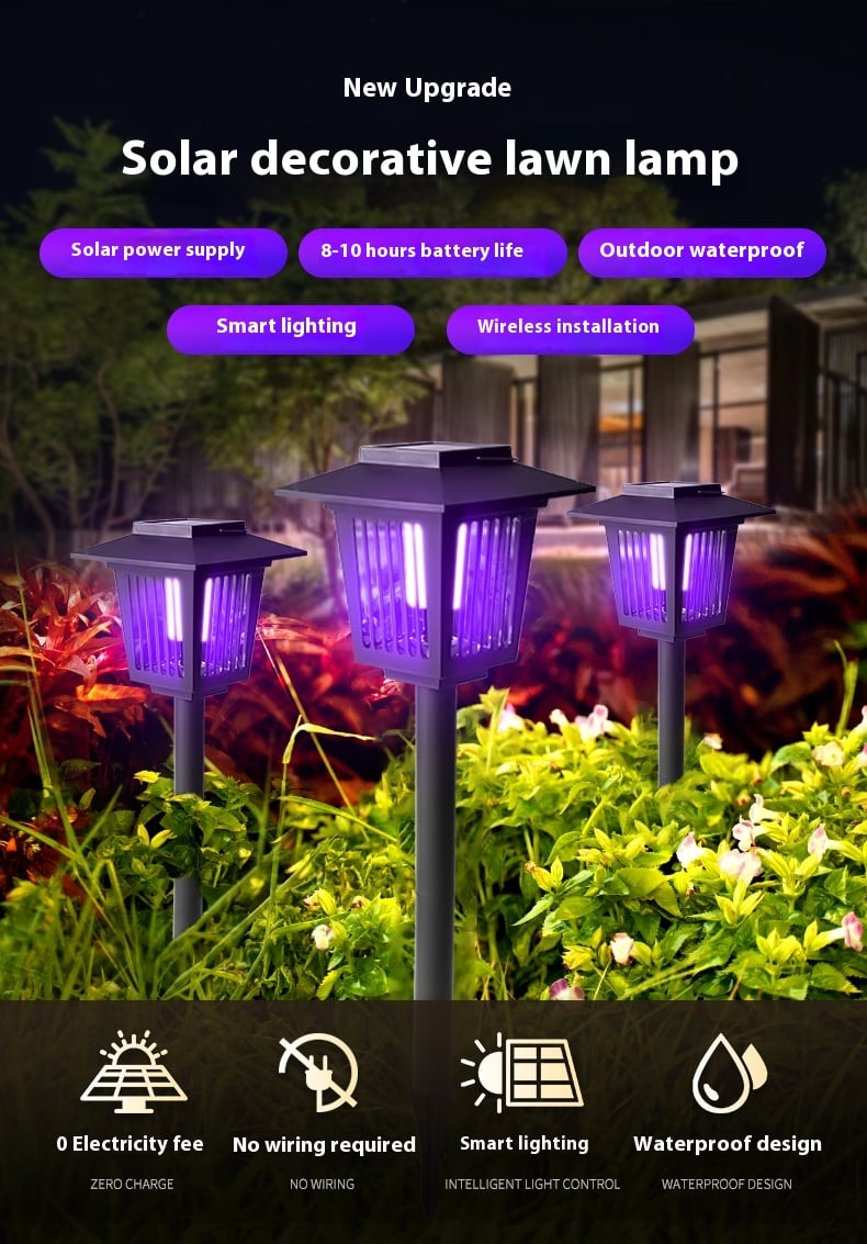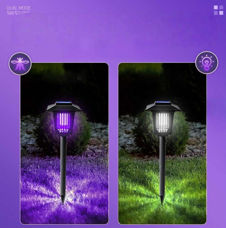Solcelledrevet myggelampe med dekorativt design til have og terrasse. Det lilla lys tiltrækker myg og andre insekter, mens det hvide lys fungerer som almindelig belysning. Oplades via solpanel og tændes automatisk ved skumringstid.