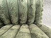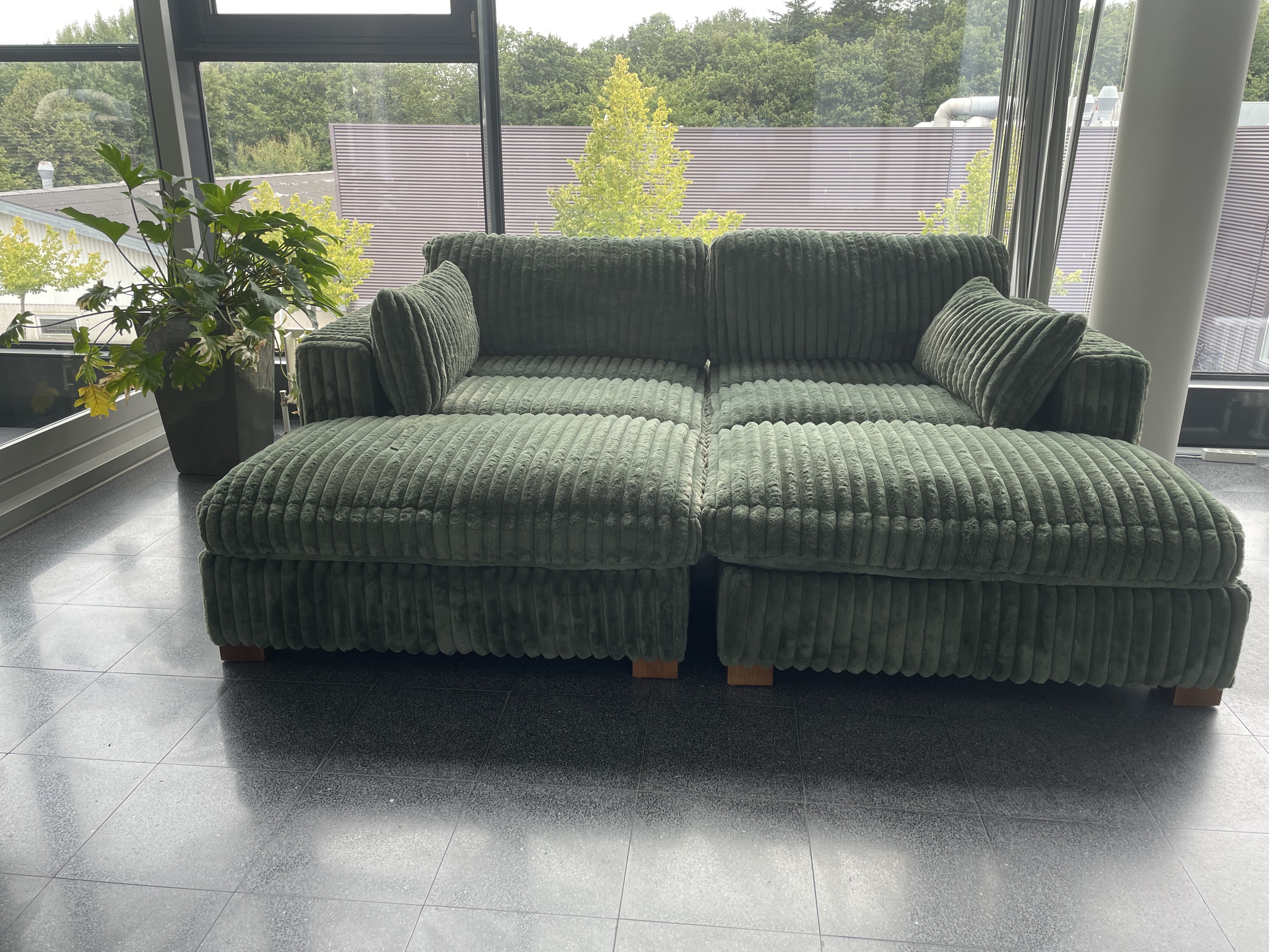 Dobbelt Chaiselong sofa i oliven grøn fløjl (bred). Fjedre i sæde og med skum ryg. Ben træ/bejdset.