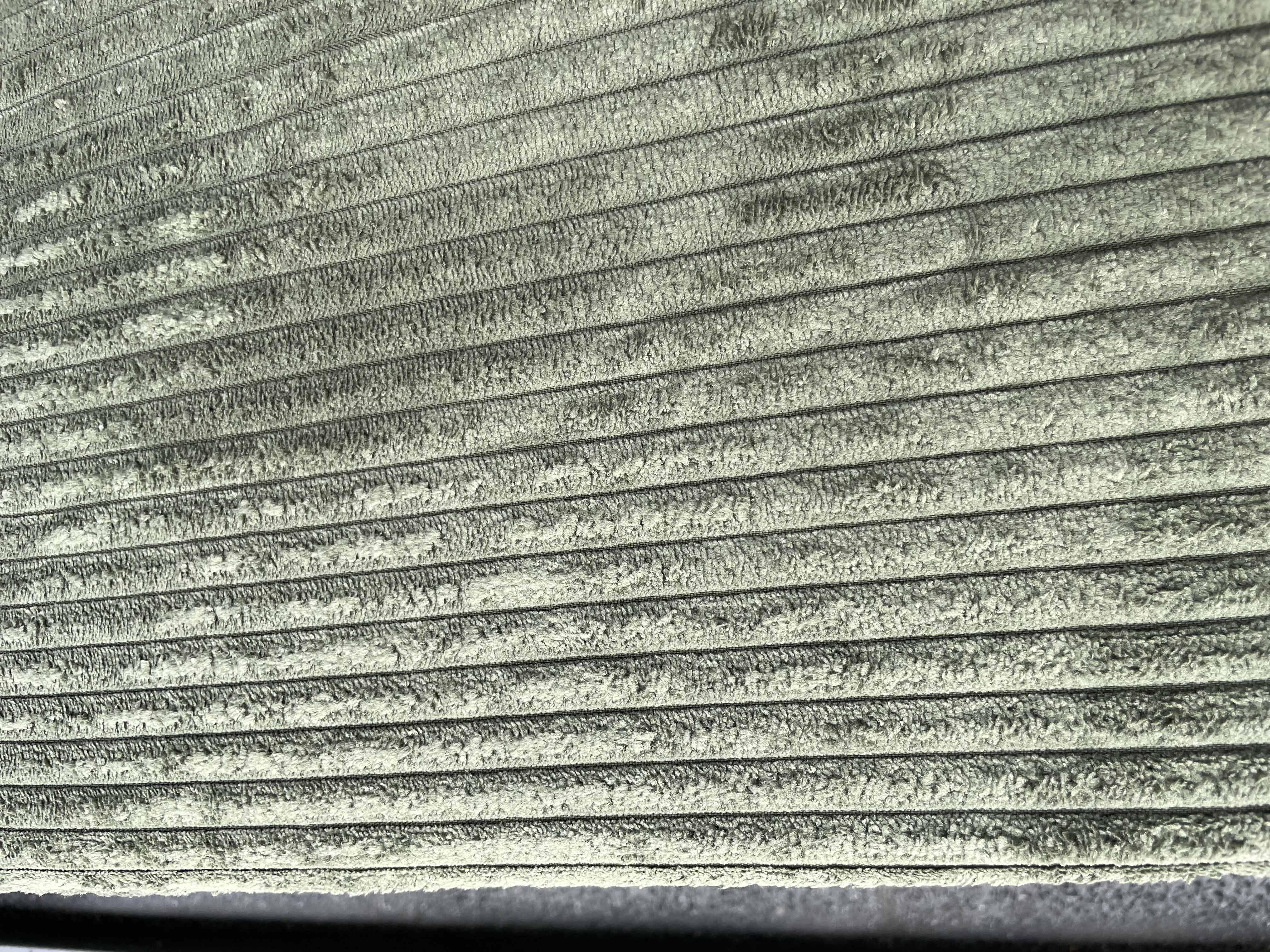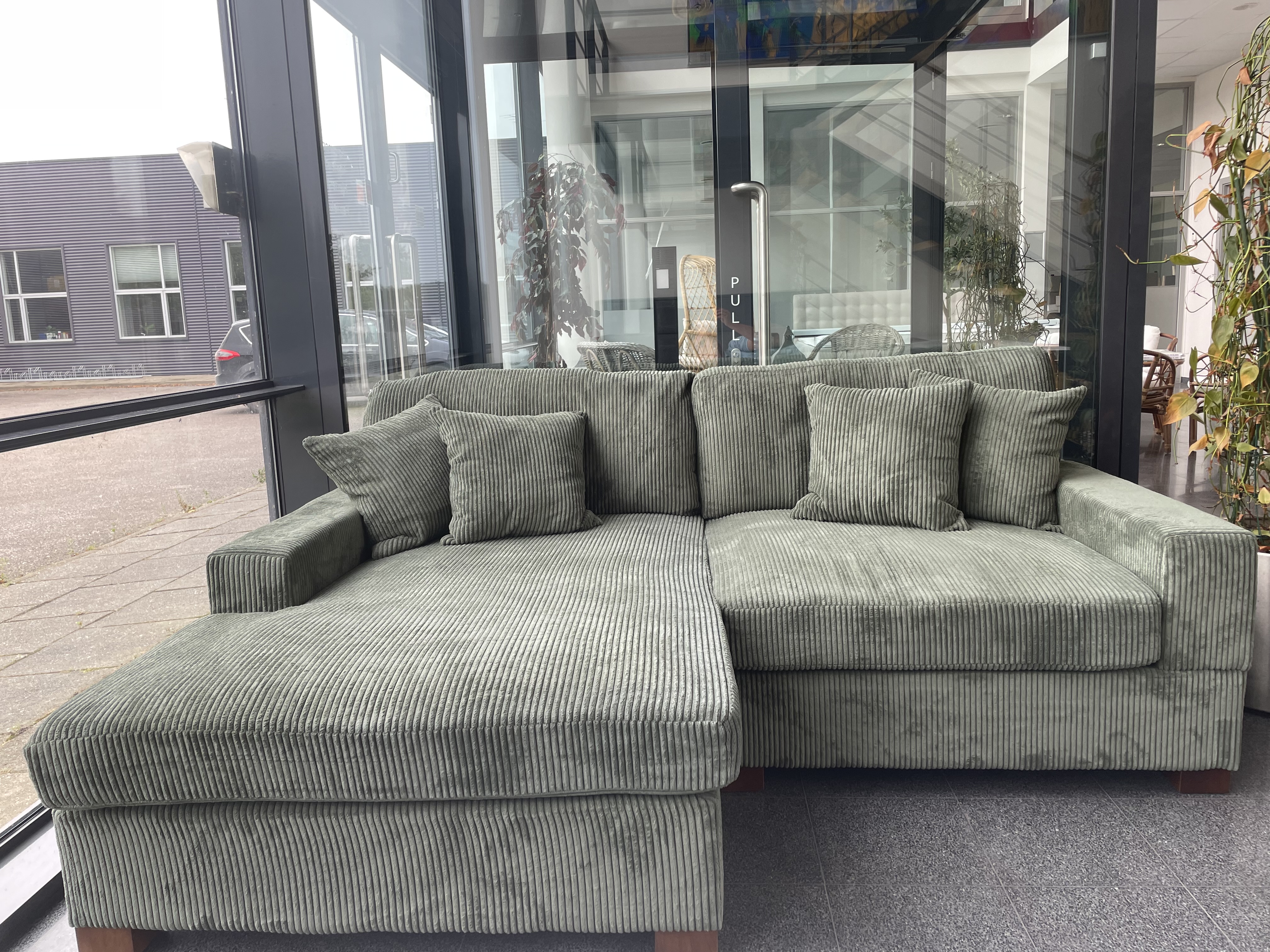 Chaiselong Sofa i oliven grøn fløjl. Fjeder i sæde og med skum ryg. Ben træ/bejdset.