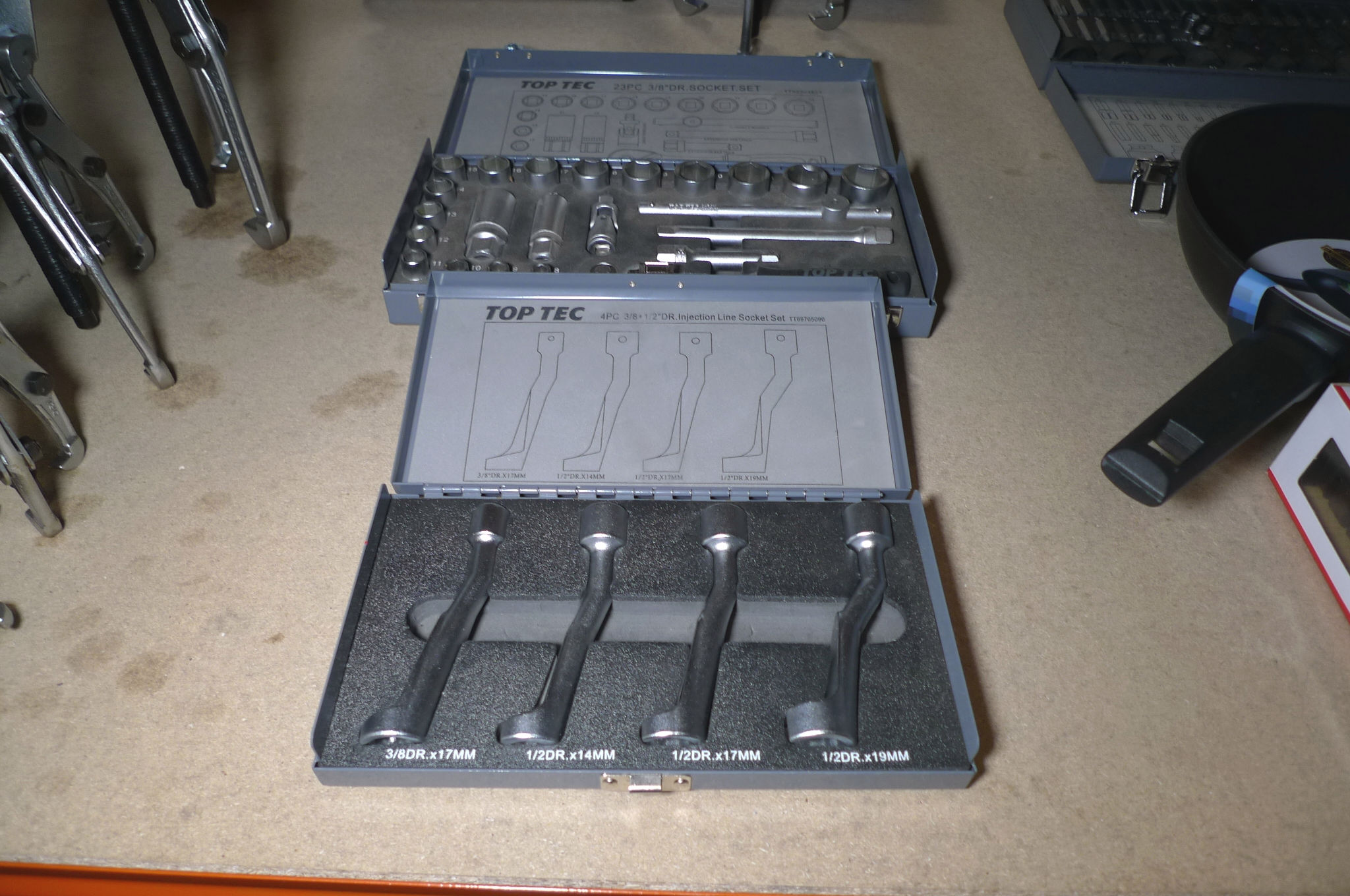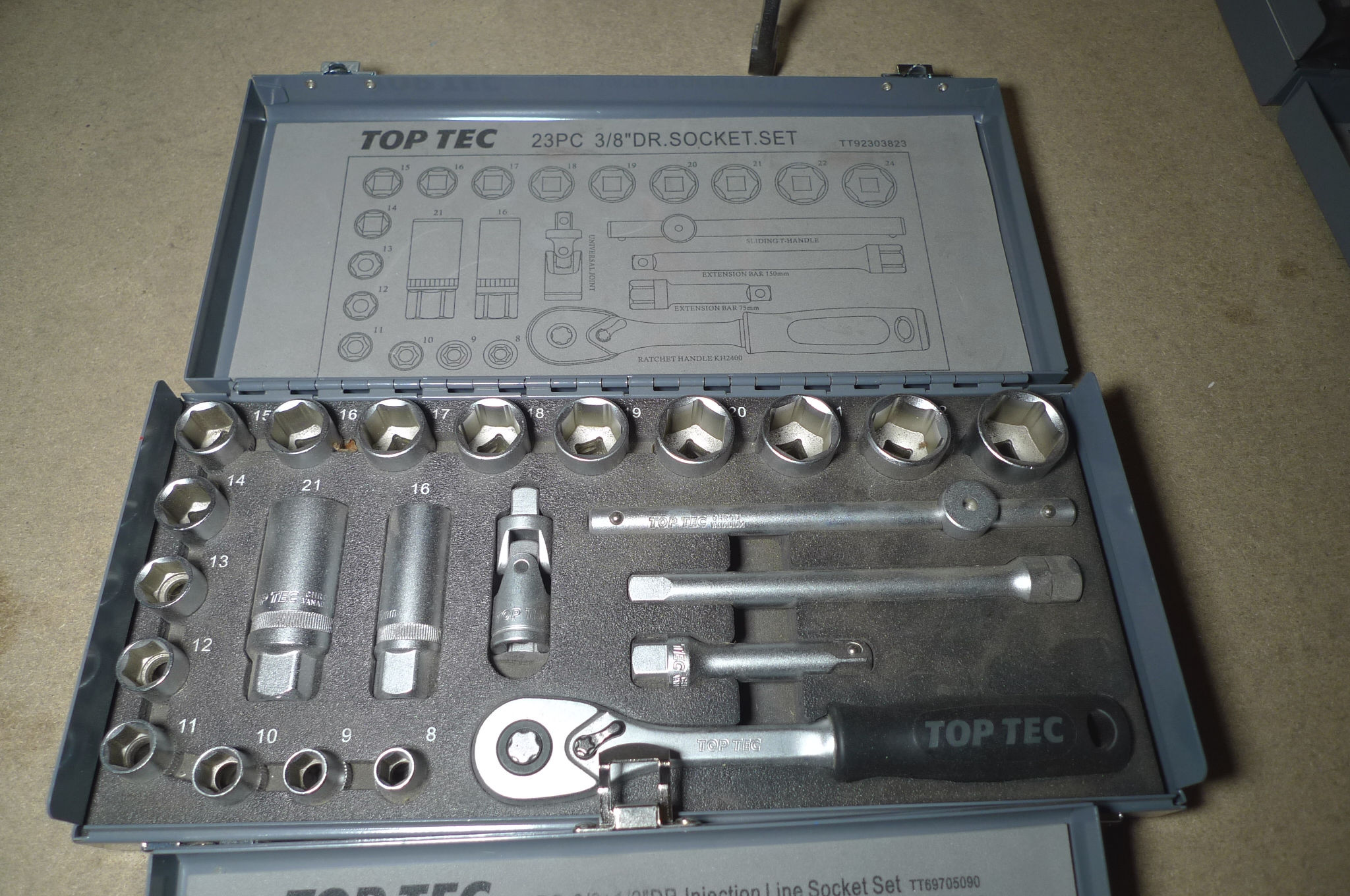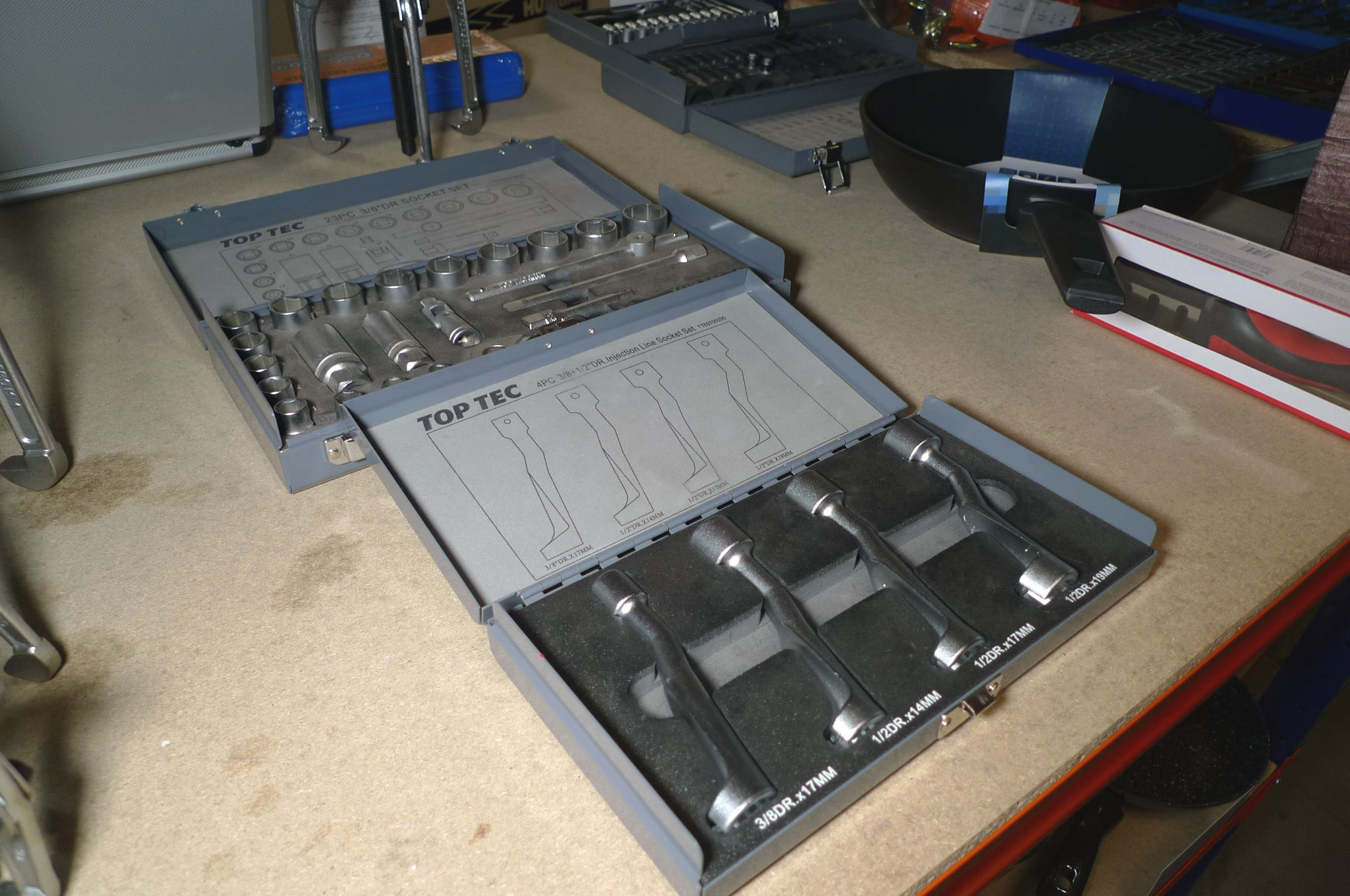 23 dele topnøglesæt 3/8" + 4 stk. injection line socket set dysetoppe. Ubrugt.