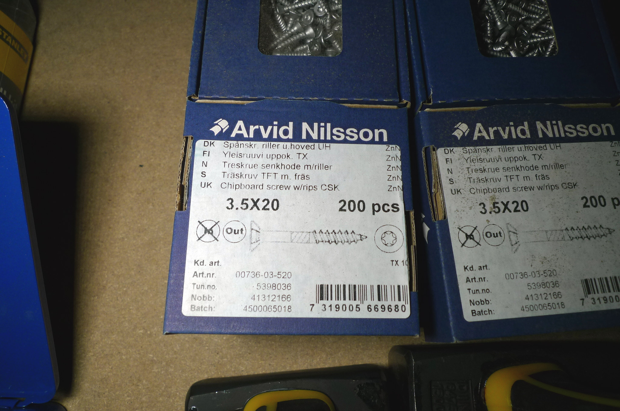 12x 200 stk. skruer 3,5x20mm TX10 + 2 stk. hamre. Mukkerter 1000/1500. Ubrugt.