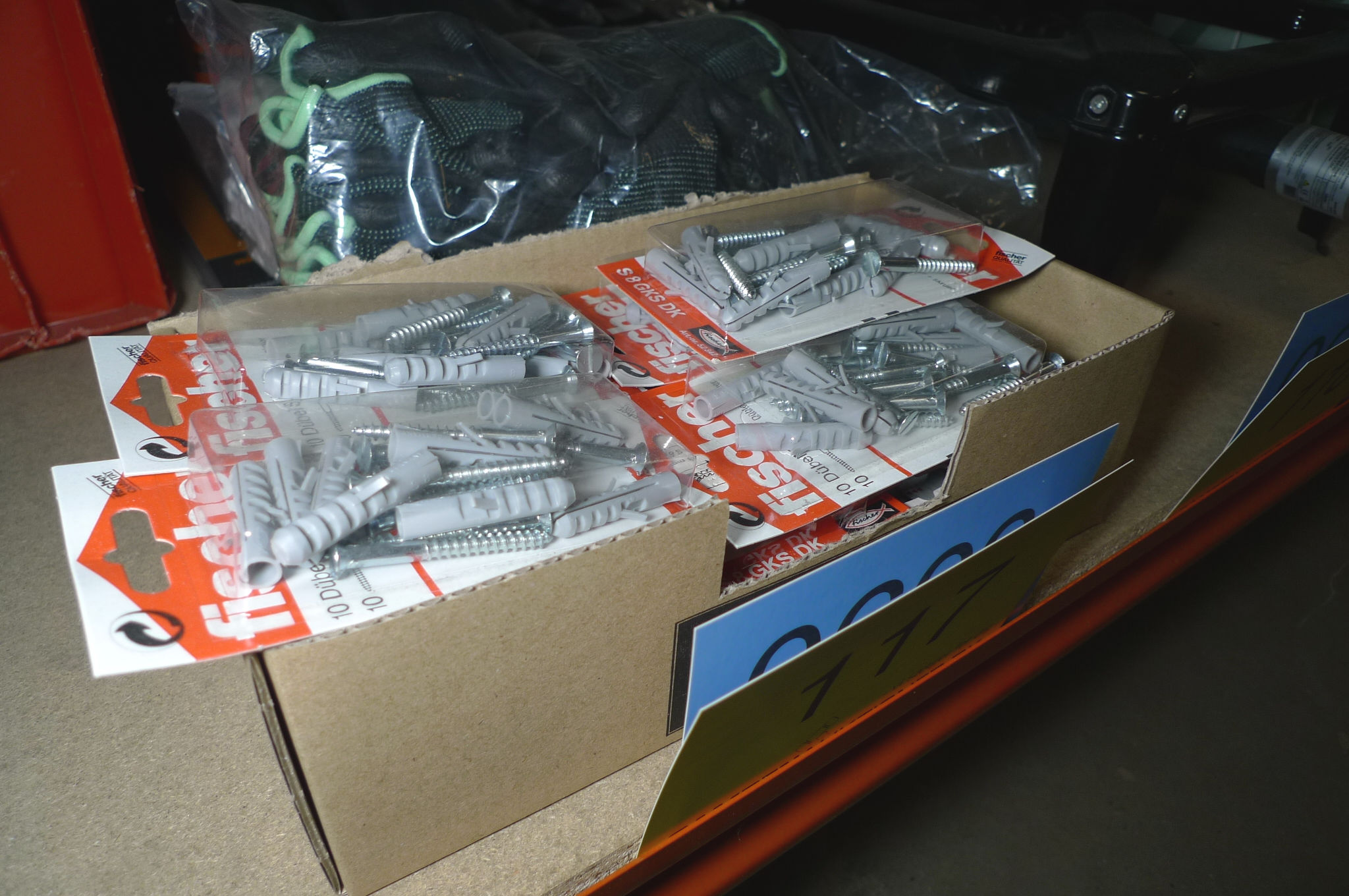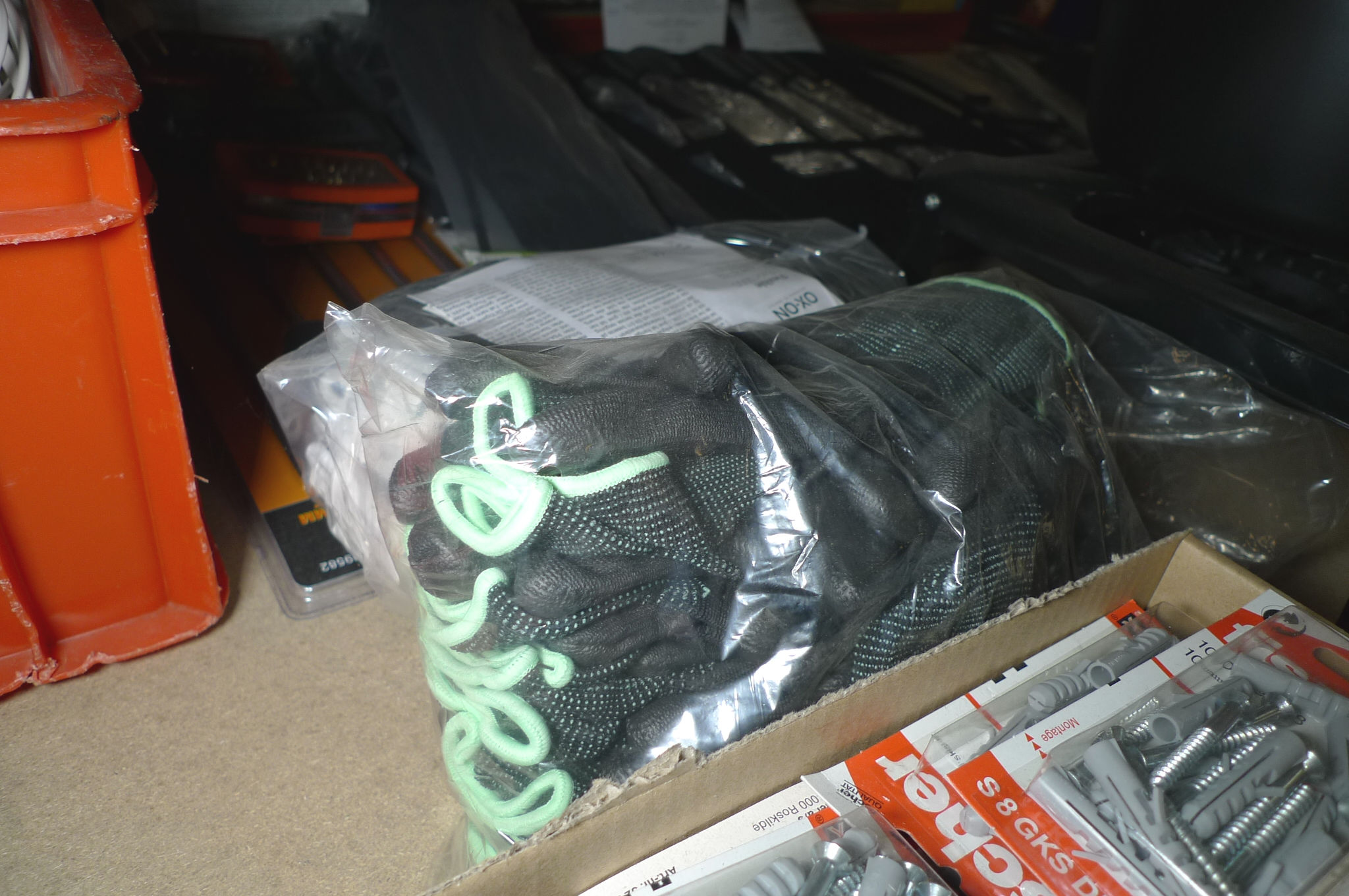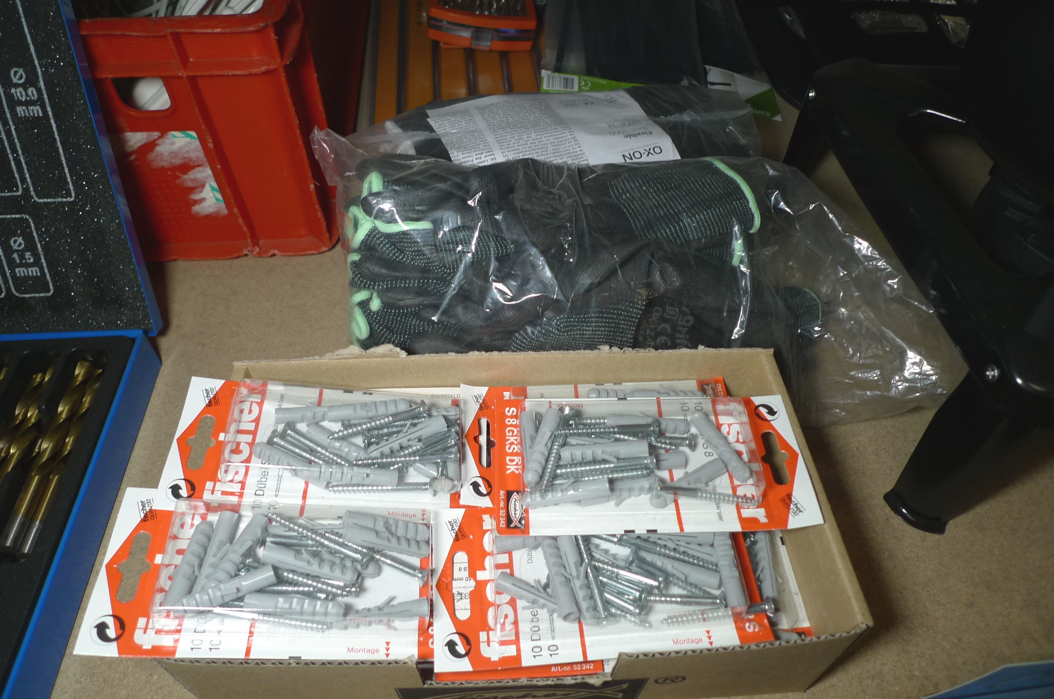 Kasse m/rawplugs + 24 par montagehandsker. Ubrugt.
