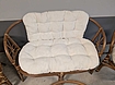 Loungesæt i natur rattan bestående af 1 sofa, 2 lænestole samt sofabord med glasplade. Sofa og lænestole med løse hynder og rygpude.