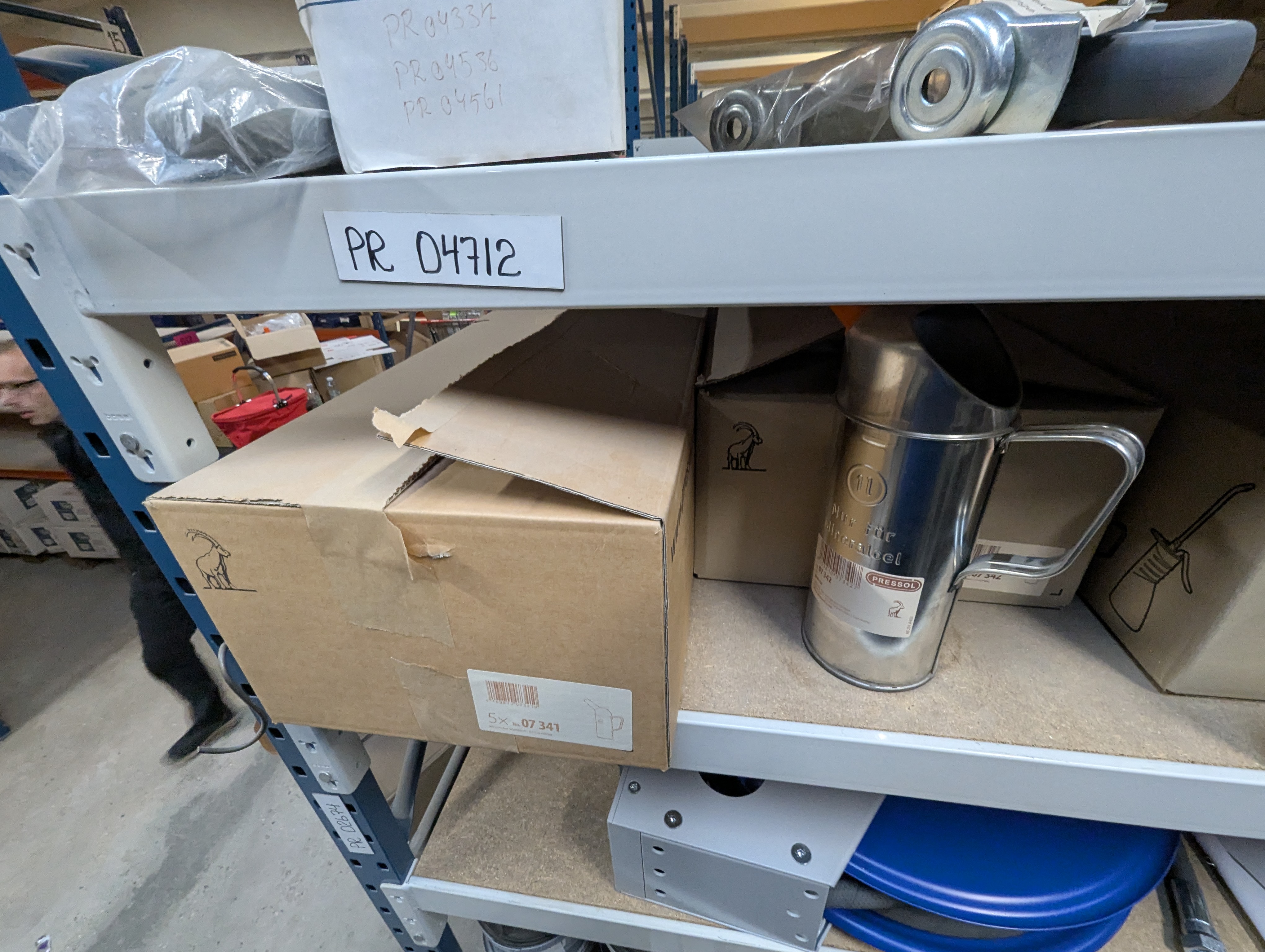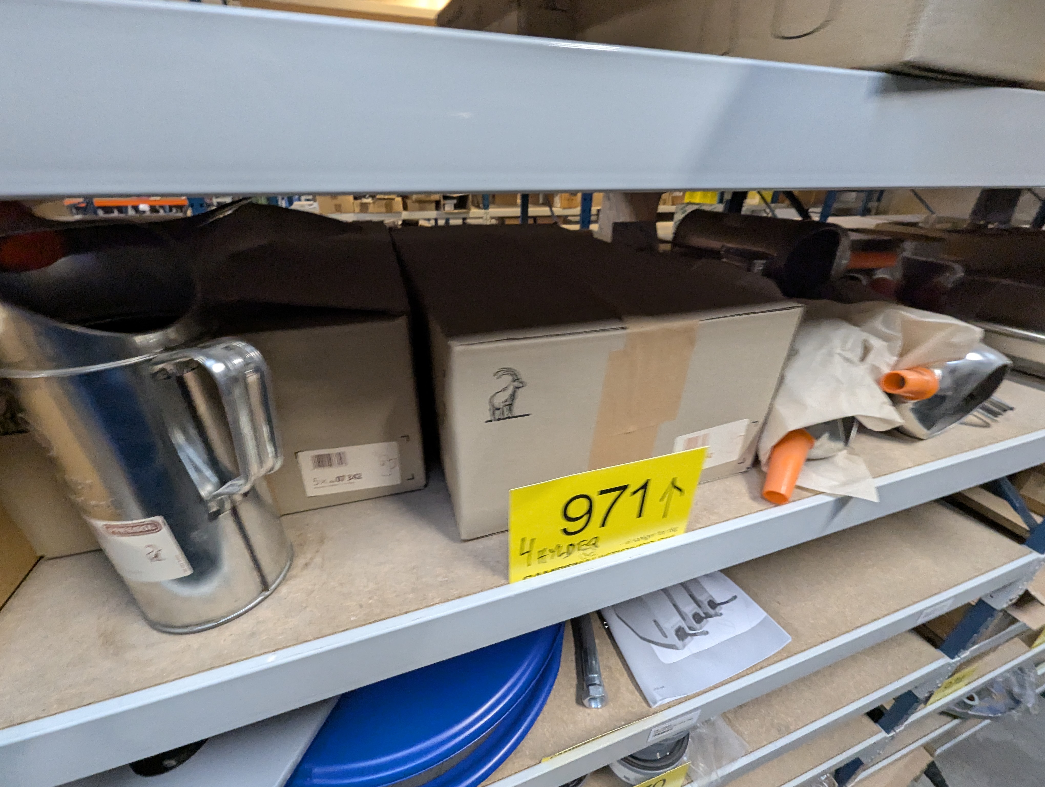 971. 4 hylder med div. Smørekander, tragte, sprayflasker m.m.