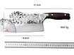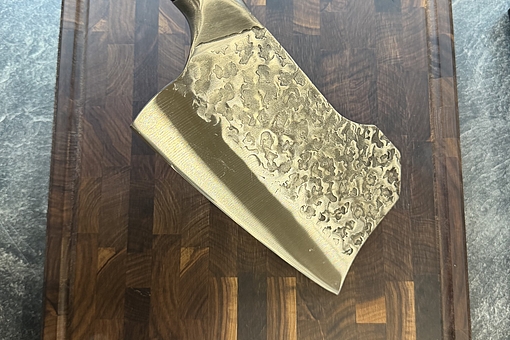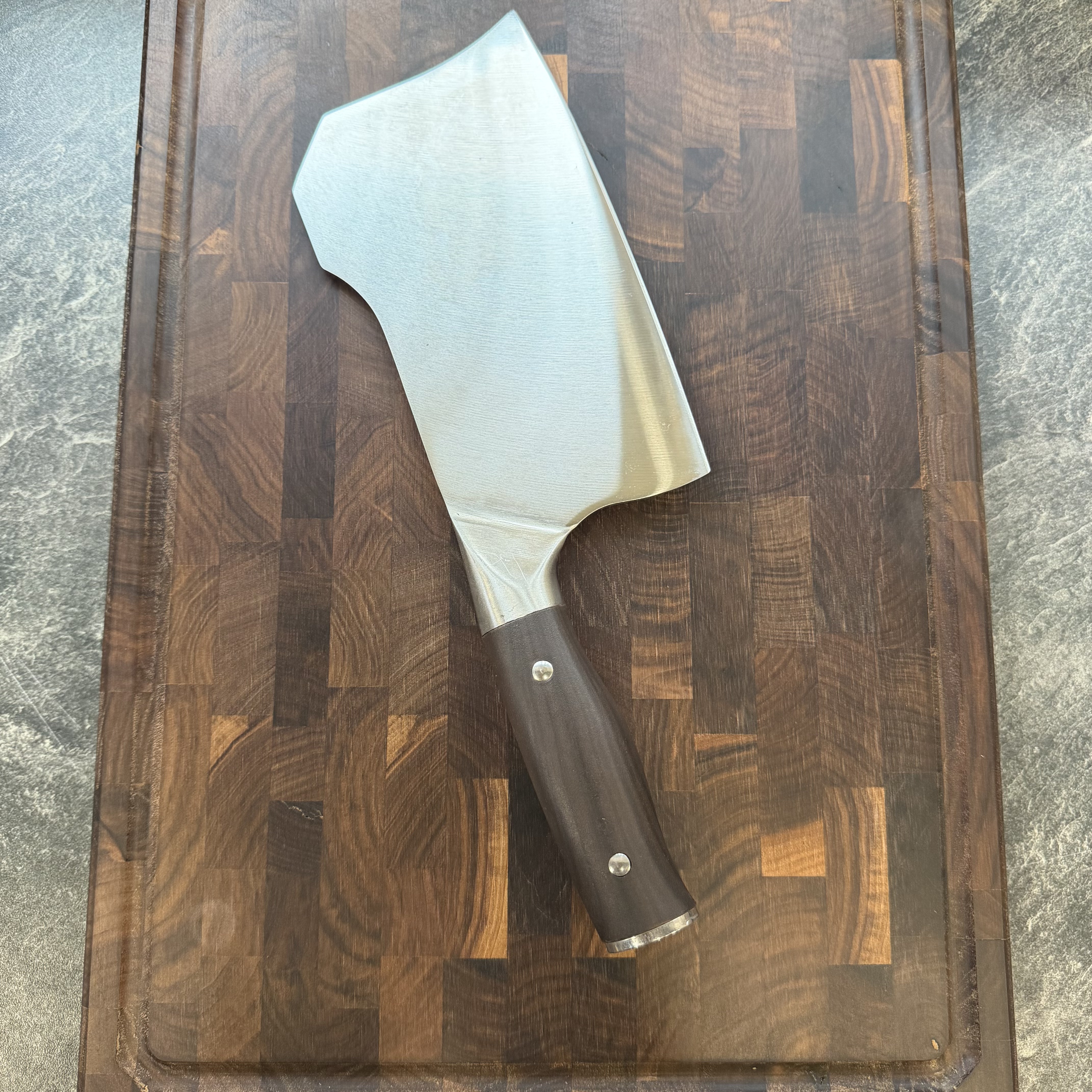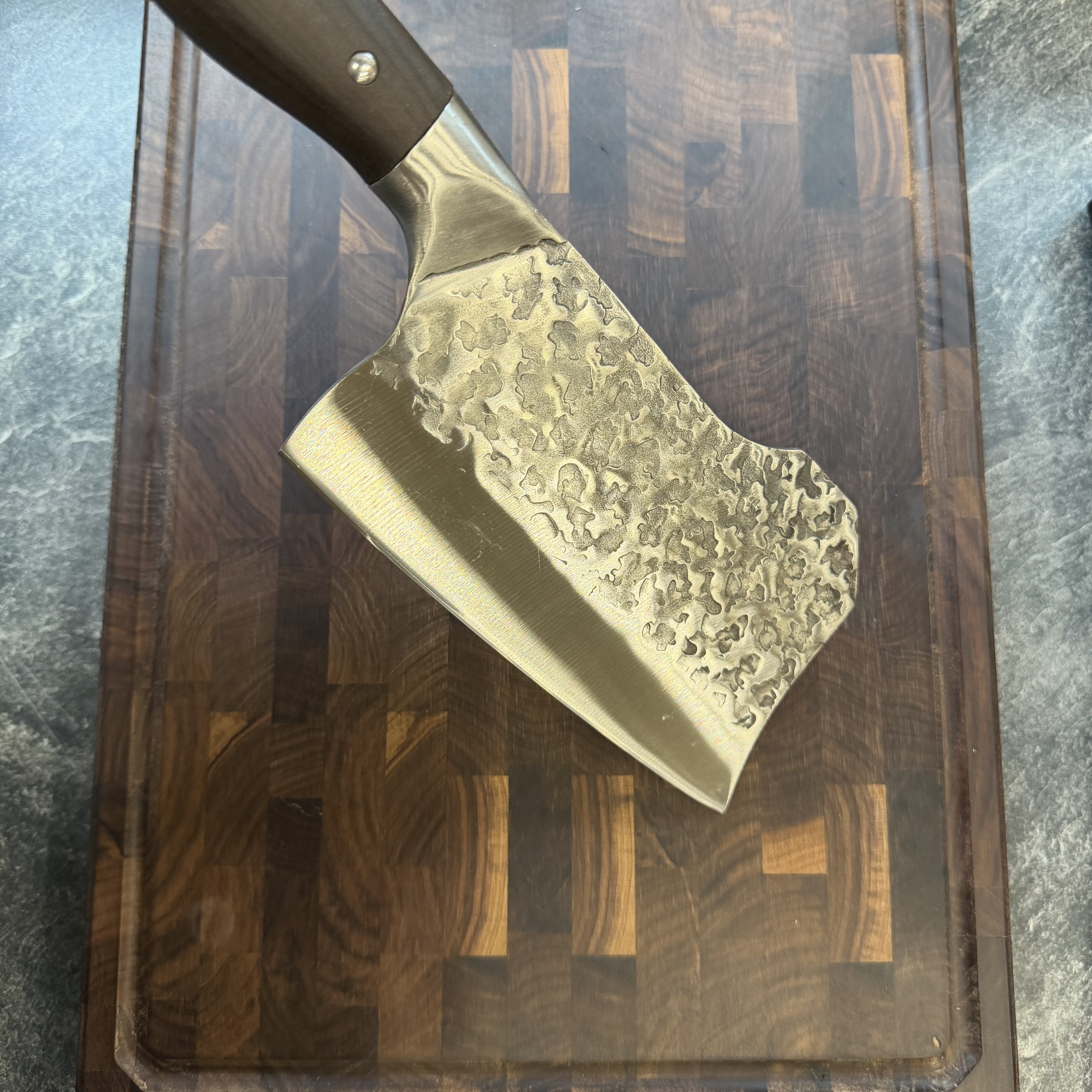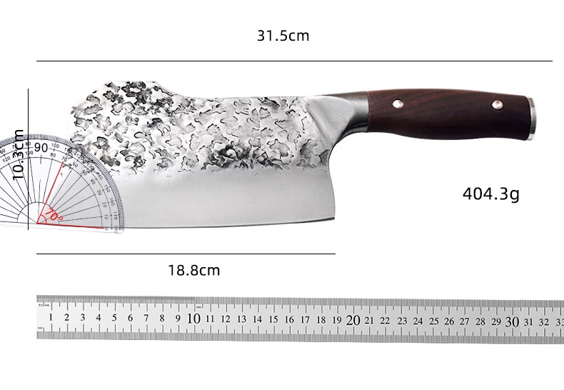 Klingelængde 18,8 cm, totallængde 31,5 cm, klingetykkelse 2,5 mm, vægt 404 g, håndhamret overflade, mørkt træhåndtag