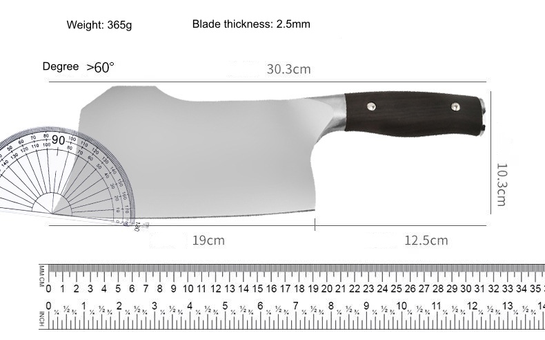 Klingelængde 19 cm, totallængde 30,3 cm, klingetykkelse 2,5 mm, vægt 365 g, mørkt træhåndtag