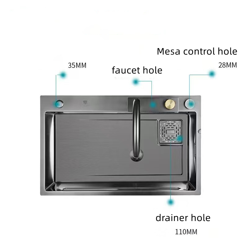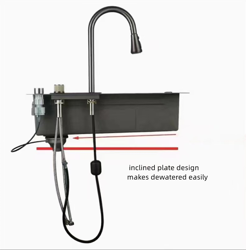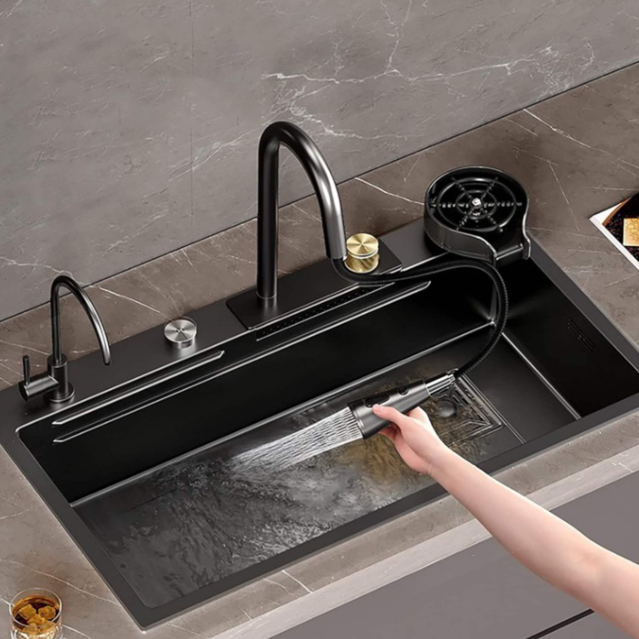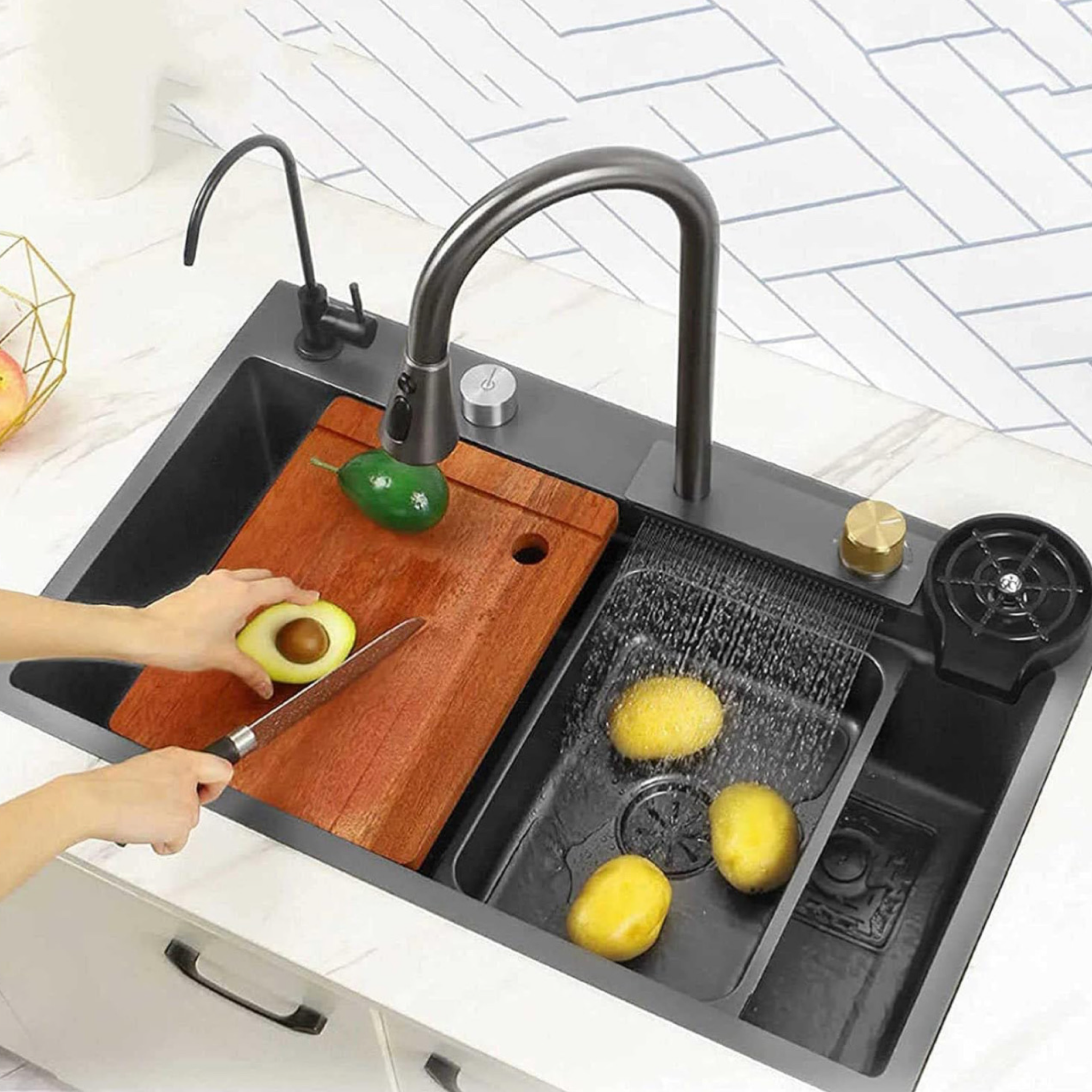 Moderne og multifunktionel vask designet til at passe perfekt ind i et køkken med en stilfuld æstetik og høj funktionalitet.