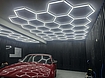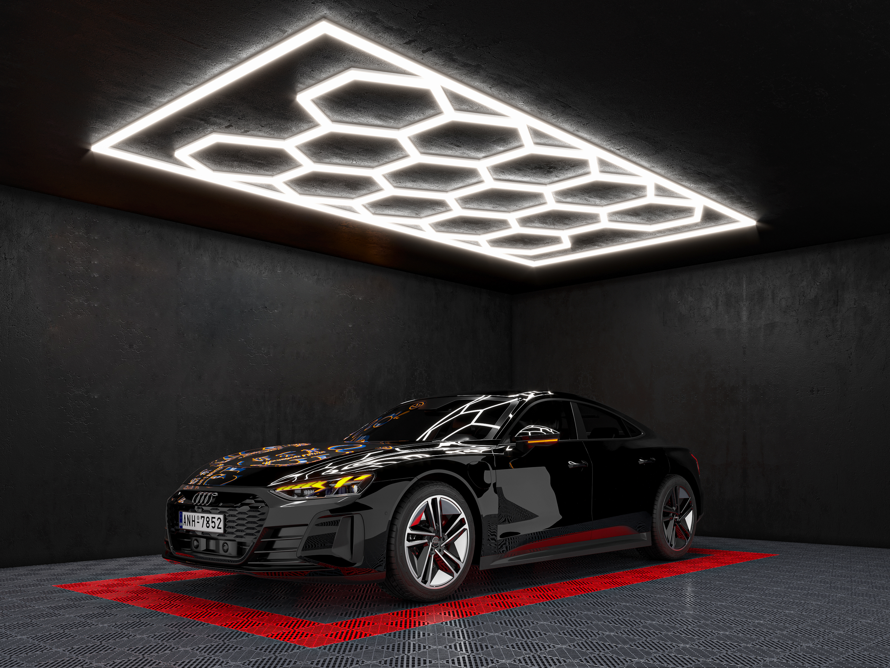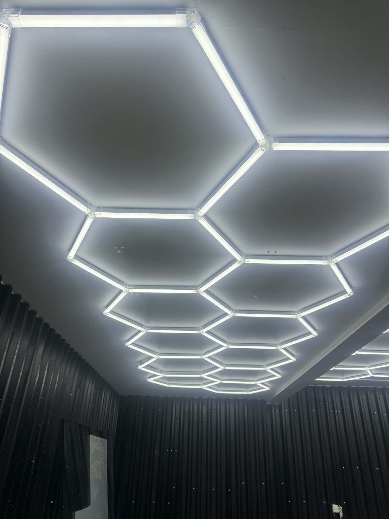 Modulært LED-system i et hexagonmønster med en robust aluminiumsramme. Aluminiumskonstruktionen giver betydeligt bedre stabilitet end plastik og fungerer samtidig som en effektiv varmeleder, hvilket bidrager til en længere levetid for LED-modulerne.