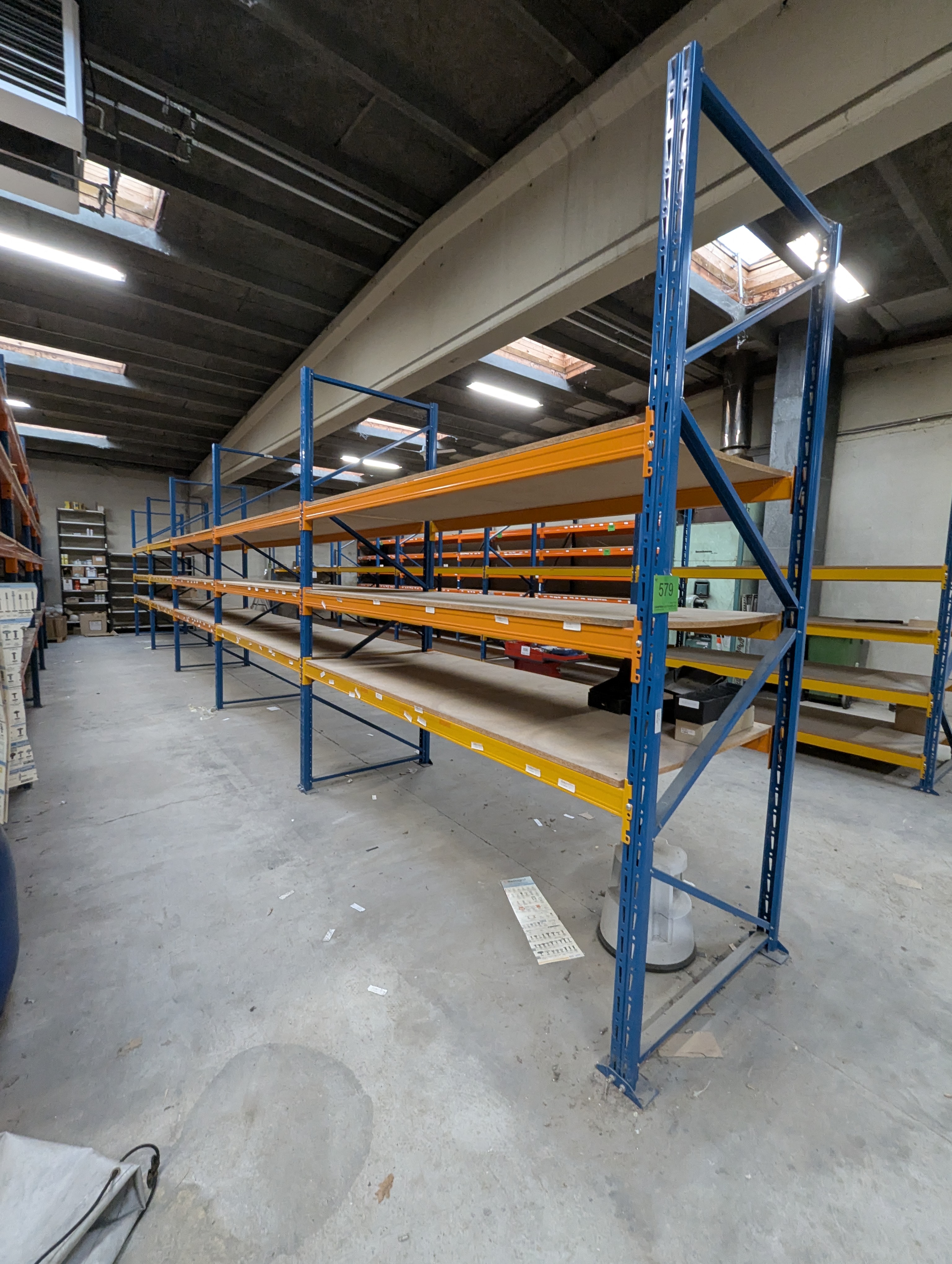 579. Palle reol Samlet længde ca. 14 M. Bredte 110 cm. Højde ca. 3m.