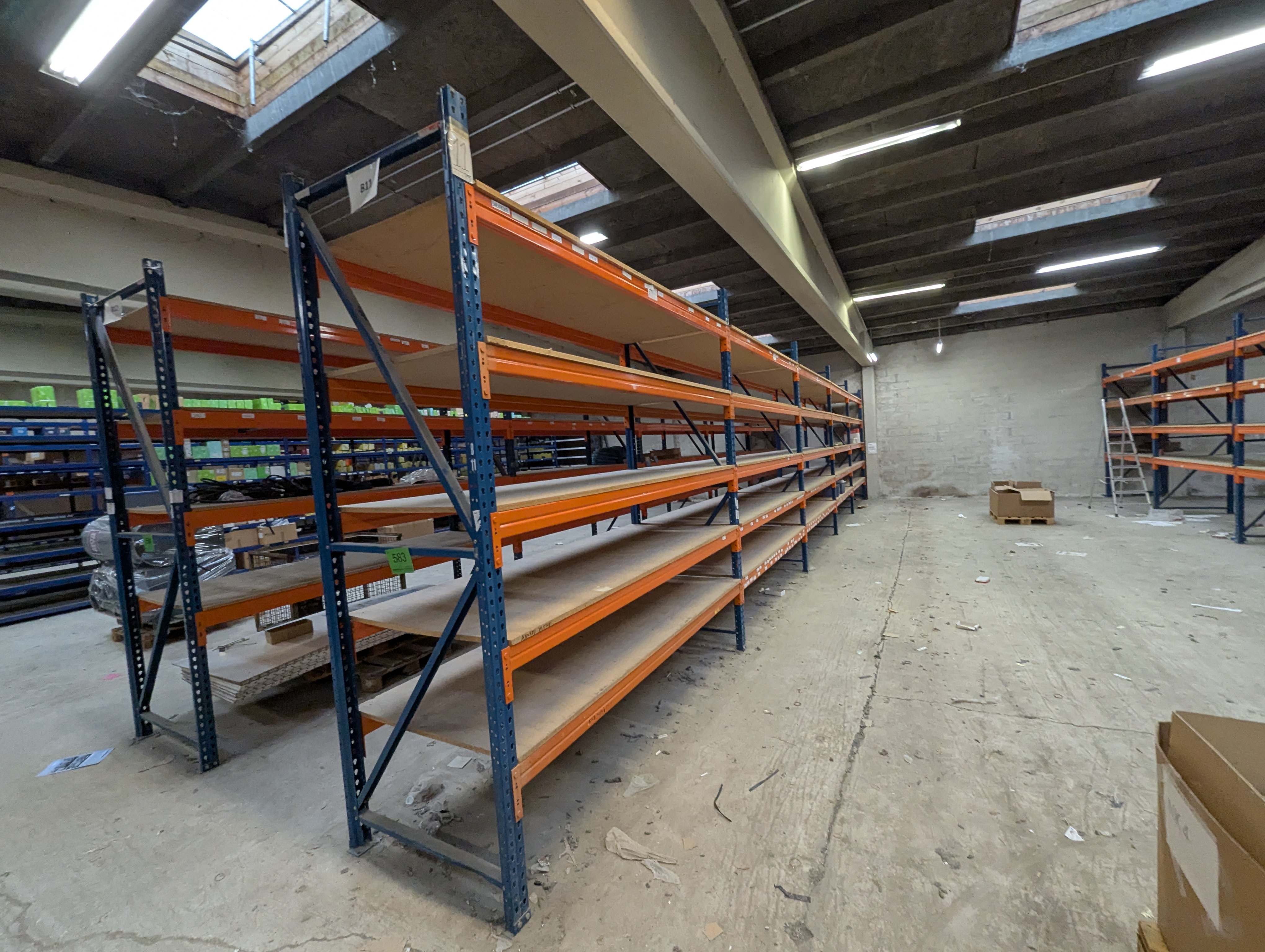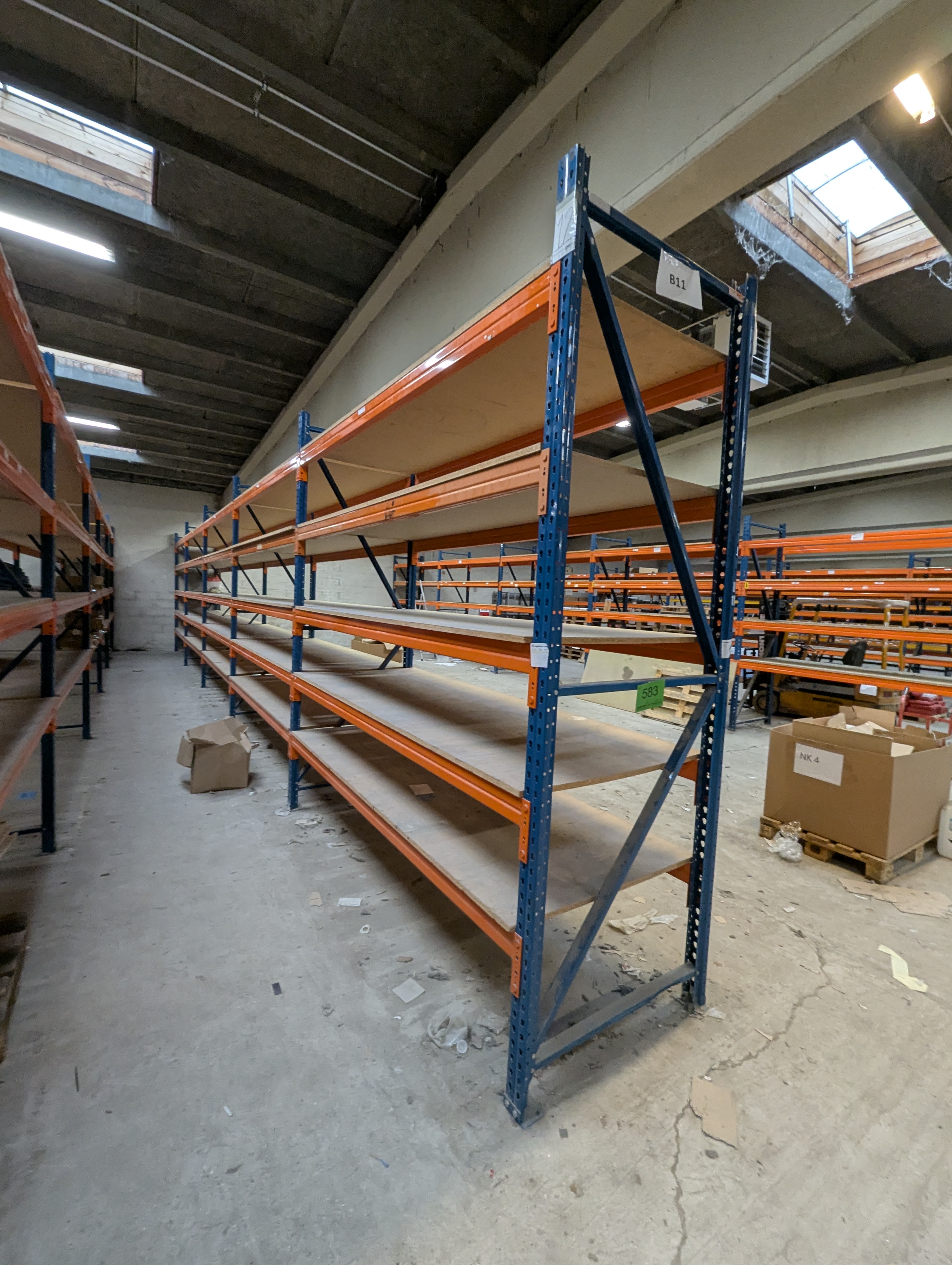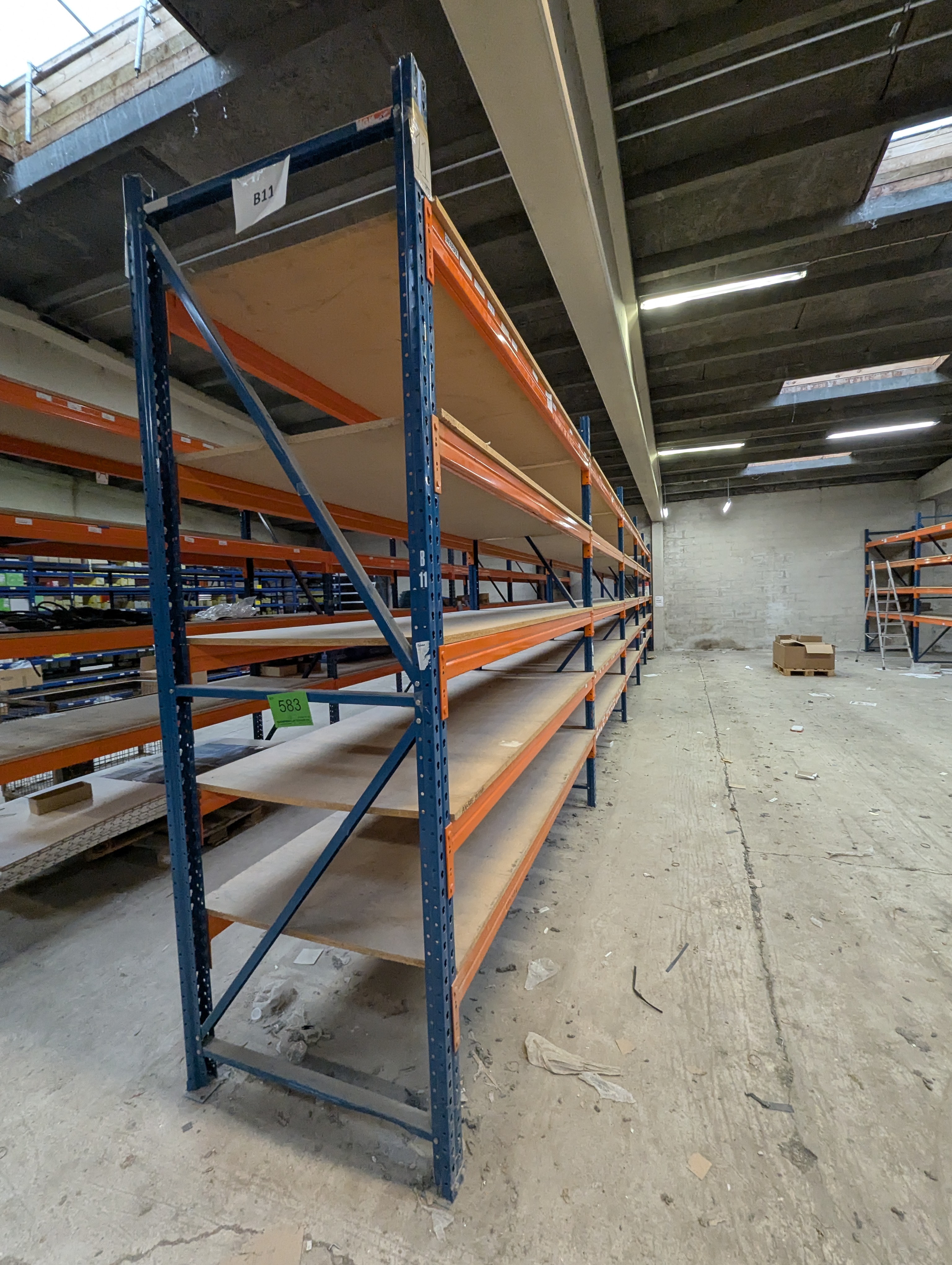 583. Palle reol Samlet længde ca. 14 M. Bredte 100 cm. Højde ca. 3m