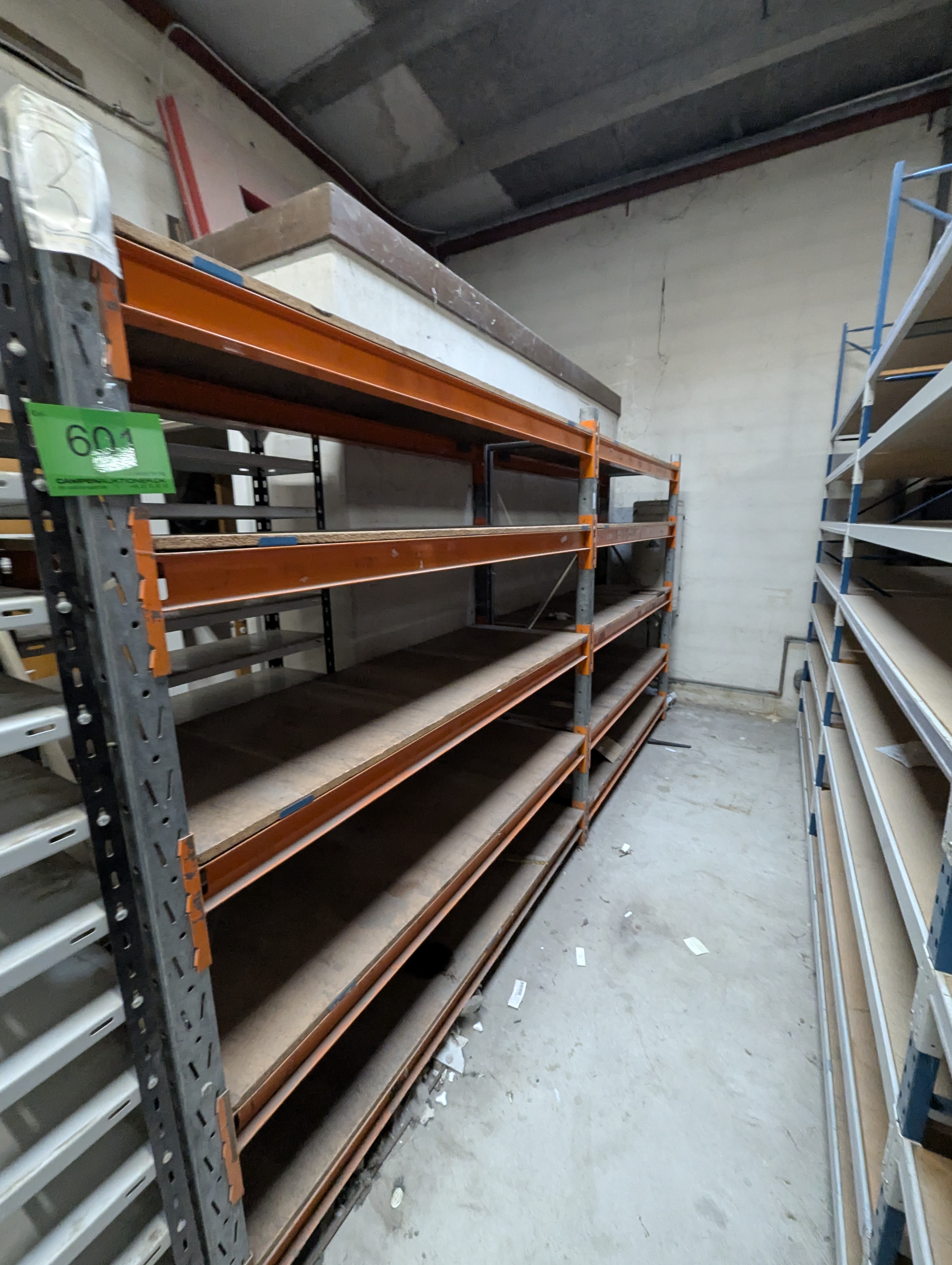 601. Kraftig lager reol længde 3,8m Bredte 60 Højde 2,1 m. ca.