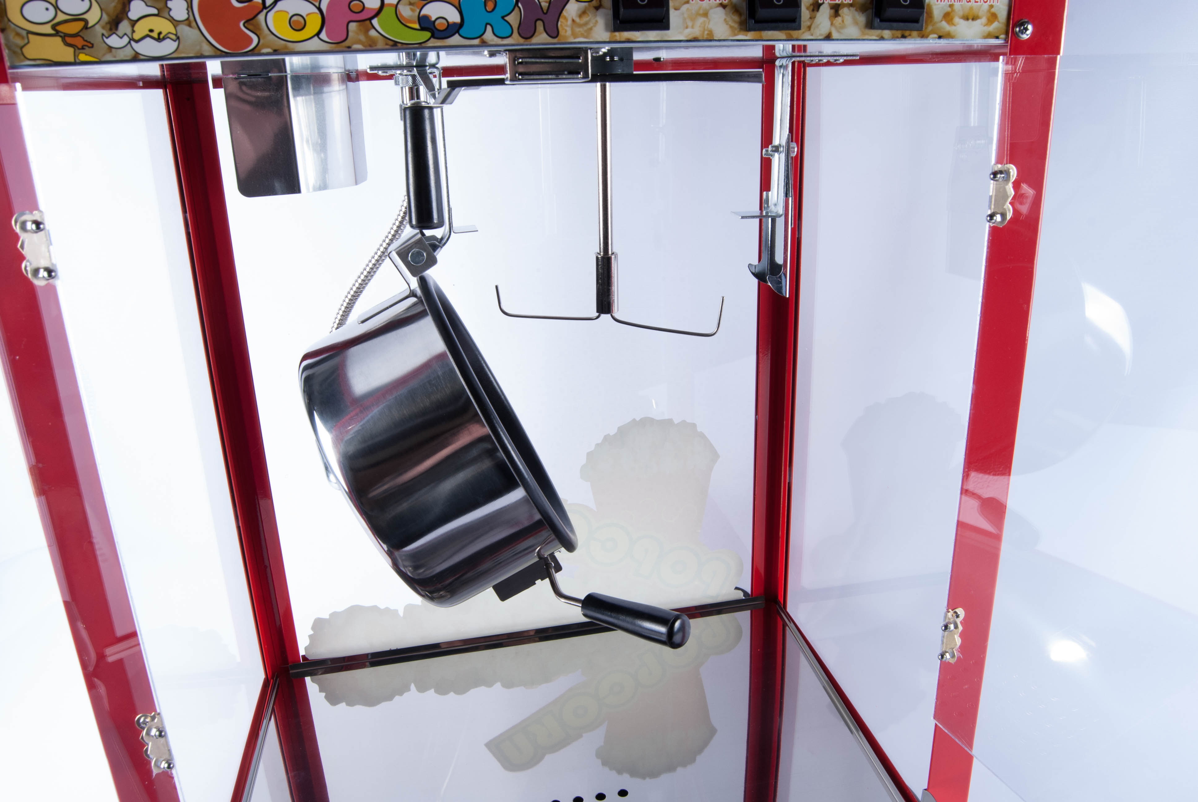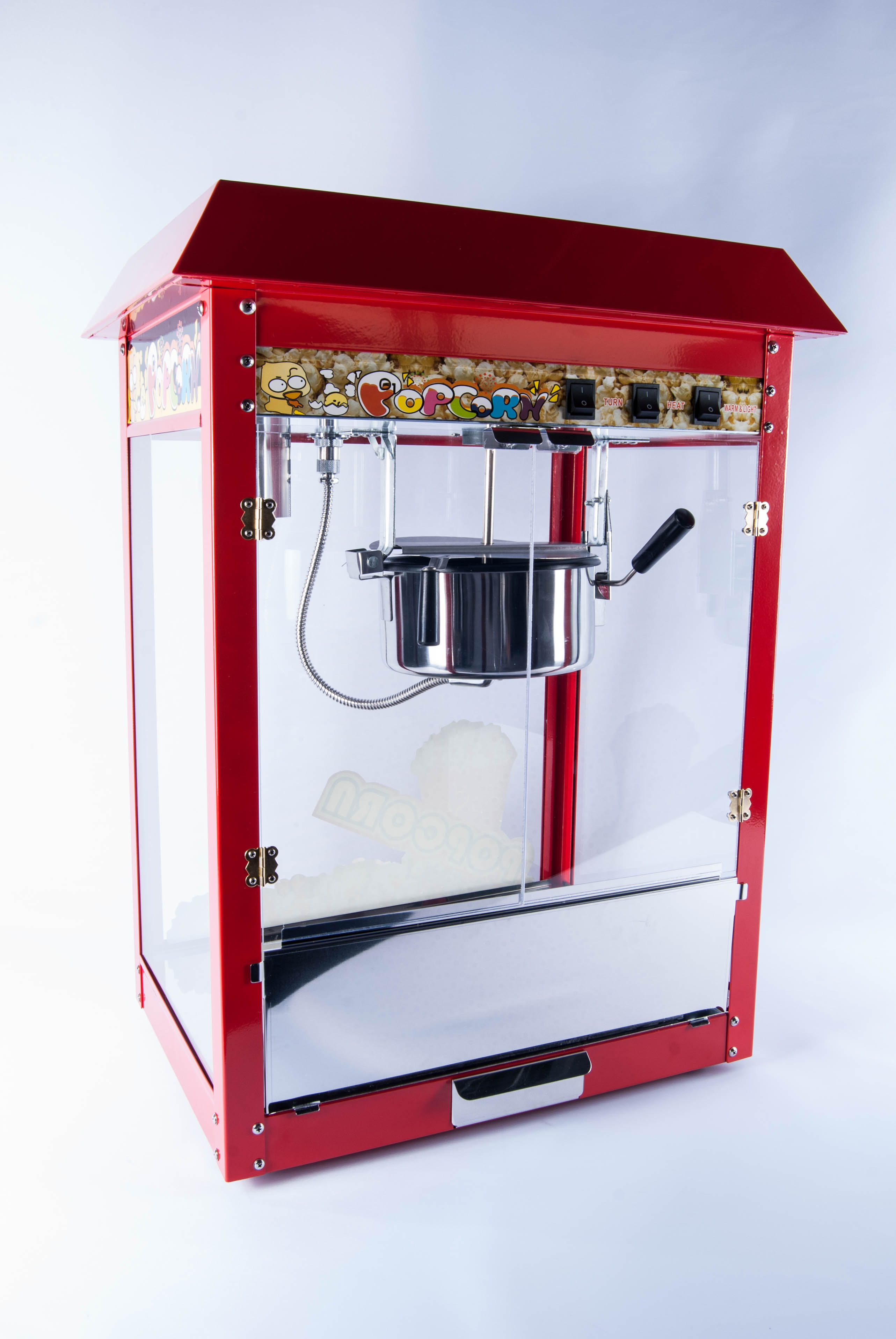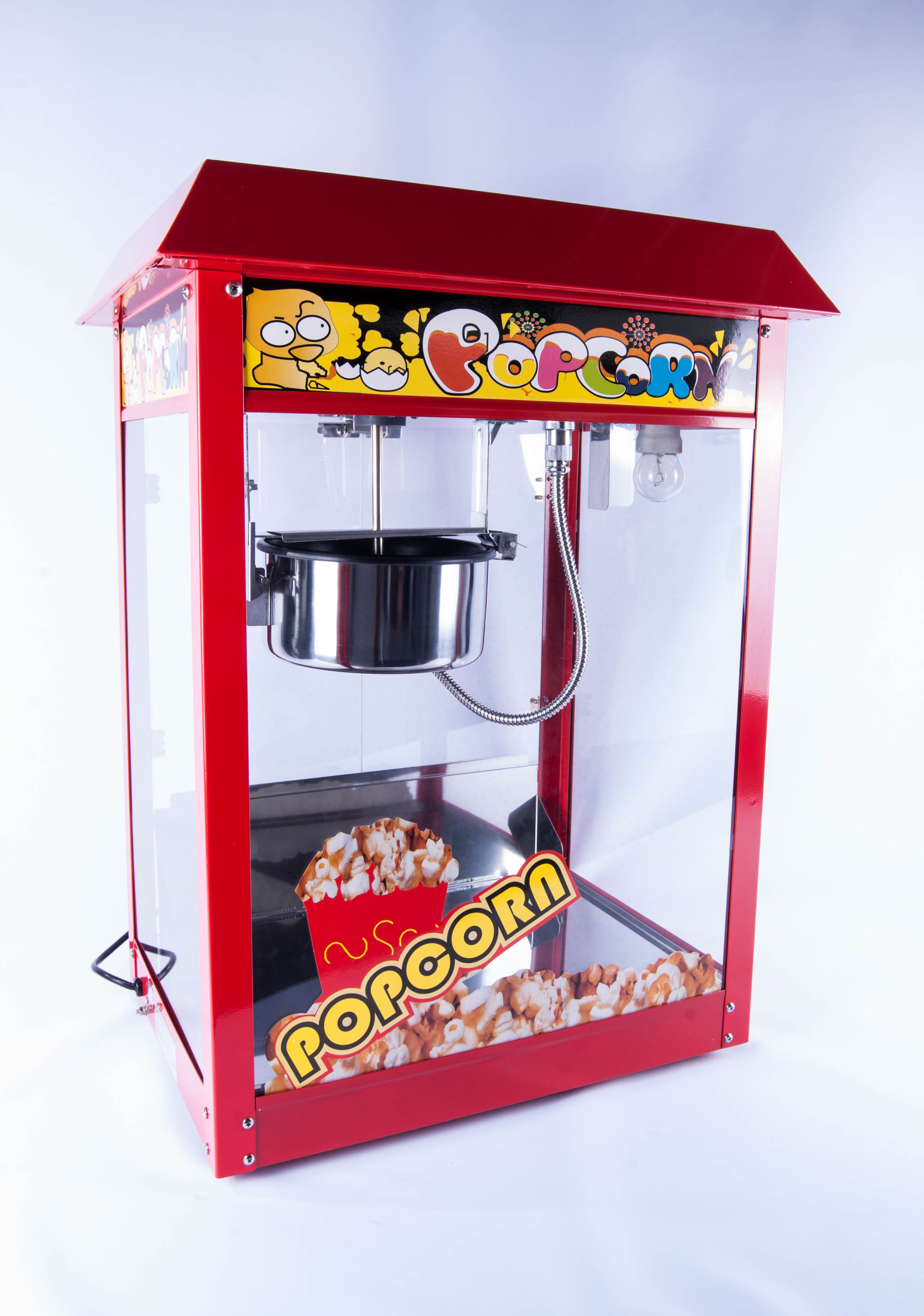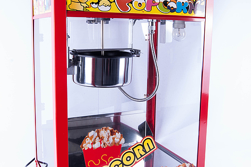 Rød popcorn maskine til både professionelt samt privat brug. Modellen er fødevaregodkendt. Maskinen er udført i en god kvalitet, i et autentisk ”tivoli” design. Størrelsen er 56 x 42 x 76 cm og den tilsluttes almindeligt 220v-240v/50-60 Hz. Maskinen kan producere op til 5 kg popcorn i timen med en aftagelig teflon belagt gryde som sikre en let rengøring. Samtidigt er drypbakken samt skuffelågen aftagelig og udført i rustfri stål. Rengøringen er derfor simpel og hurtigt overstået. Under bundbakken sidder der et varme element som holder popcornene varme. Ubrugt.