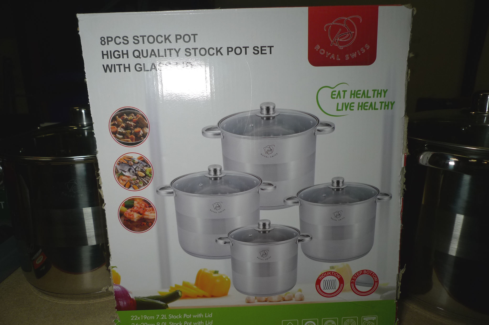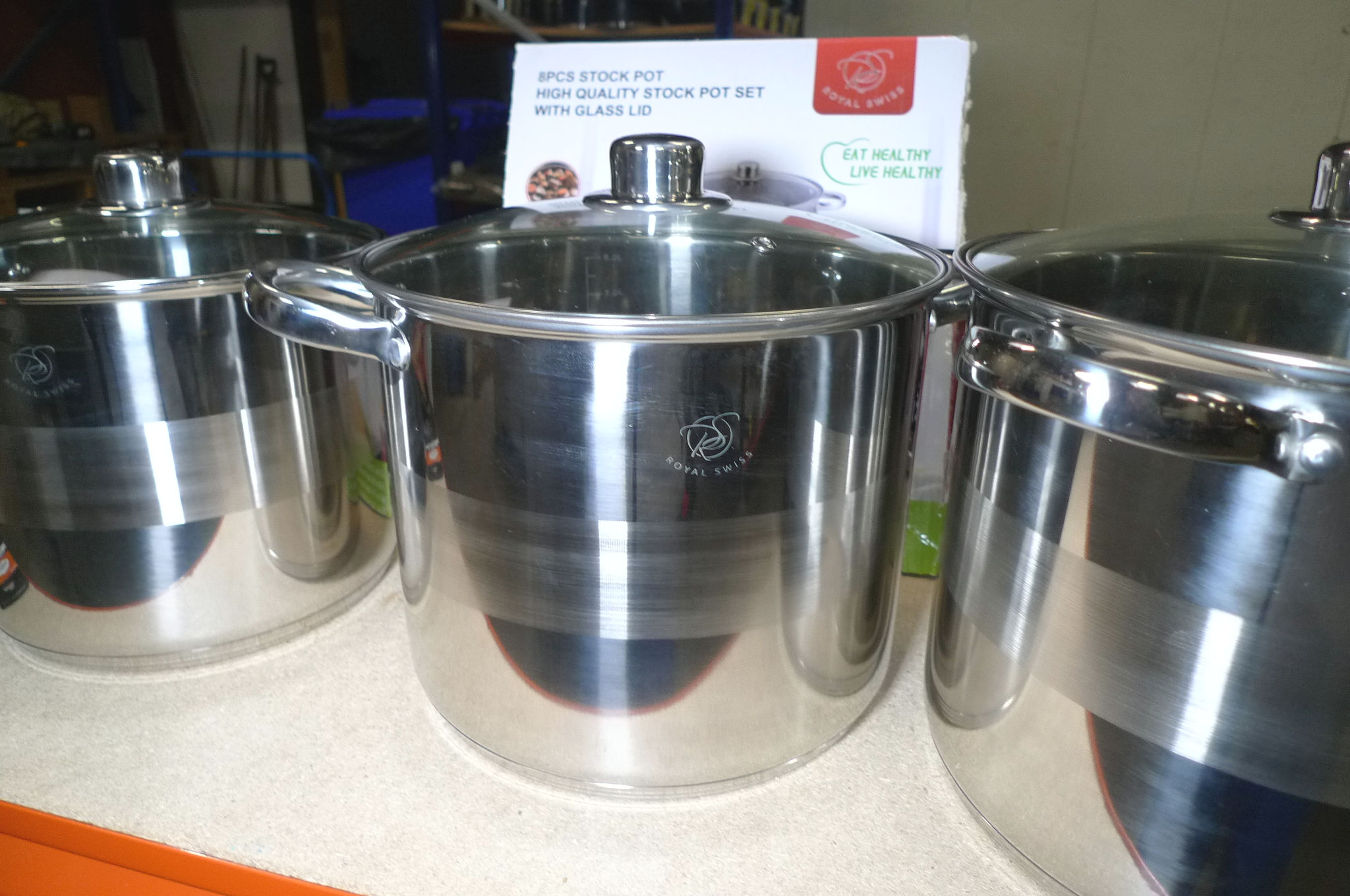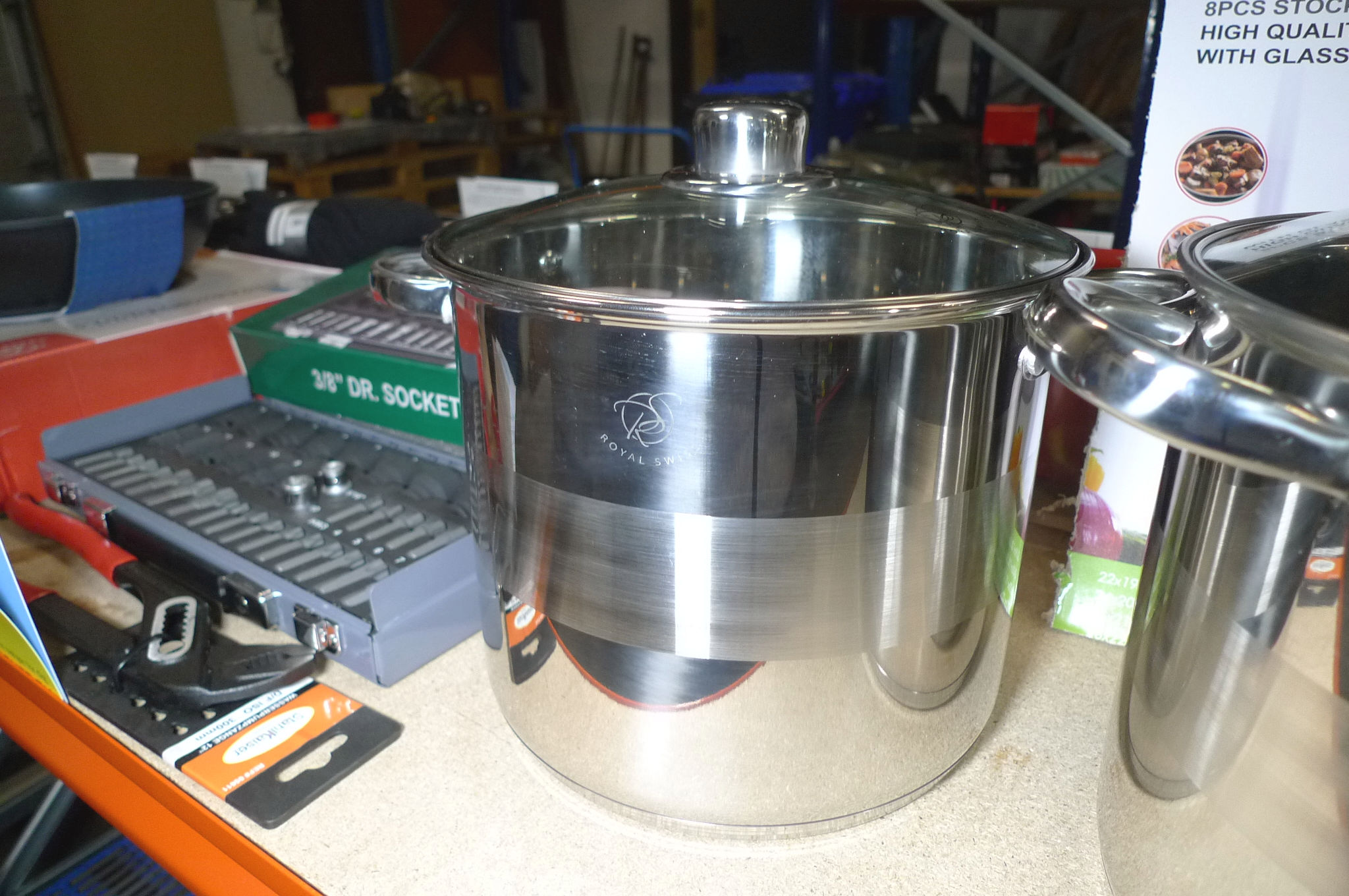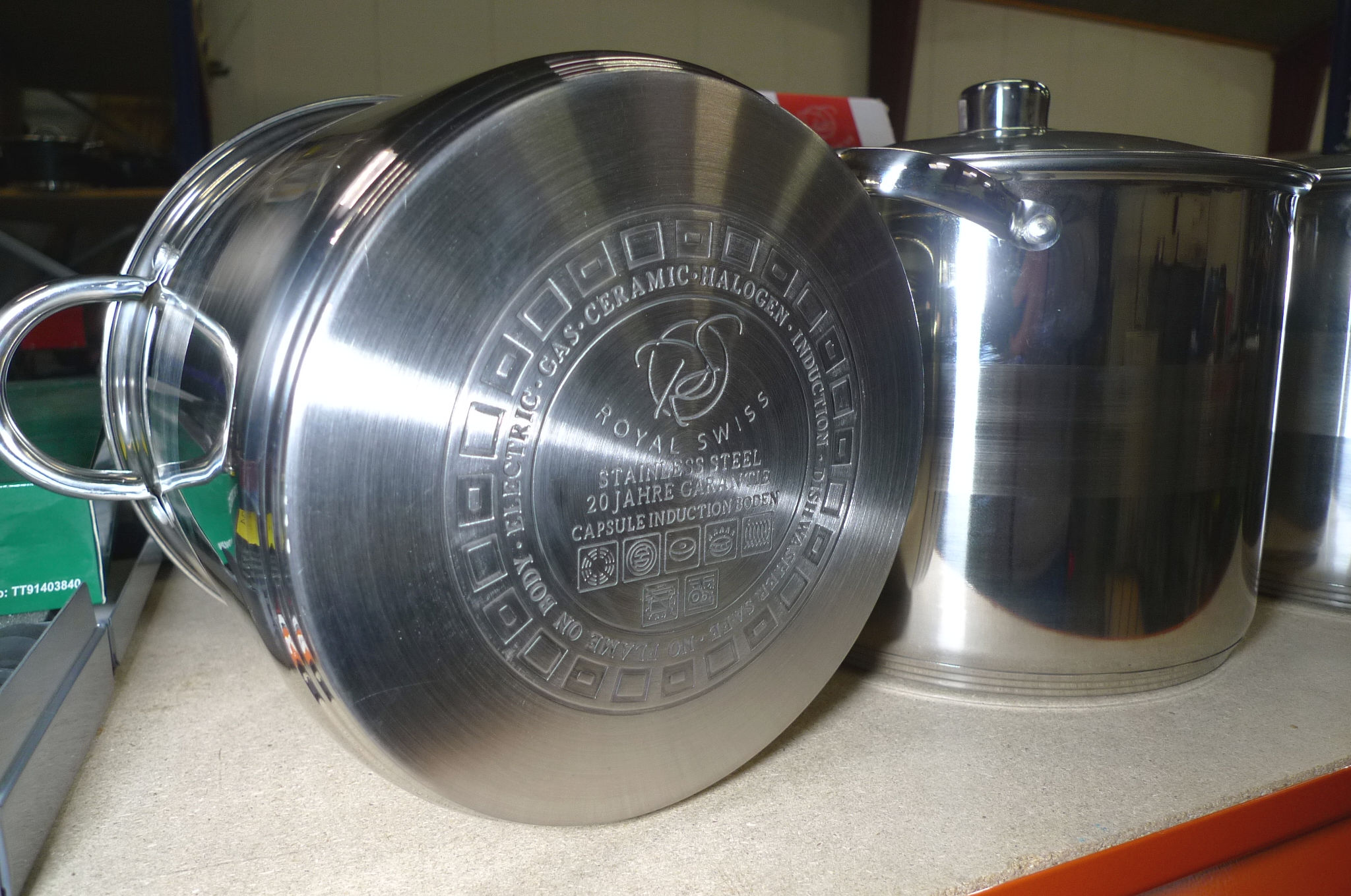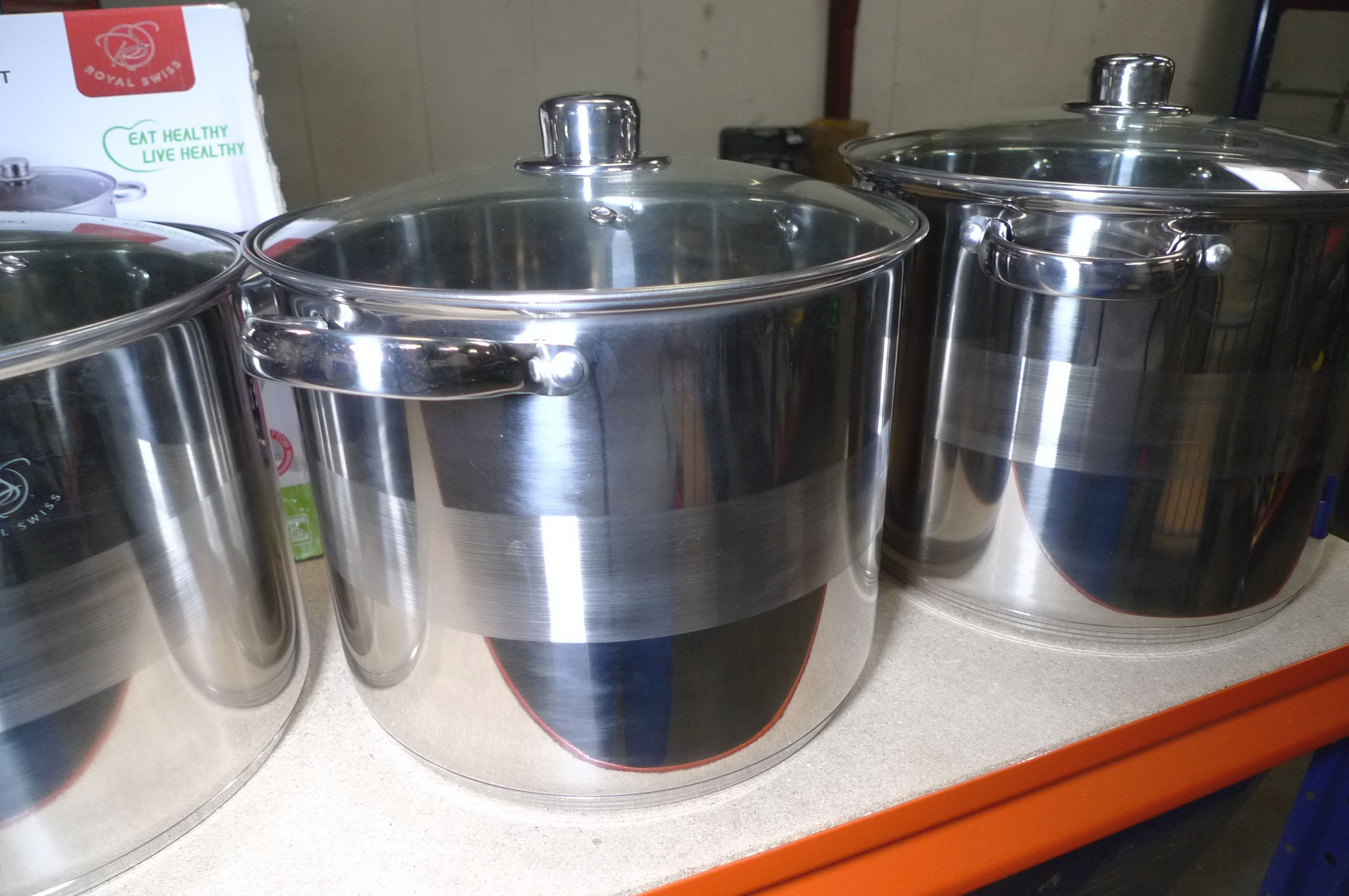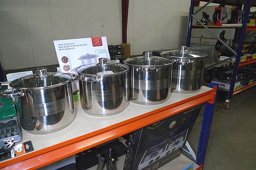 4 stk. store stålgryder, ca. ø23, 25, 27 og 29cm. Ubrugt.