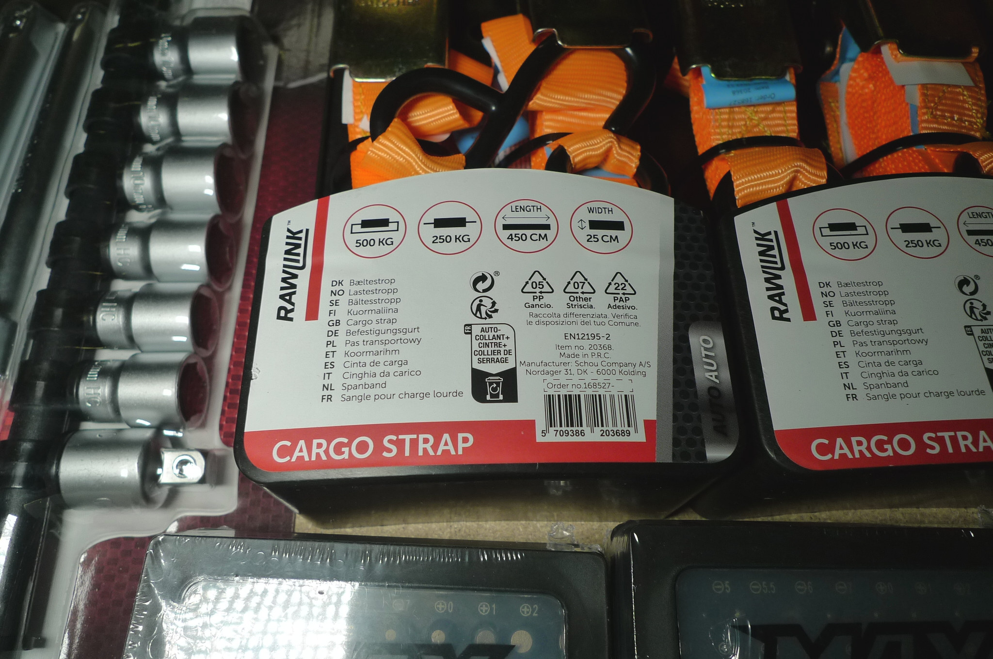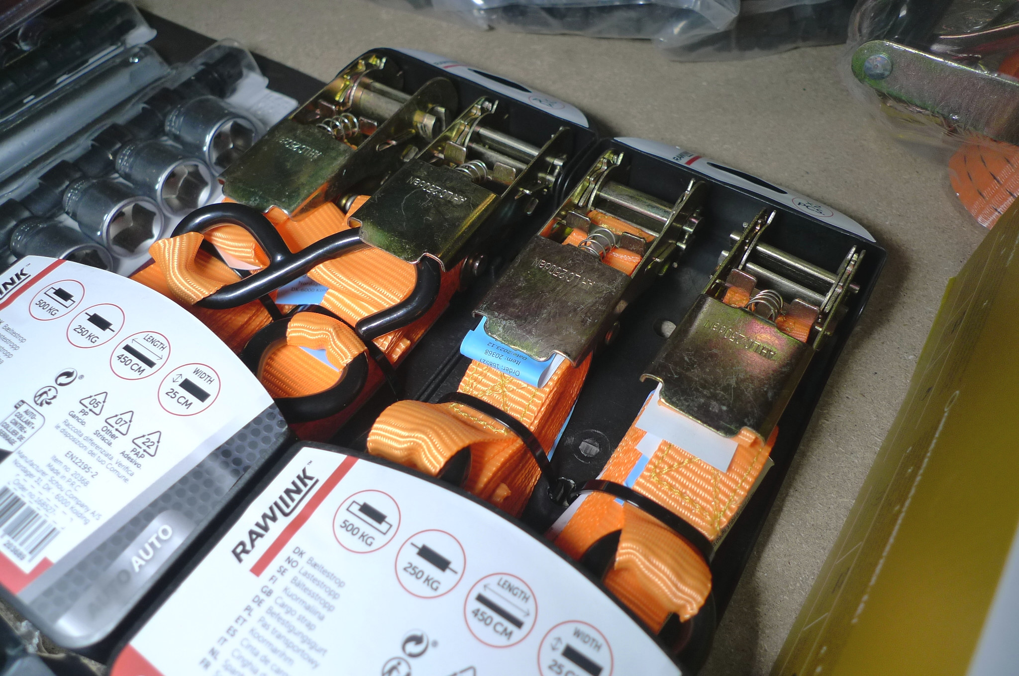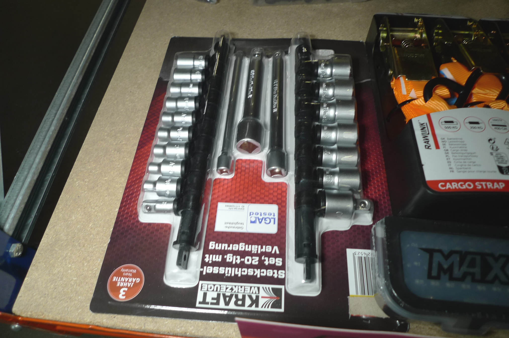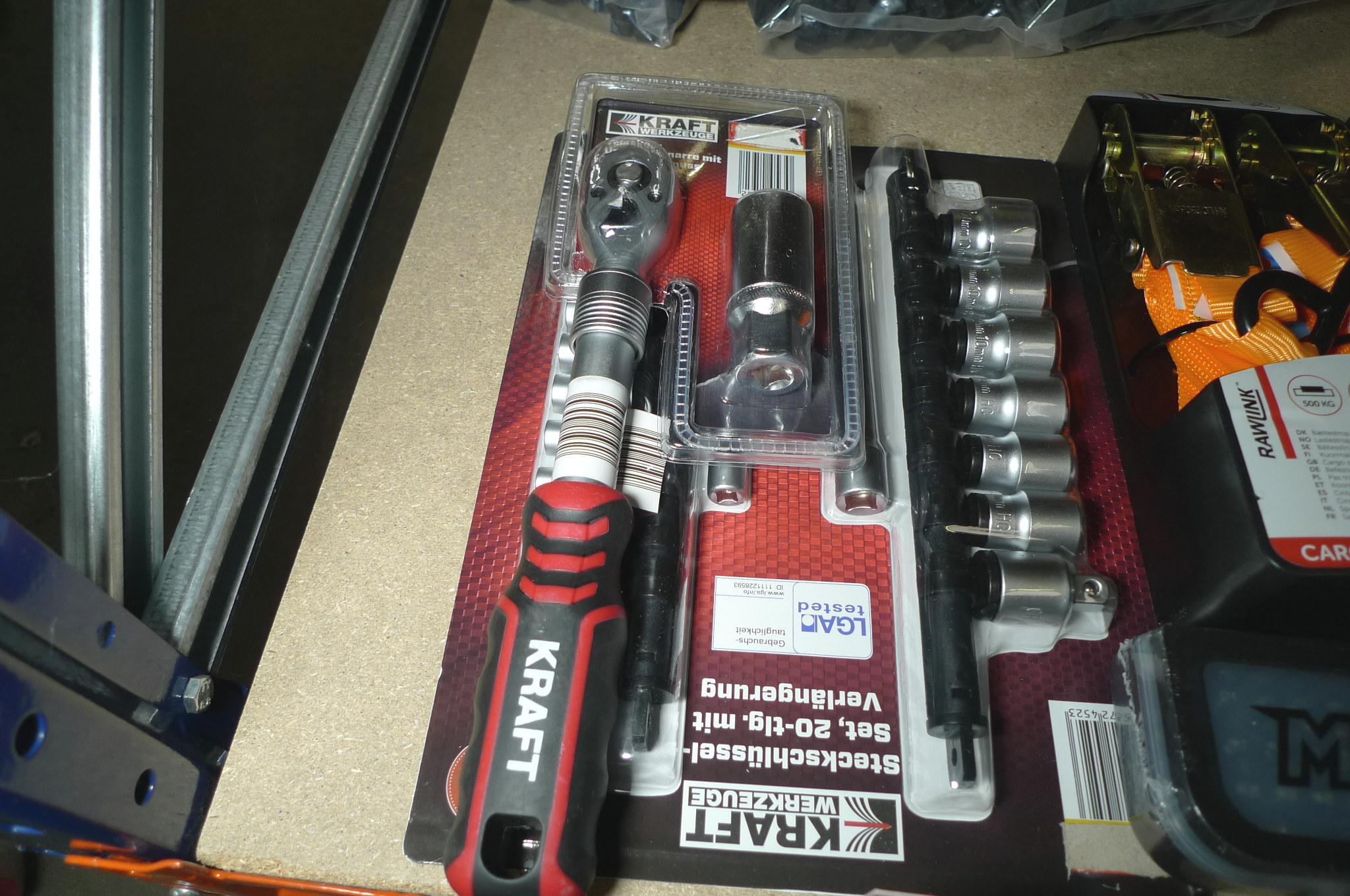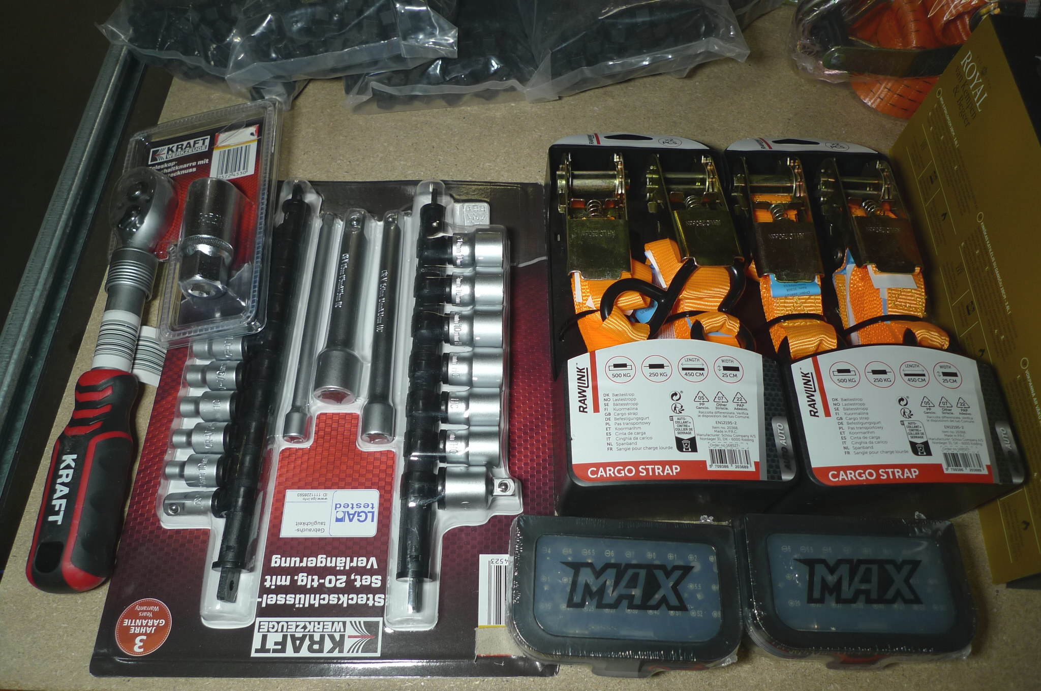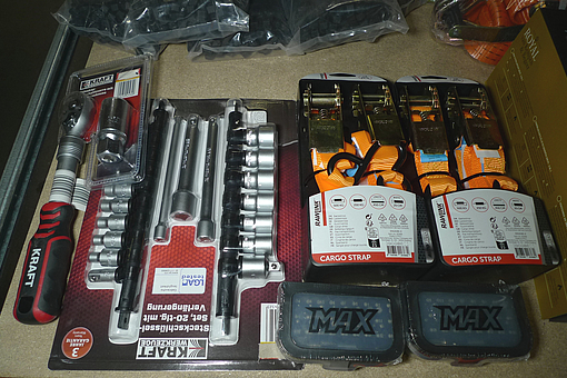 Div. værktøj. 4 stk. båndstrammere. Skraldenøgle m/multitop. 20 dele toppesæt og 2 stk. MAX bitssæt. Ubrugt.